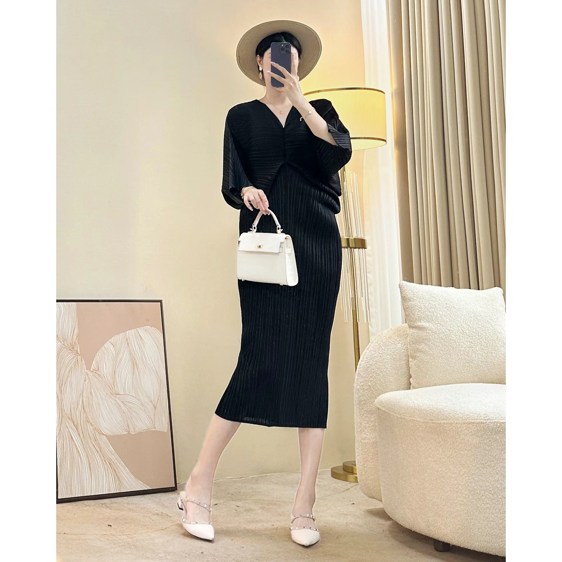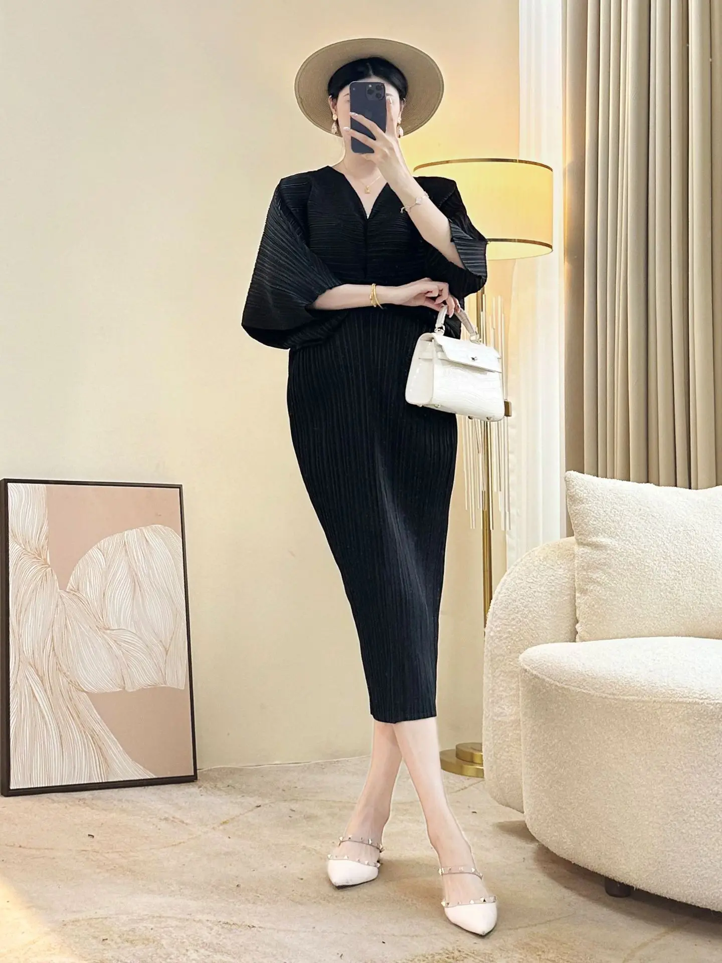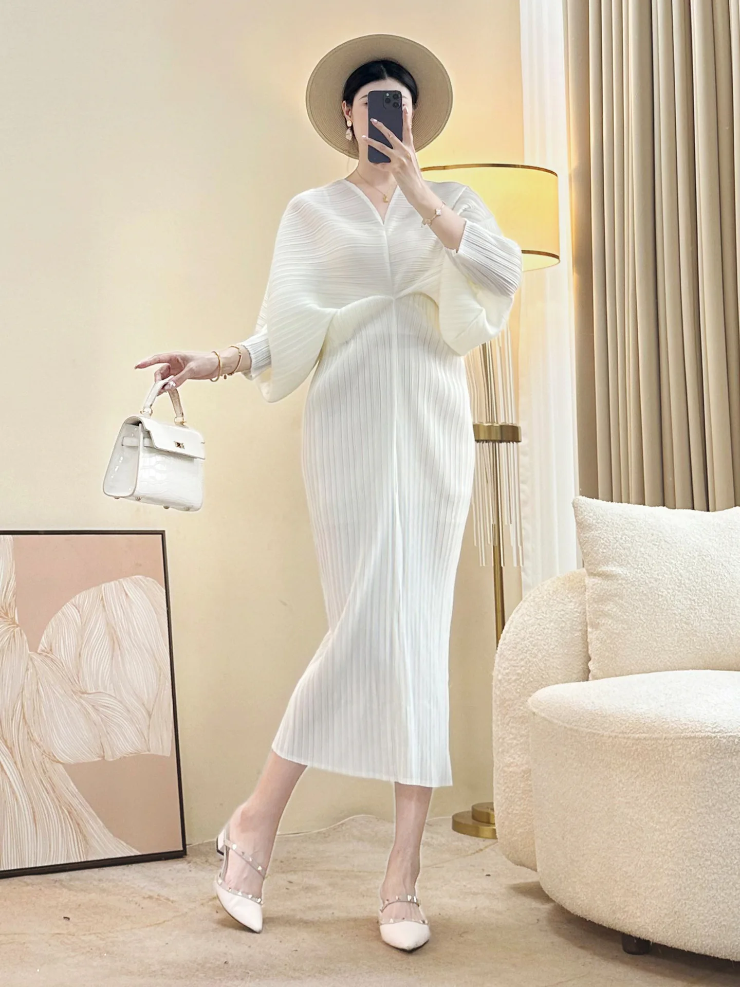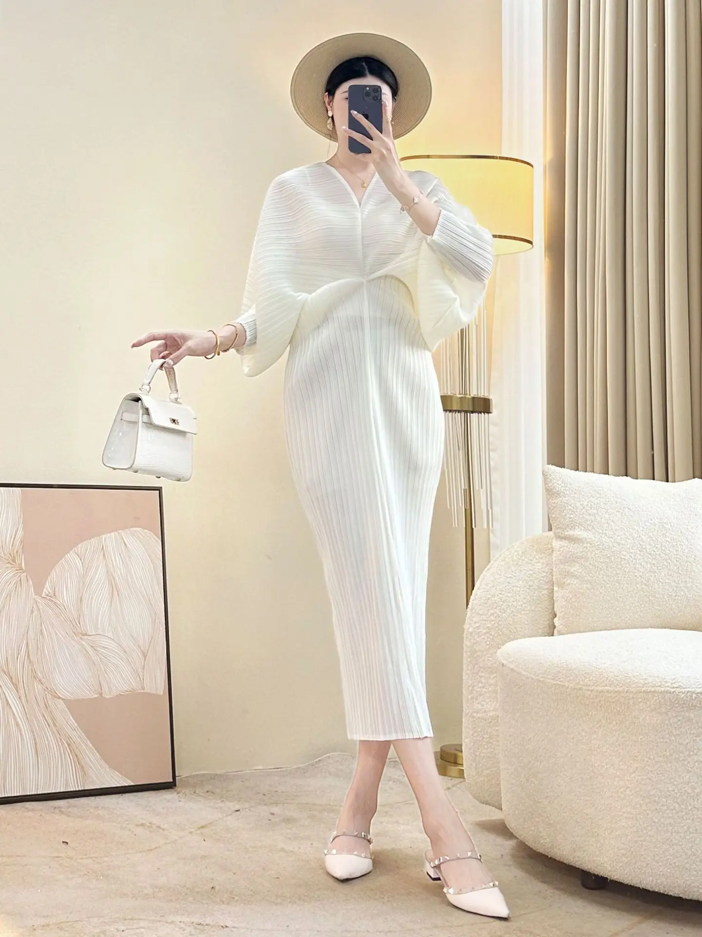 Elegant Miyake Pleated Midi Dress Batwing Sleeve Loose Fit Minimalist Chic Style Women's Dress