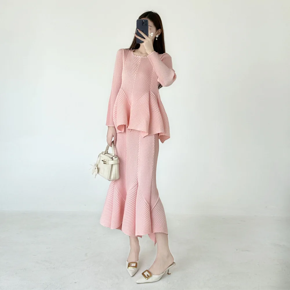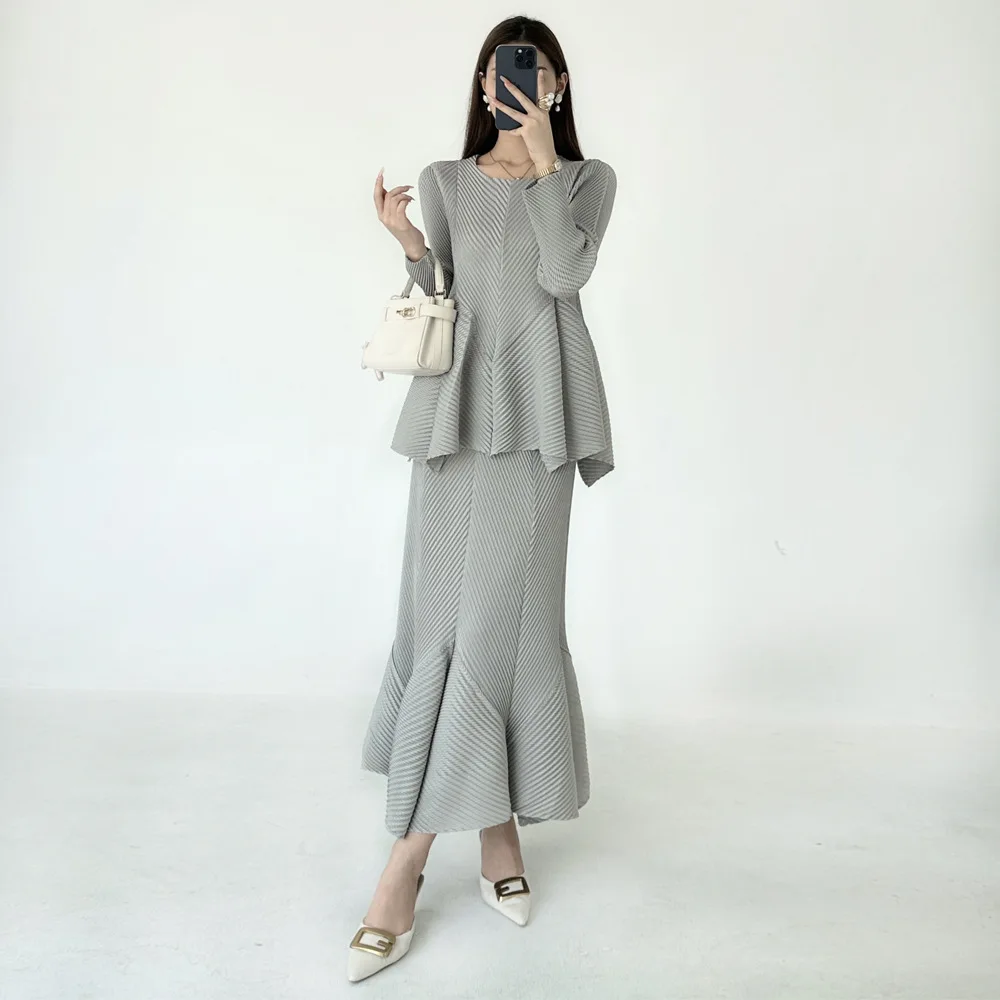 Latest Design Miyake Pleated Set: Elegant Casual Ruffle Top & Fishtail Skirt Women's Set