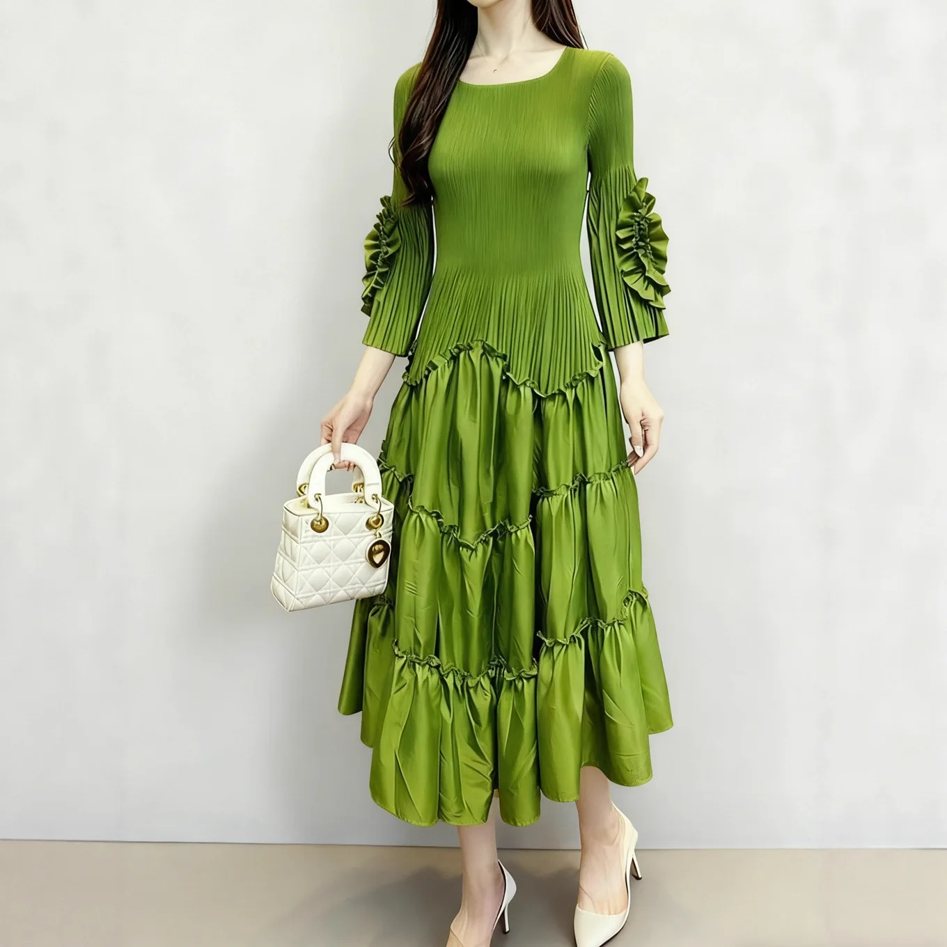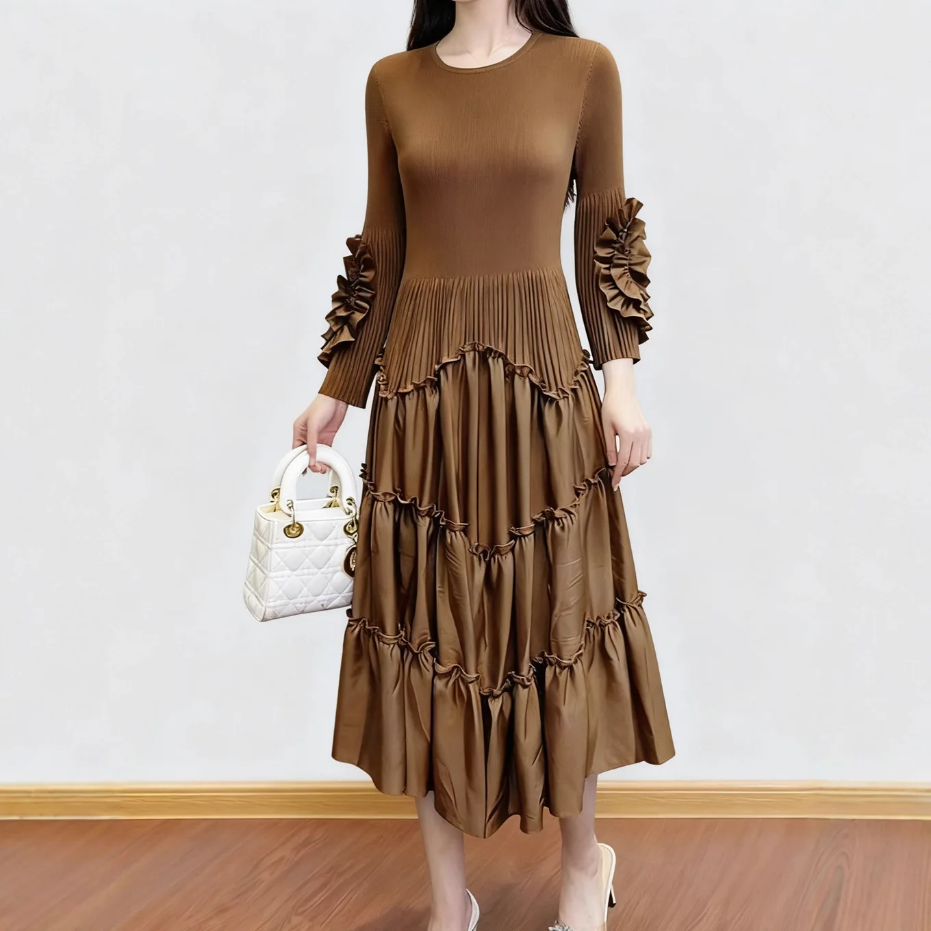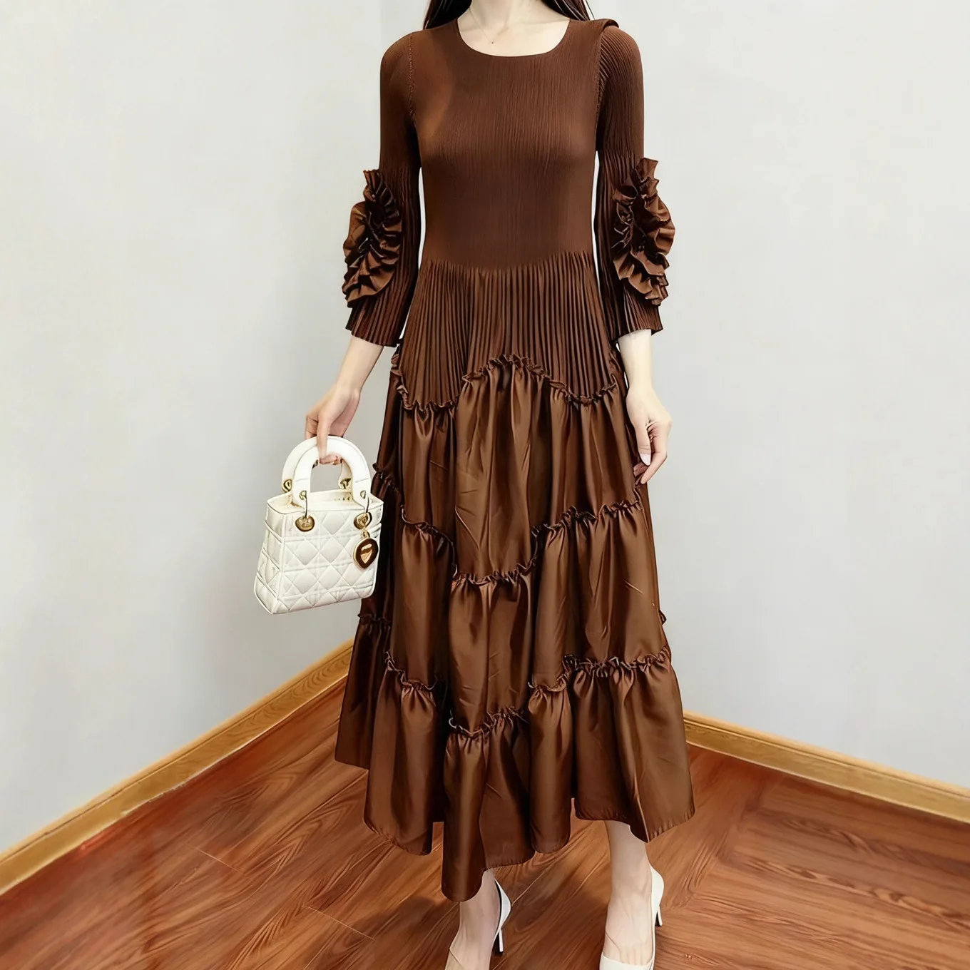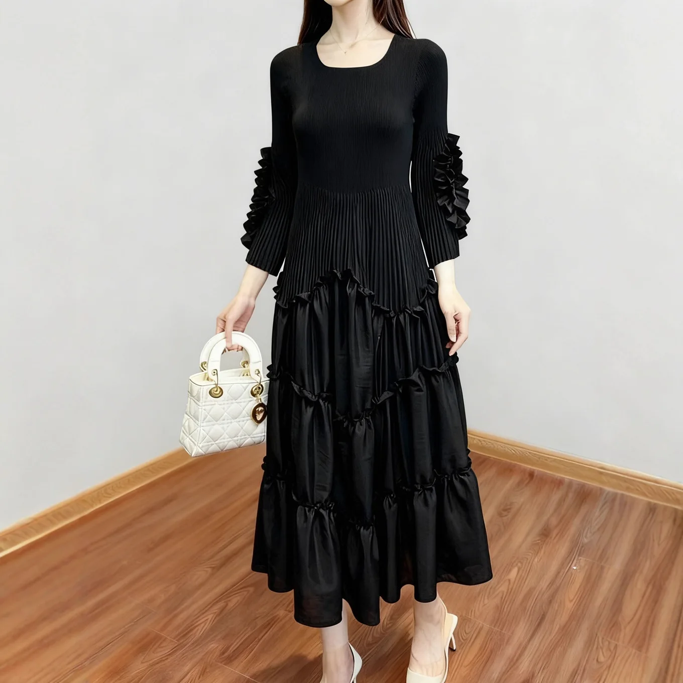 European and American Style Women's Fashion Dress Solid Color Casual Dress Miyake Pleated Dress Wholesale Smocked Clothing