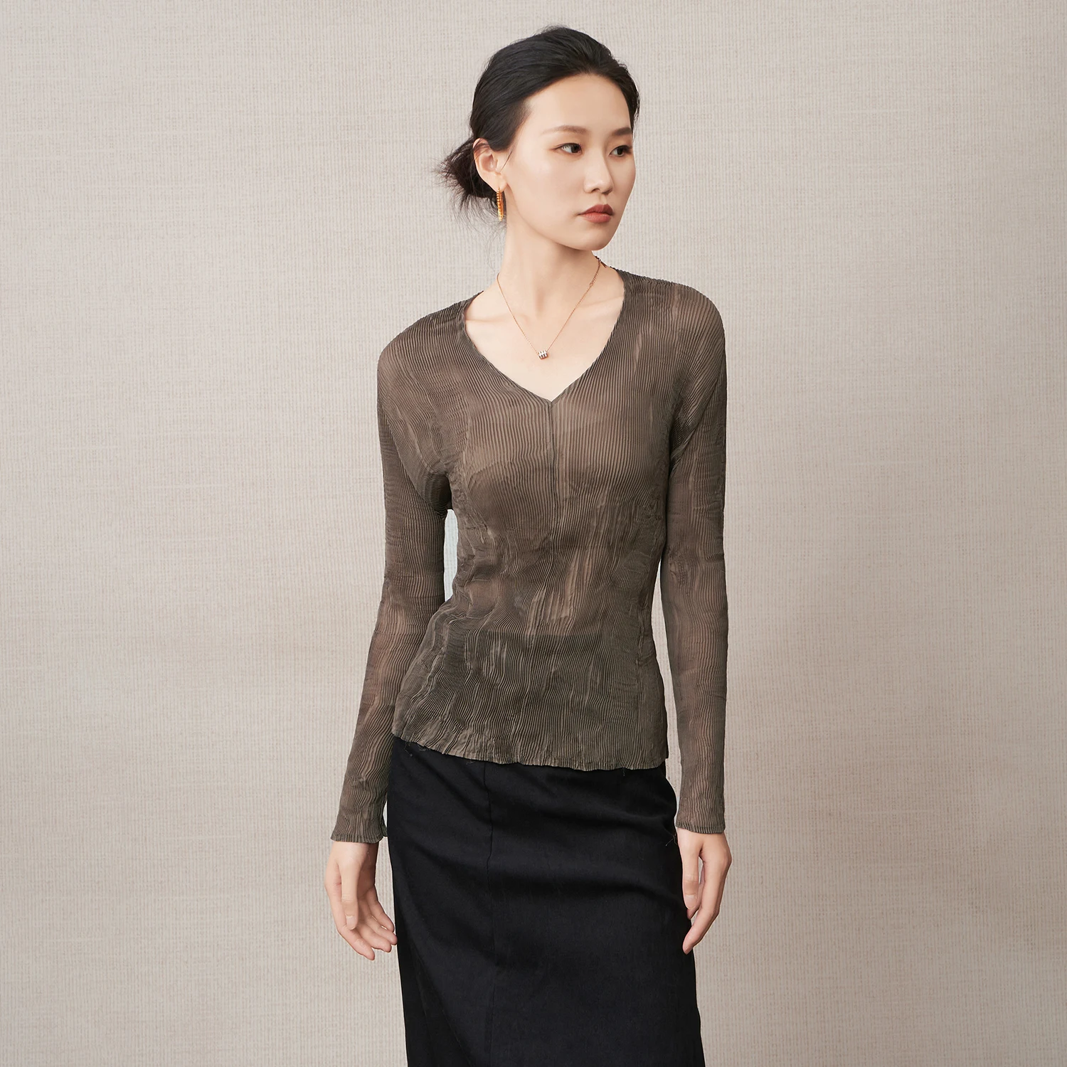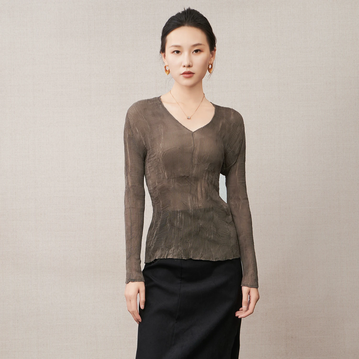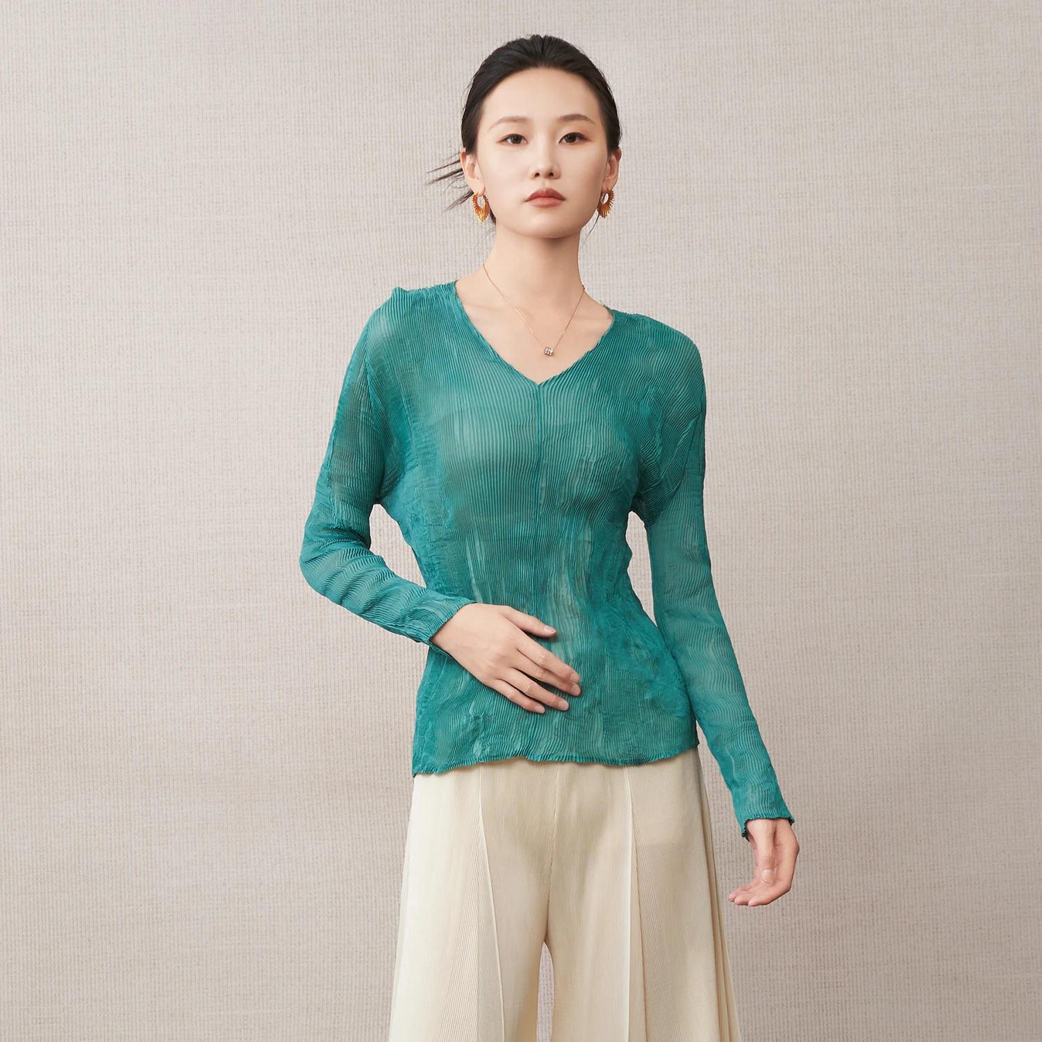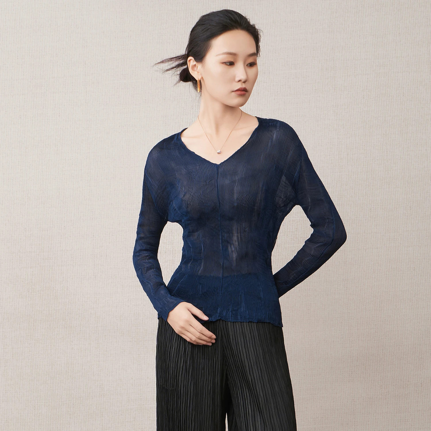 Wholesale Women's Fashion Tops Design Semi-transparent V-neck Casual Top Chiffon Stretch Pleated Shirts by Miyake