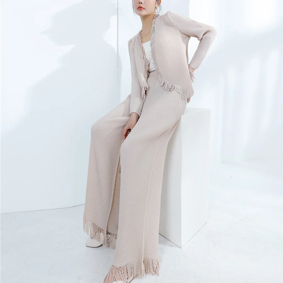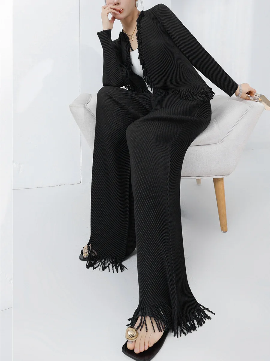 Fast Shipping Women's Fashion 2-Piece Set Stretch Casual Tassel Top and Wide-Leg Pants Set Miyake Pleated Set