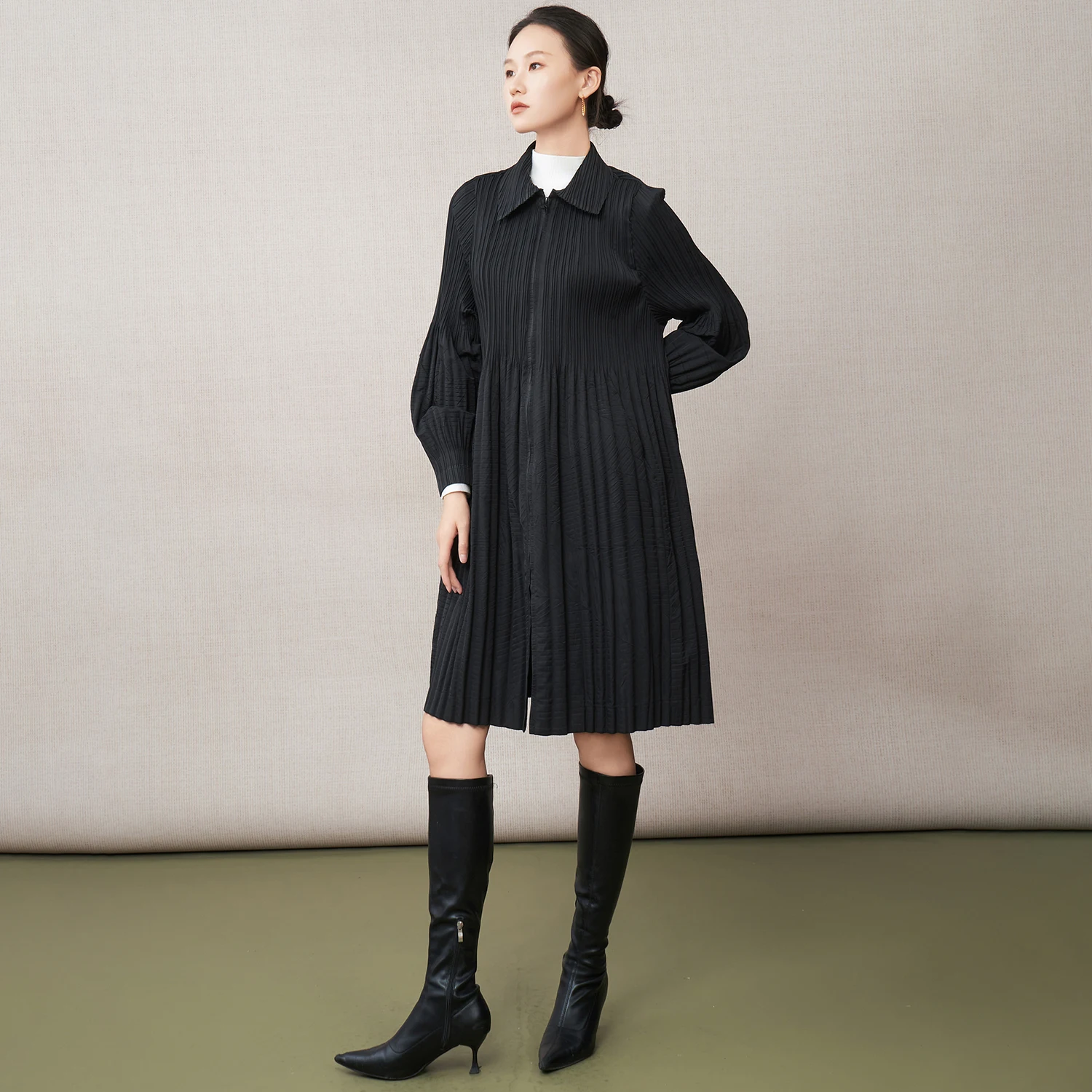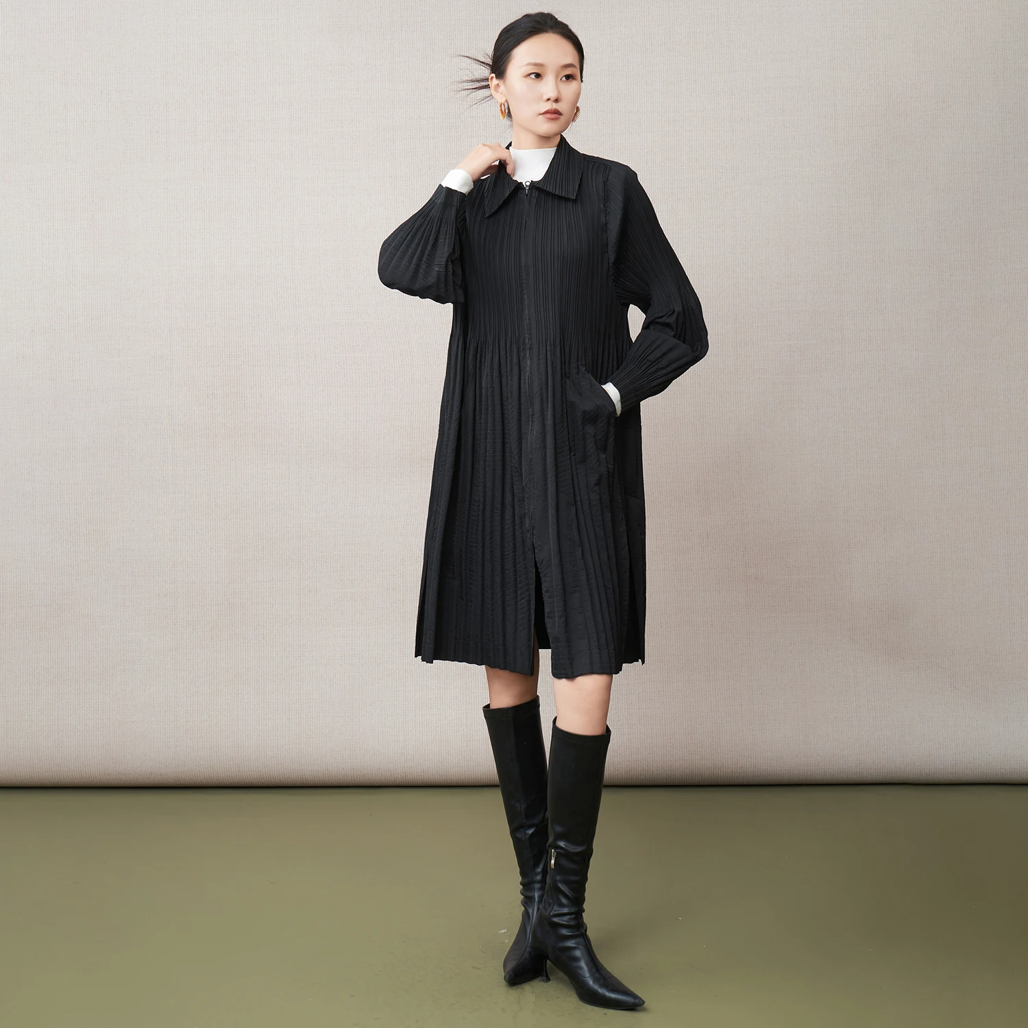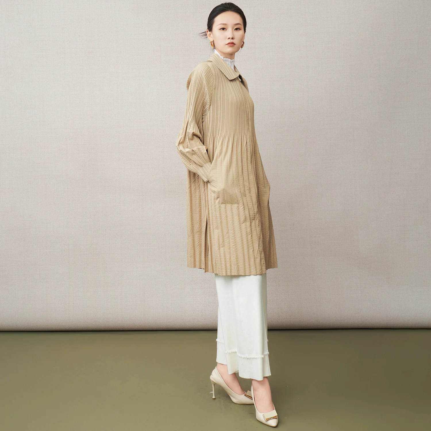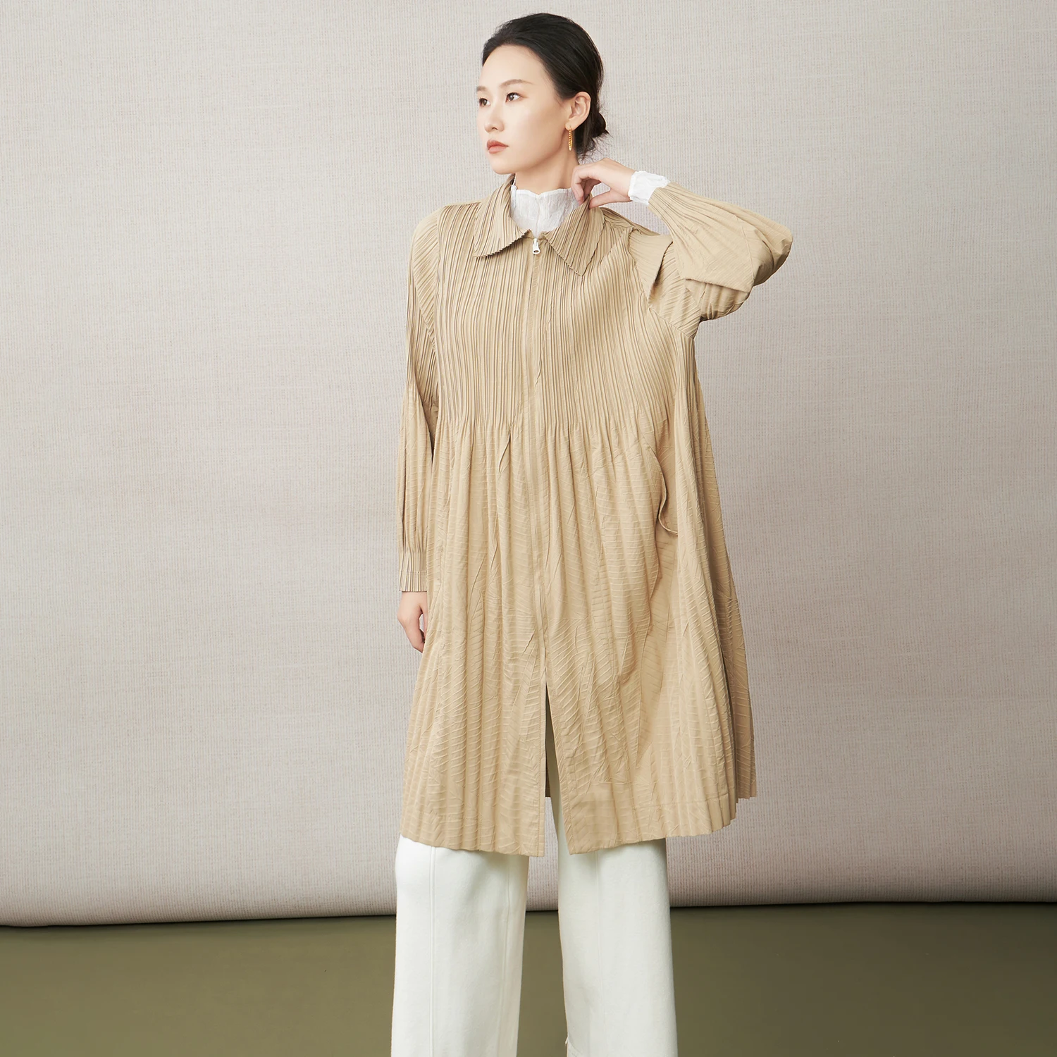 2025 Spring/Autumn New Style Miyake Pleated Trench Coat with Lapel Zipper Loose Fit Mid-Length Casual Jacket for Women