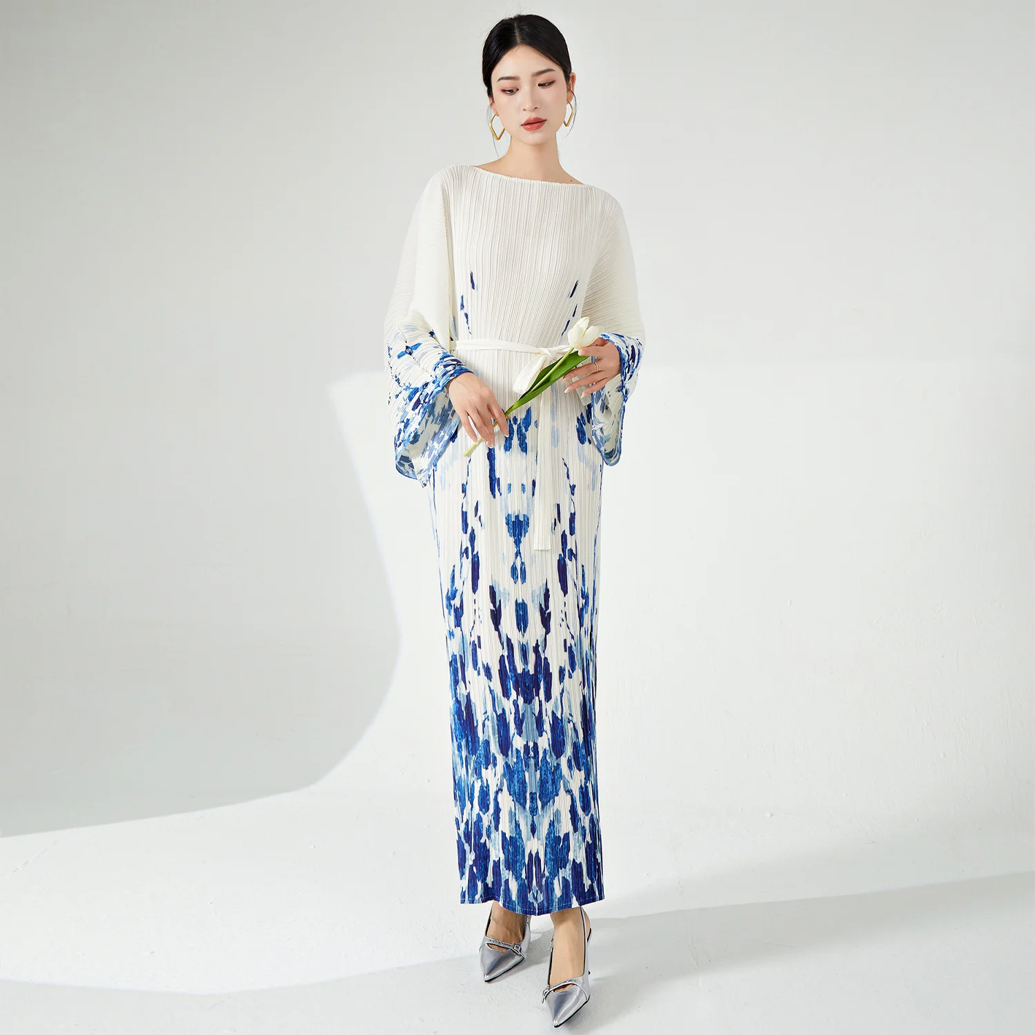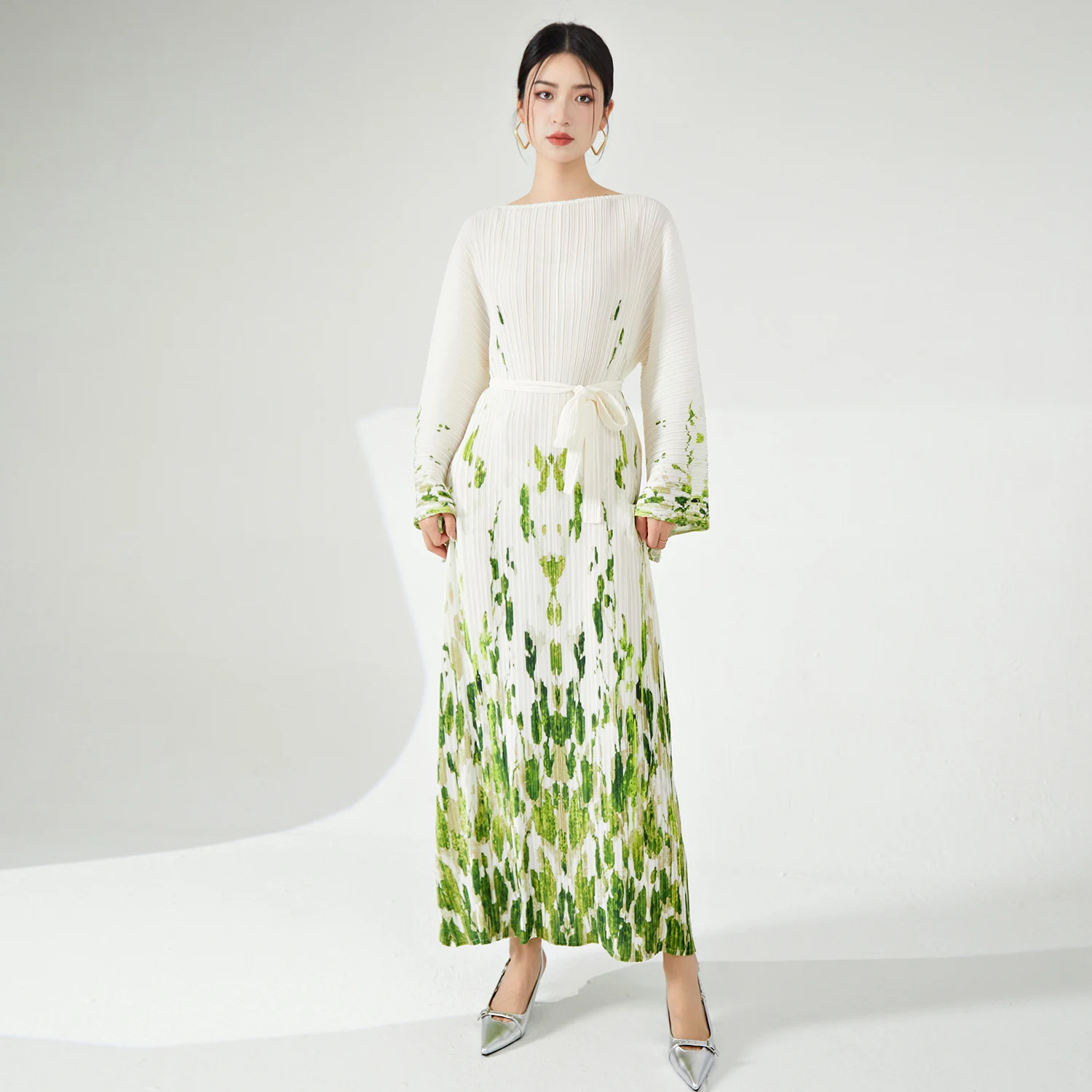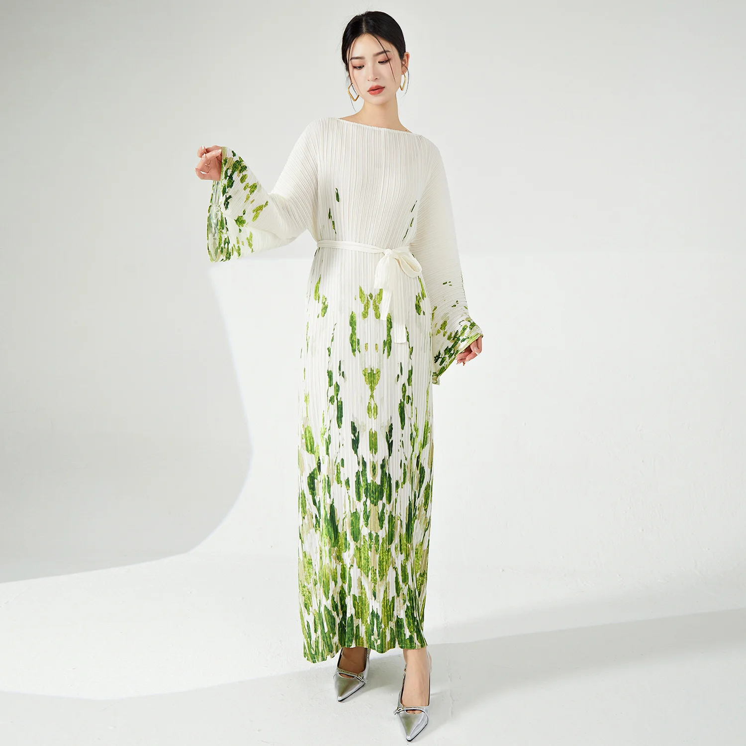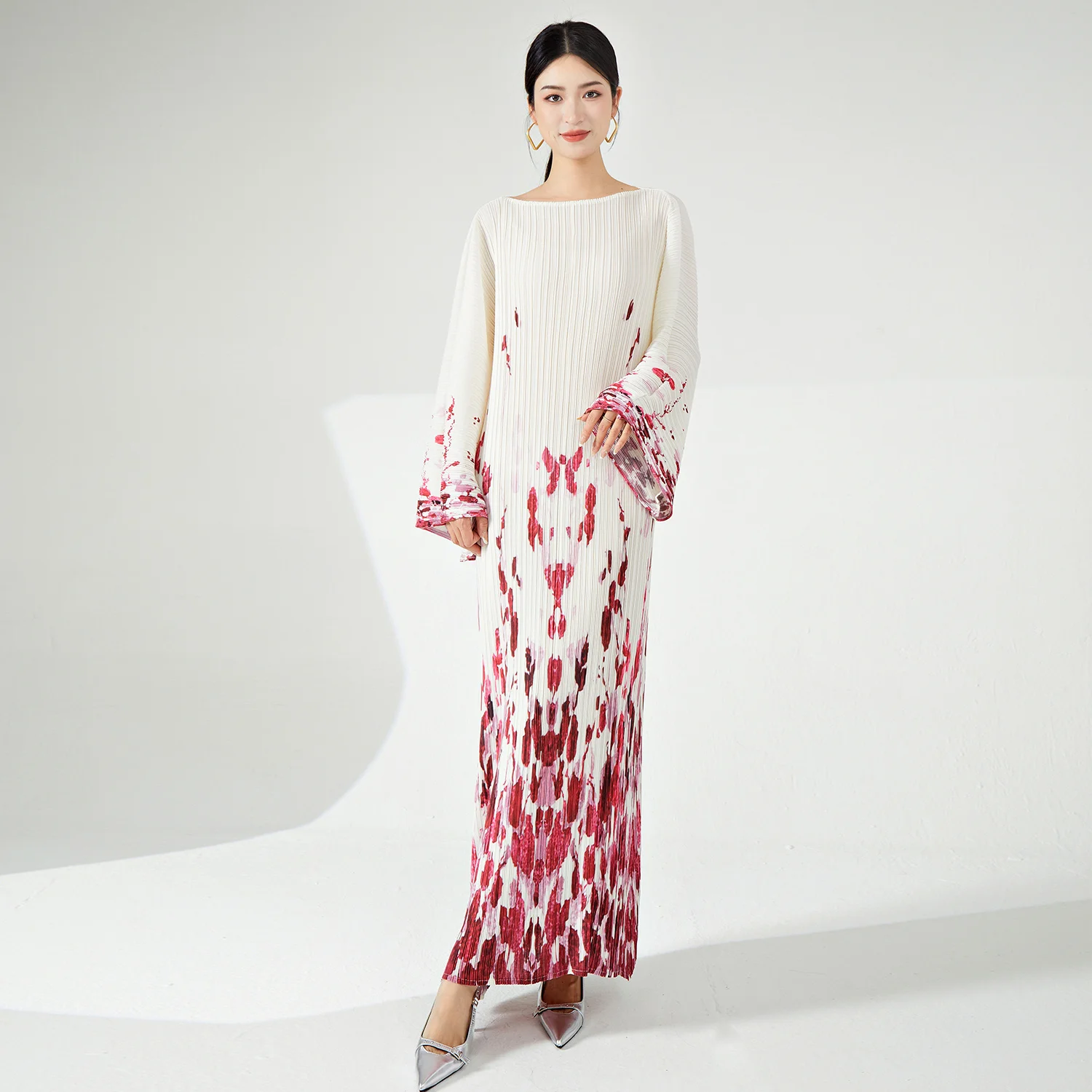 Miyake Women's Summer Dress High Quality Fashion Pleated Printed Gradient Design With Long Bat Sleeve Loose Fabric Weaving