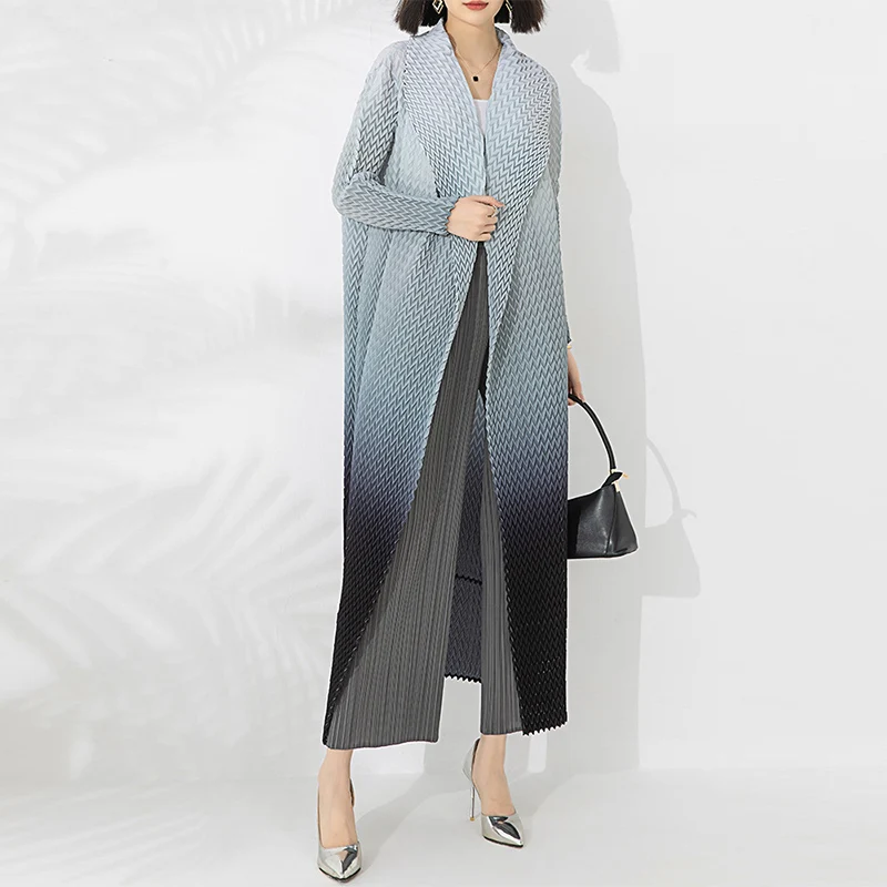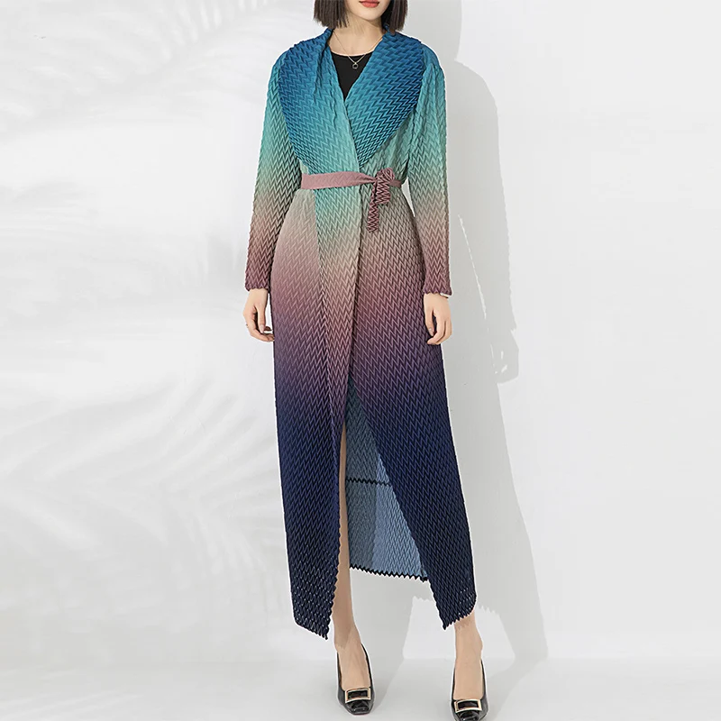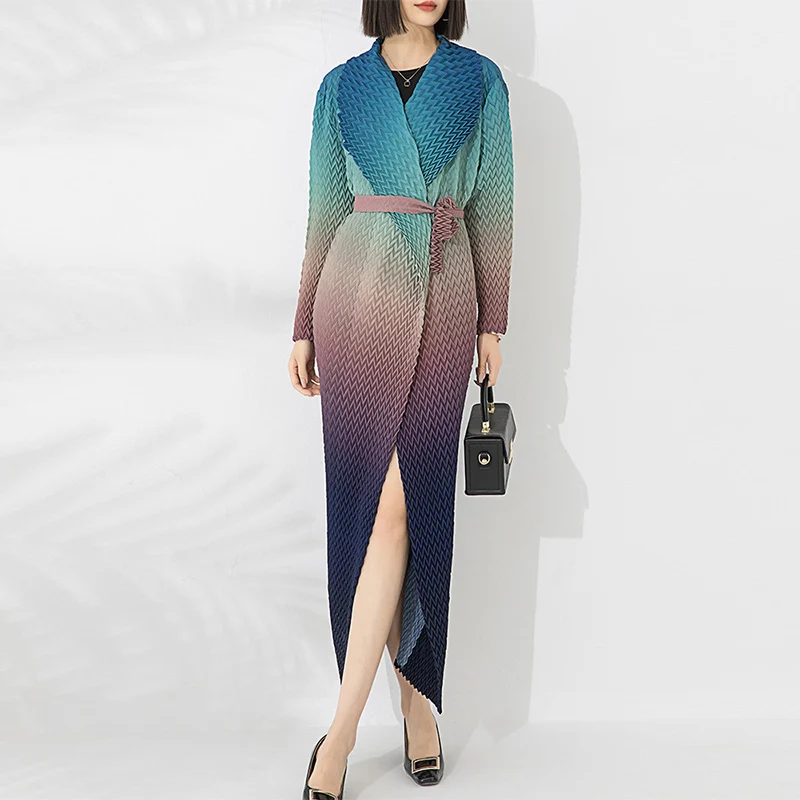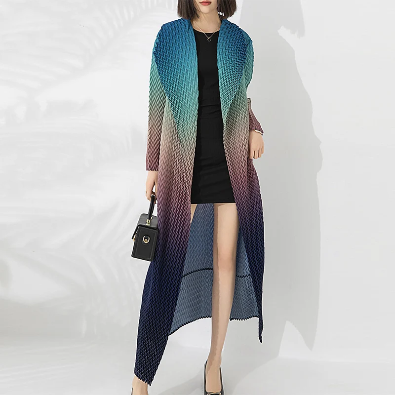 2025 Miyake Exquisite Casual Long Dress Gradient Color Fish-Scale Open Abaya Kaftan Robes V-Neck Mid East Lady Pleated Coat