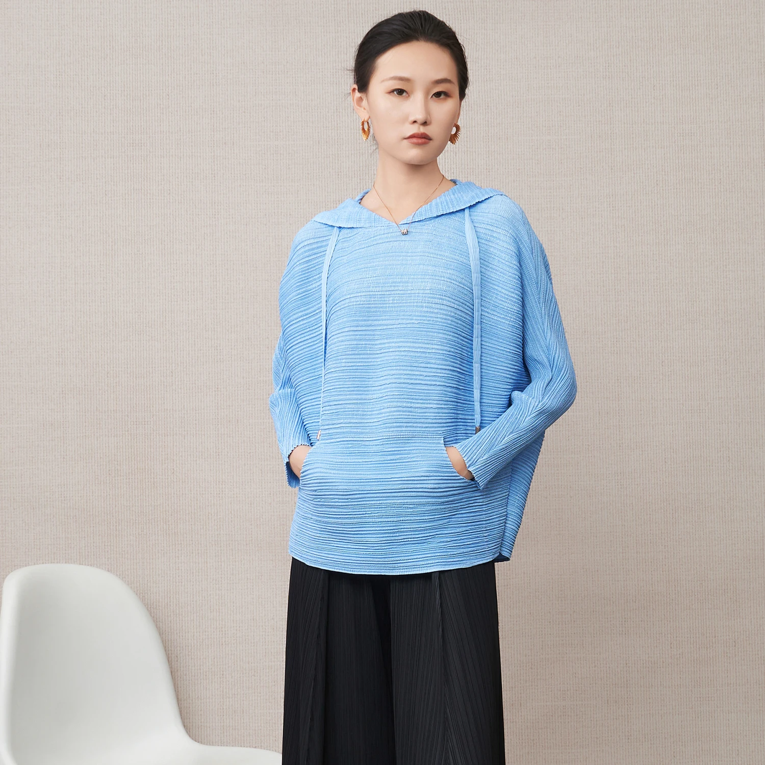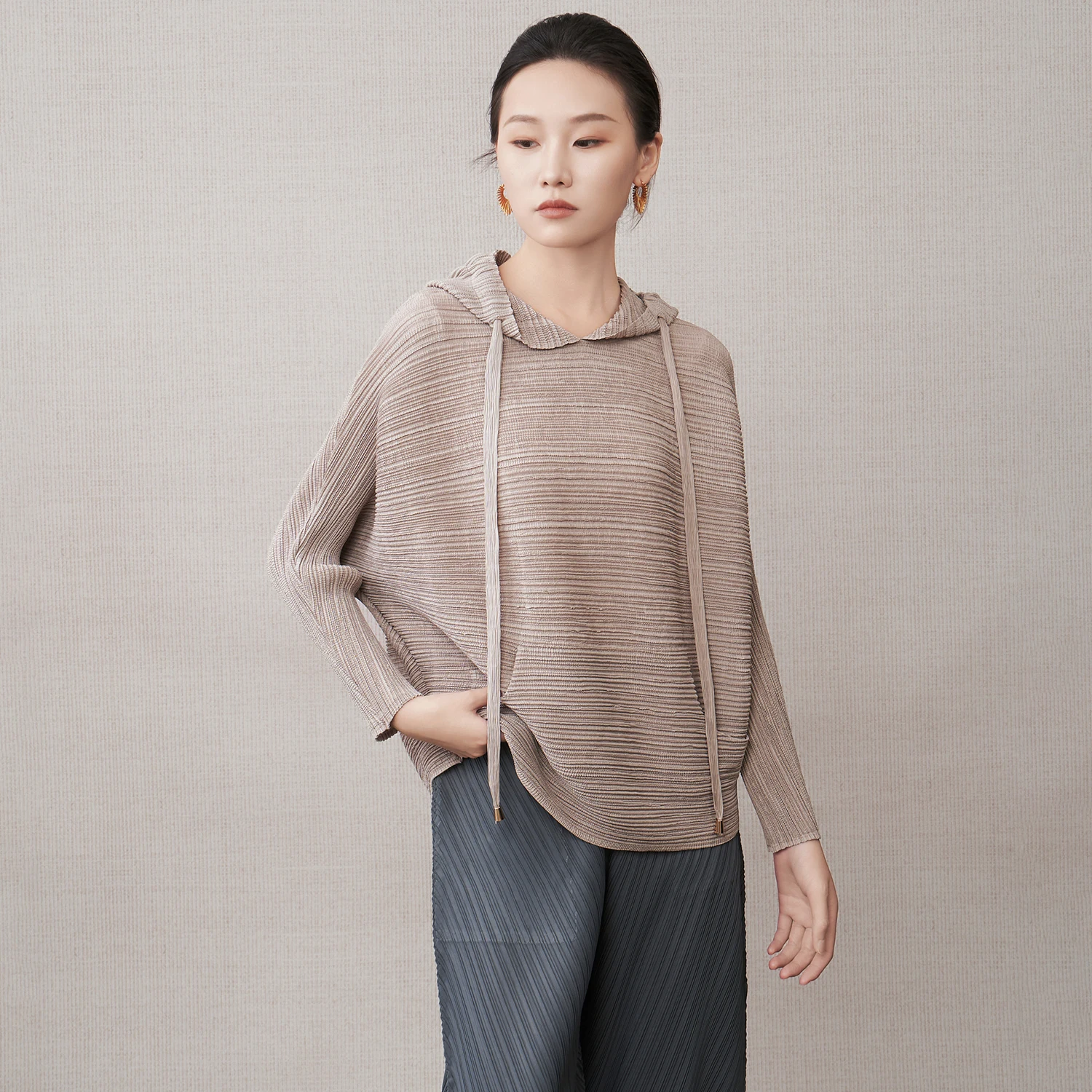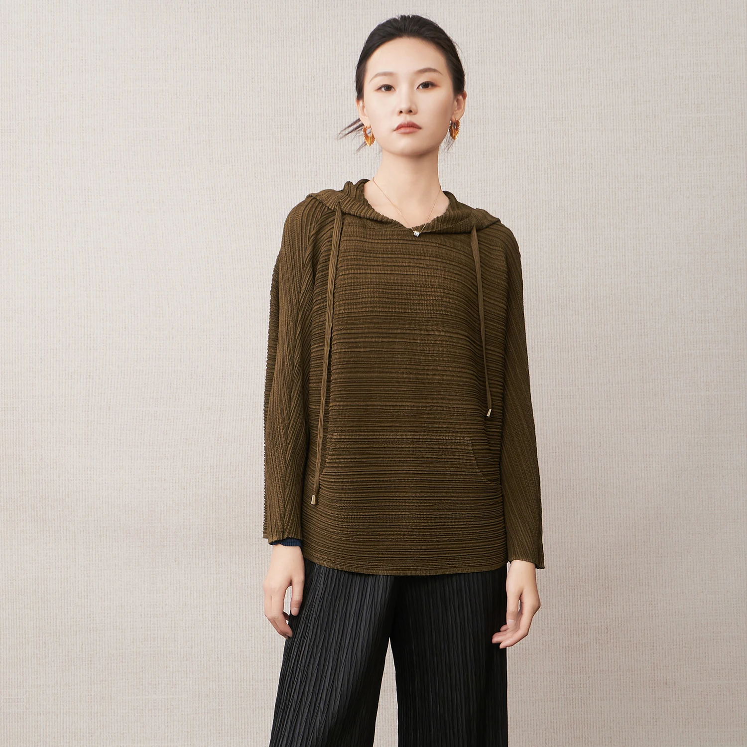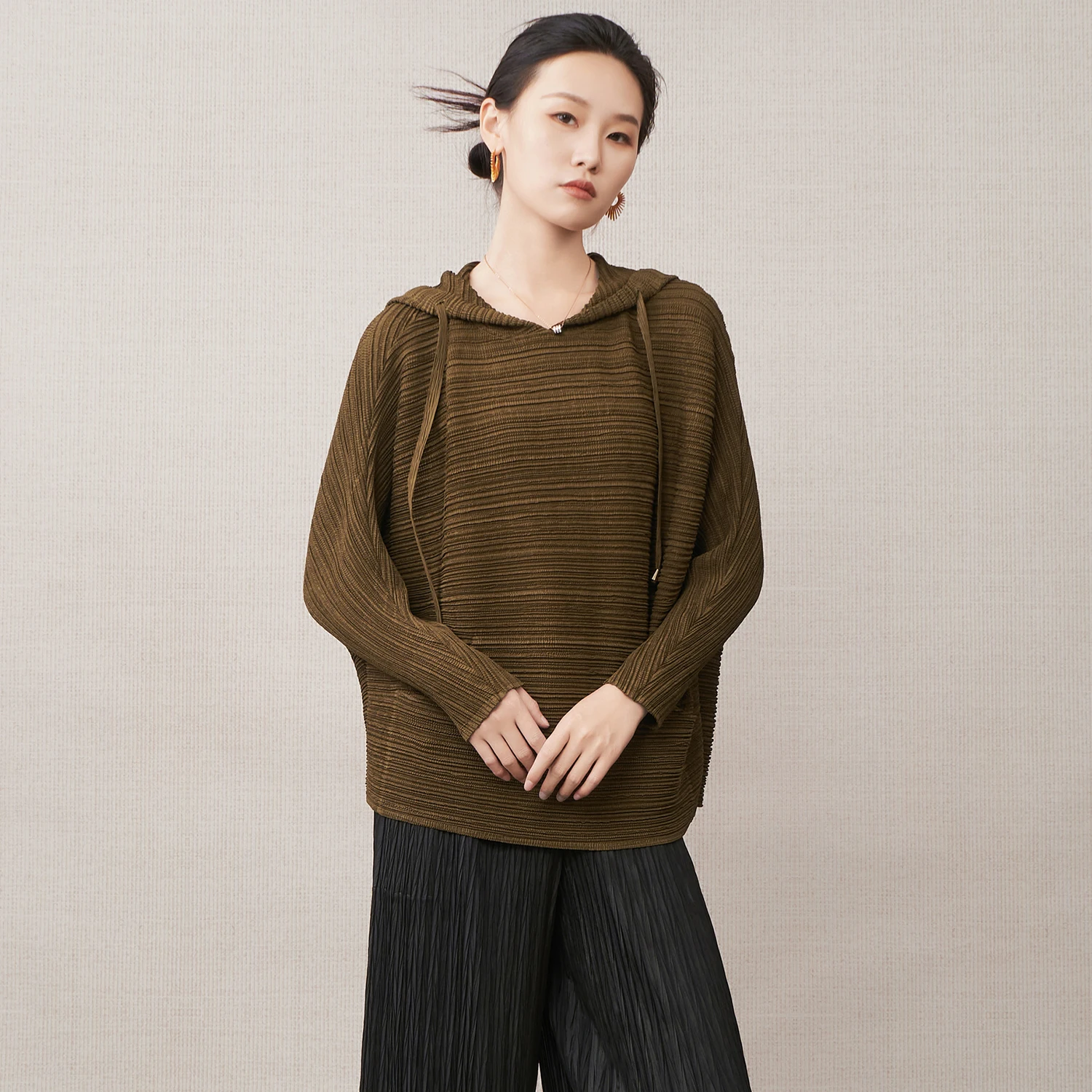 Grace in Every Fold Women's Hoodie Top Loose Casual Long-Sleeve T-Shirt Miyake Pleated Top 2025 Autumn Factory Wholesale
