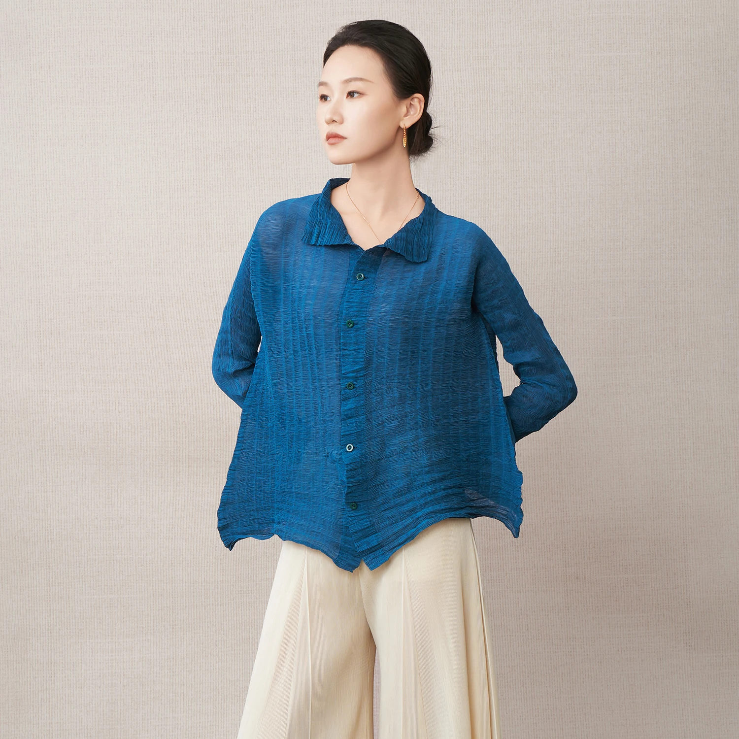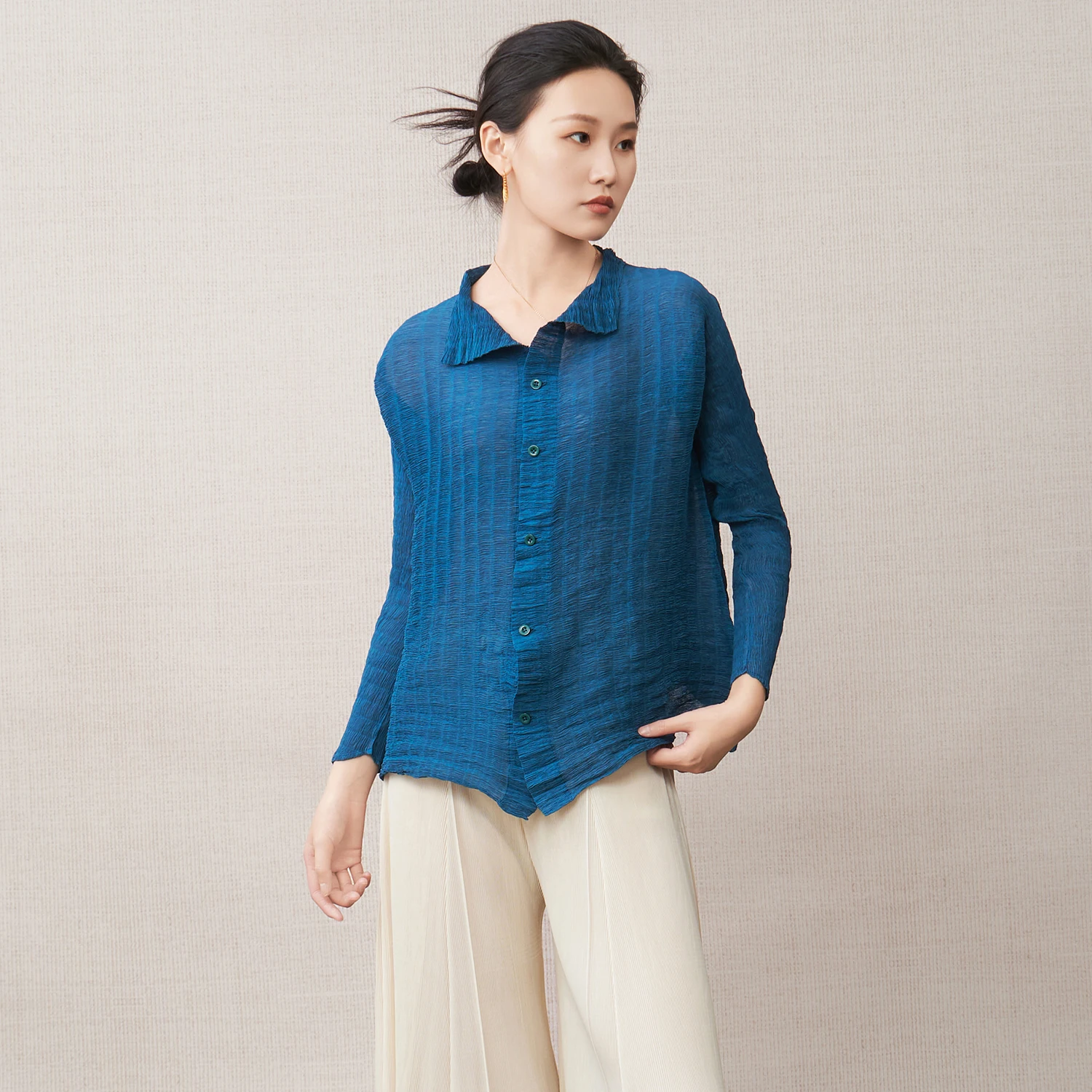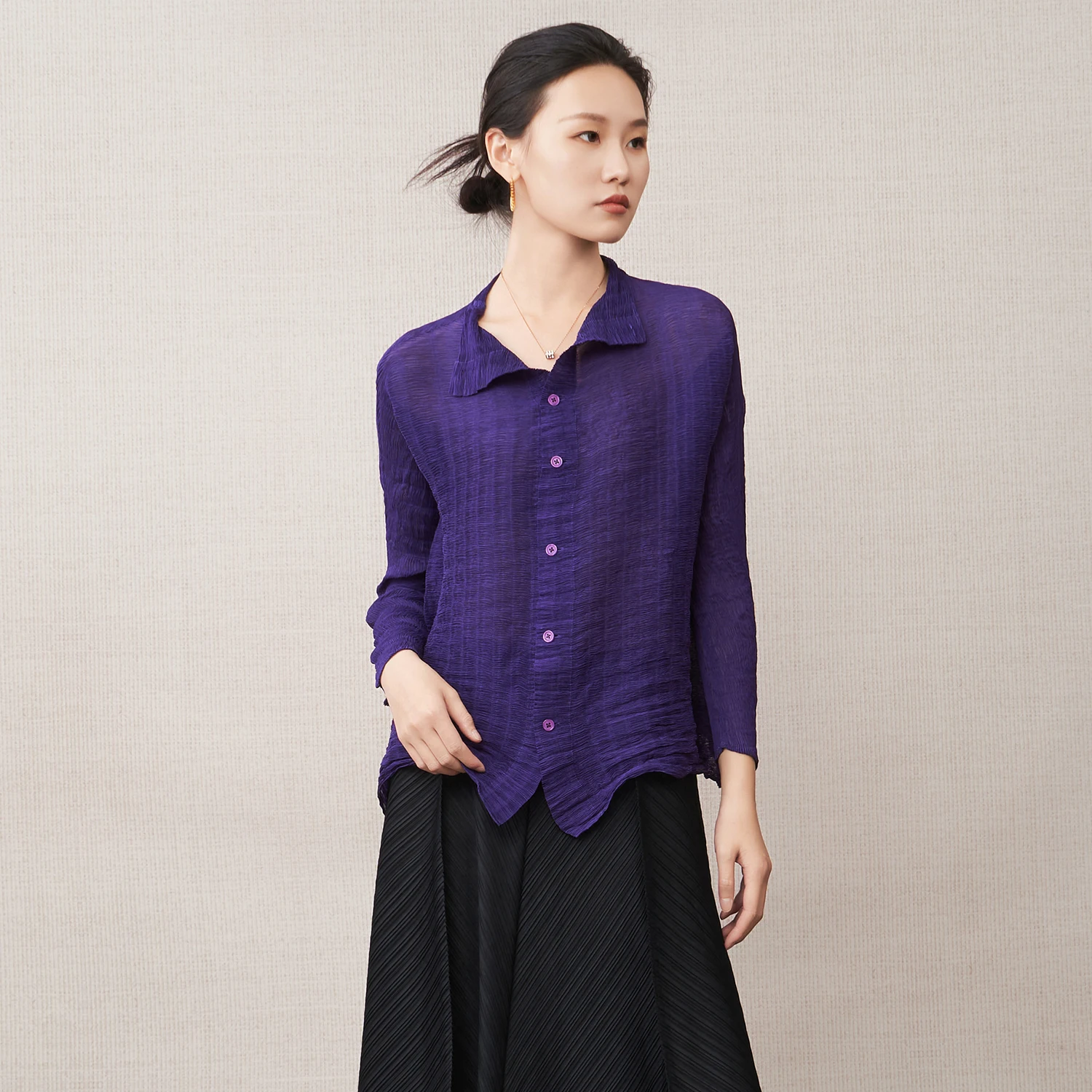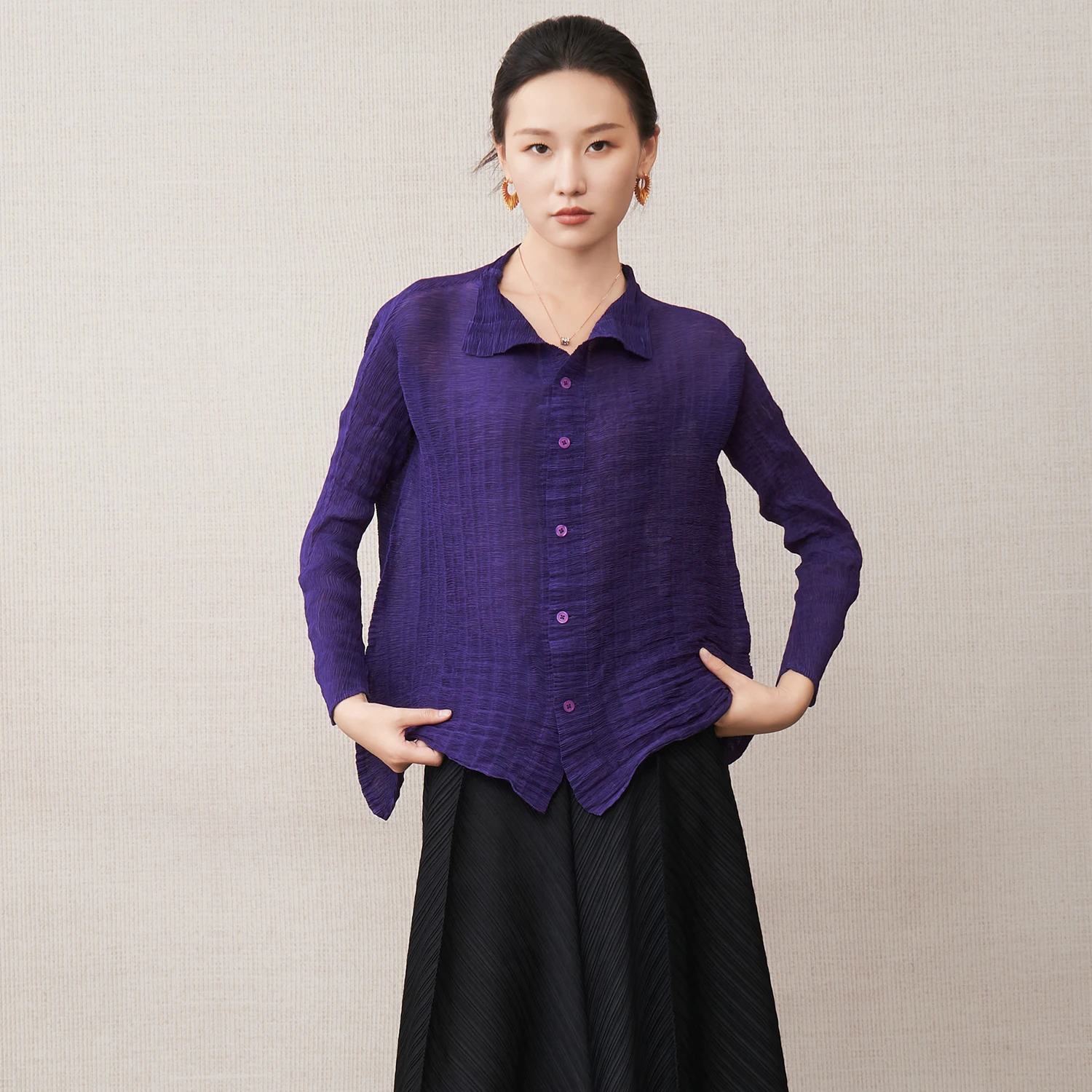 Women's Fashion T-shirts, High-Quality Autumn Elastic Solid Color Tops, Miyake Pleated Shirts, Polyester Fabric Factory