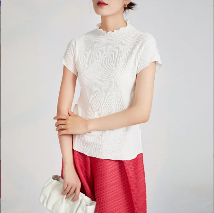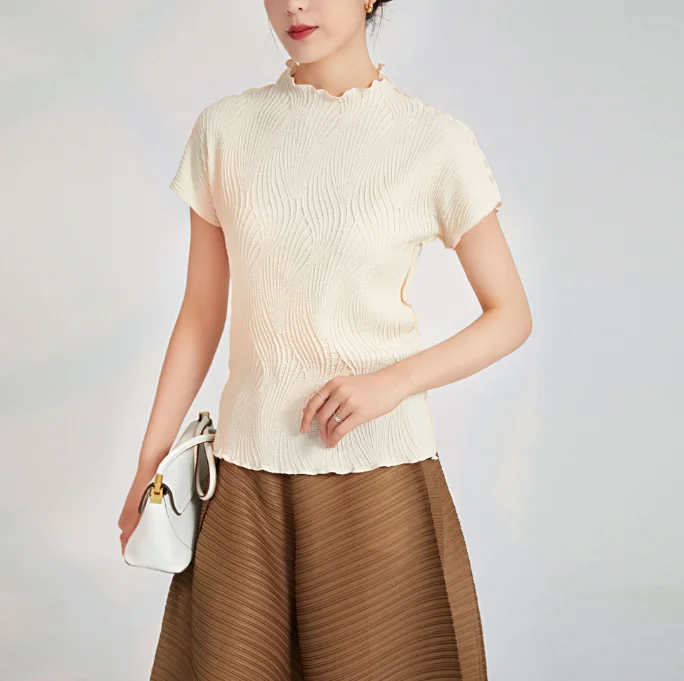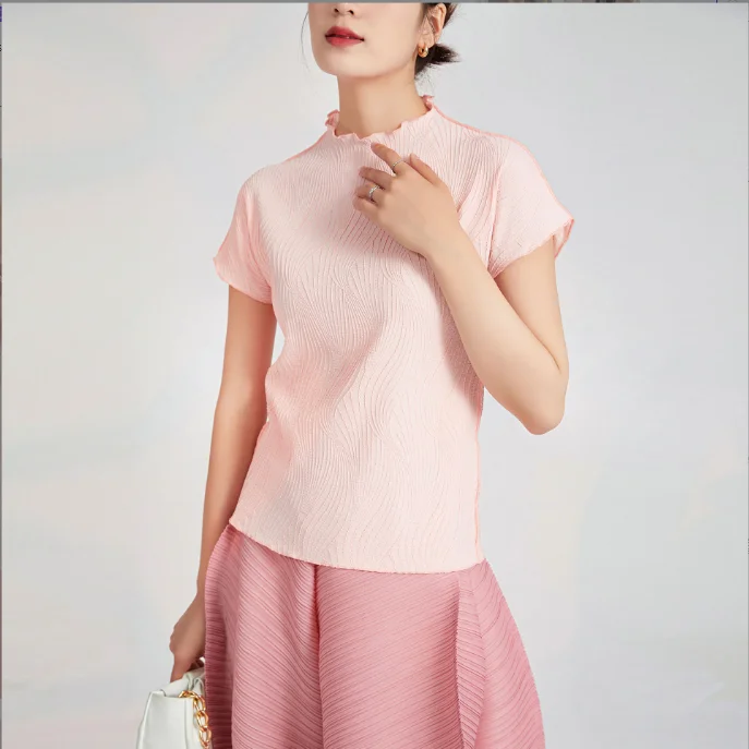 Hot-Selling Casual Short T-Shirt Women Pleated Design Crew Neck Breathable Short-Sleeved Vintage Polyester Summer Top