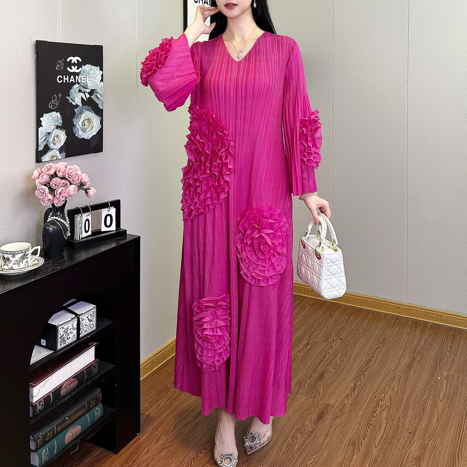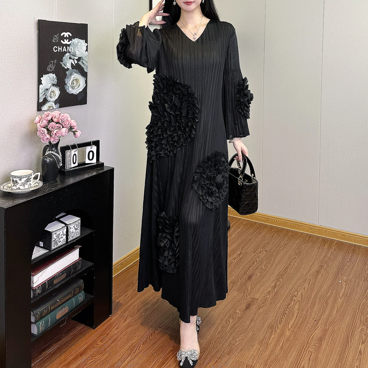 Miyake Pleated Dresses Design Stretch Applique Dress Loose V-neck Dress One Size Polyester Fabric