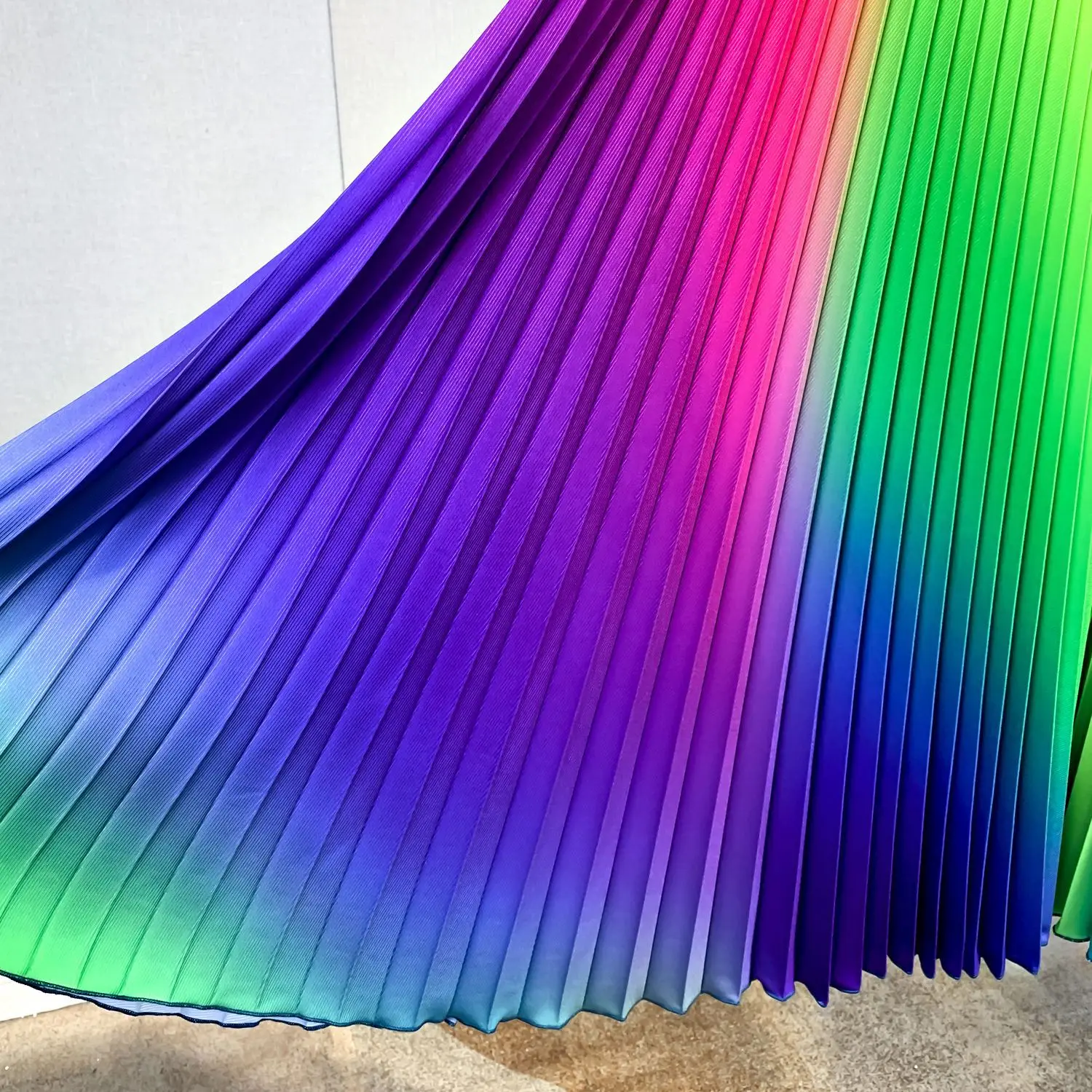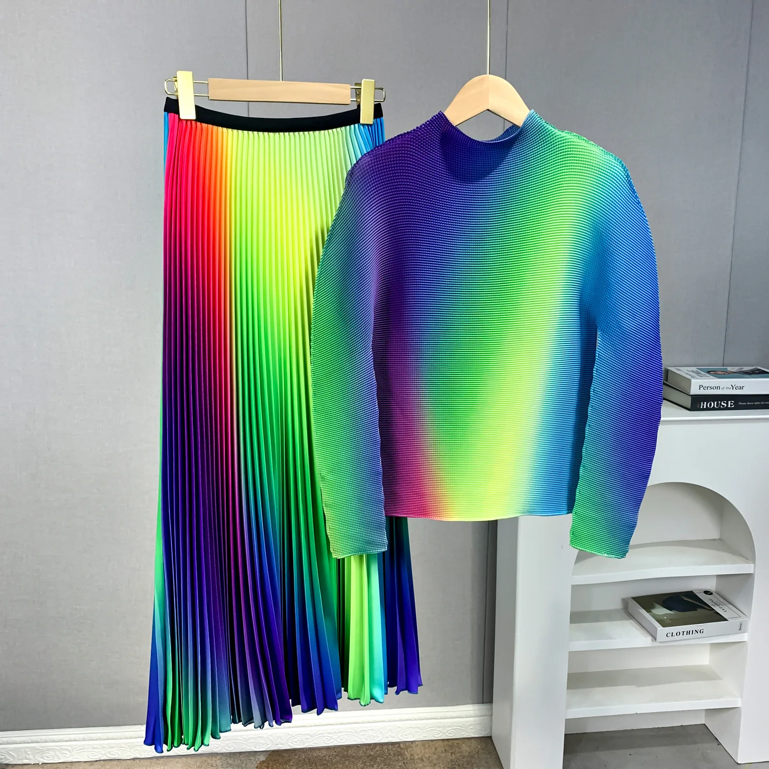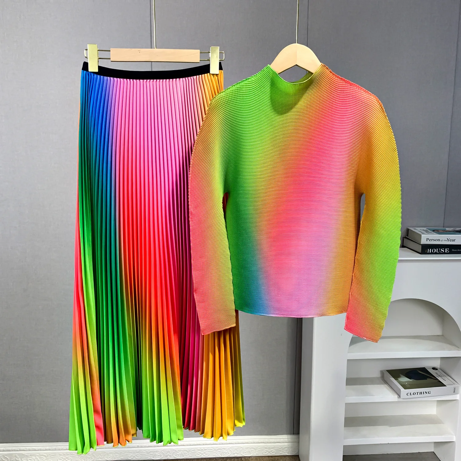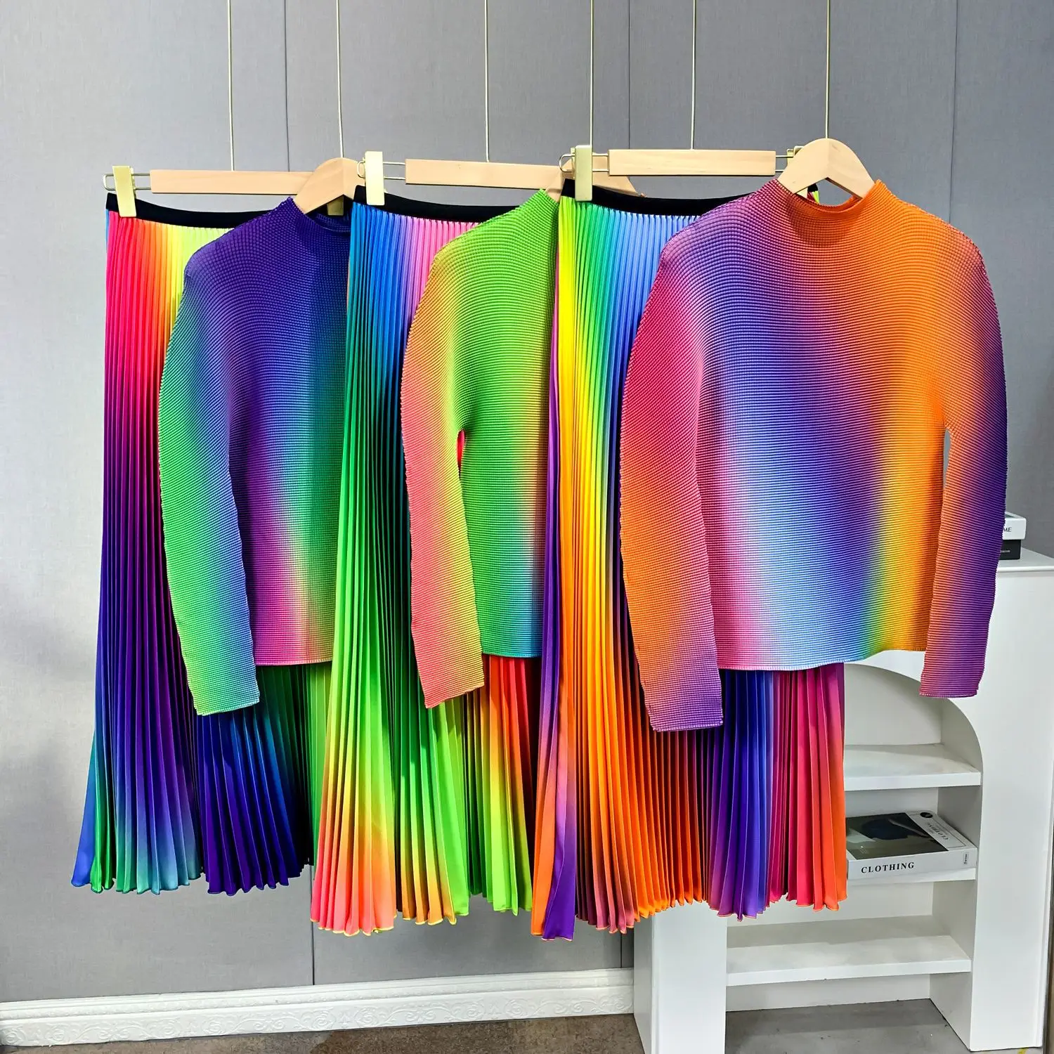 Fast Shipping Premium Quality Miyake Pleated 2-Piece Skirt Set with Stretch Print and Gradient Colors for Women