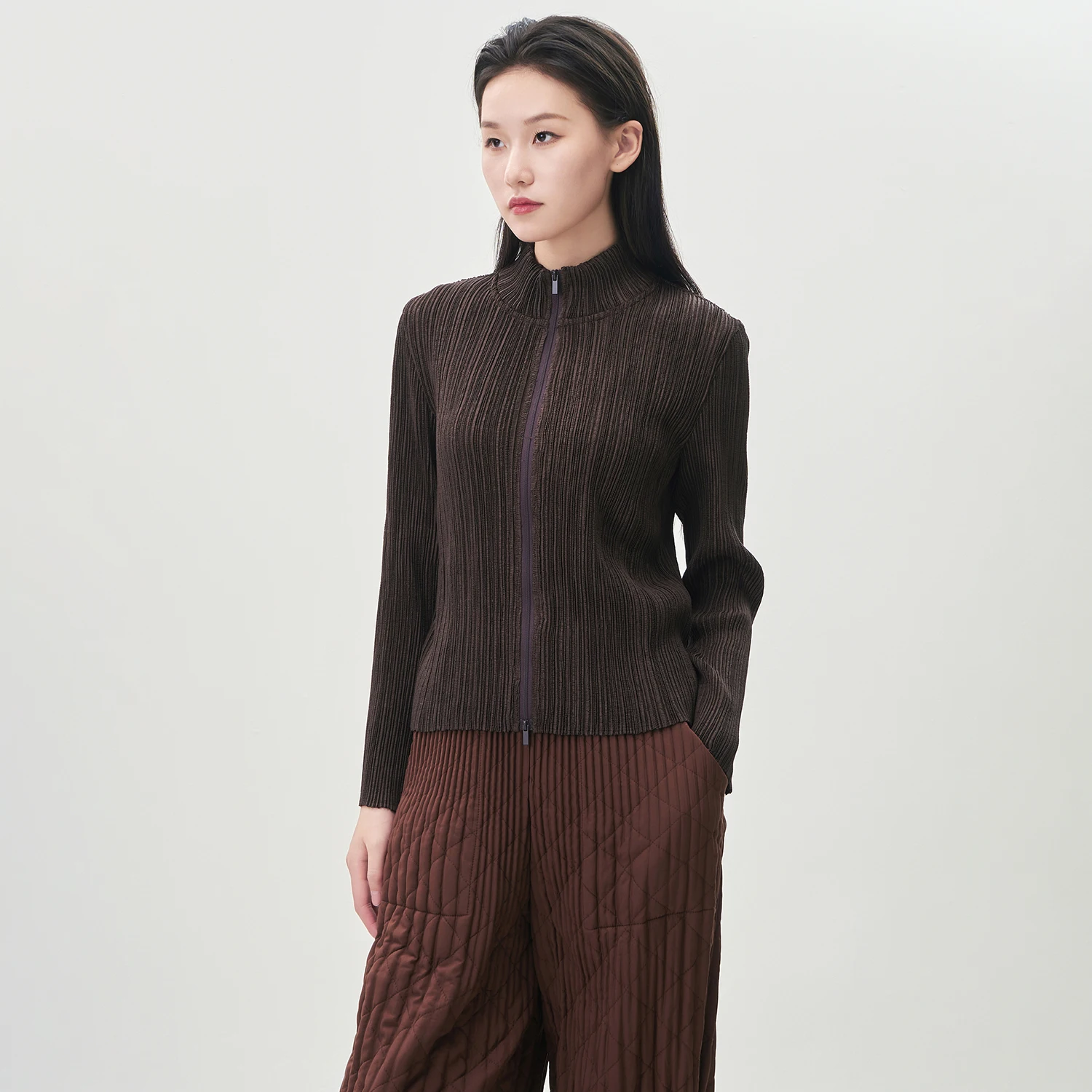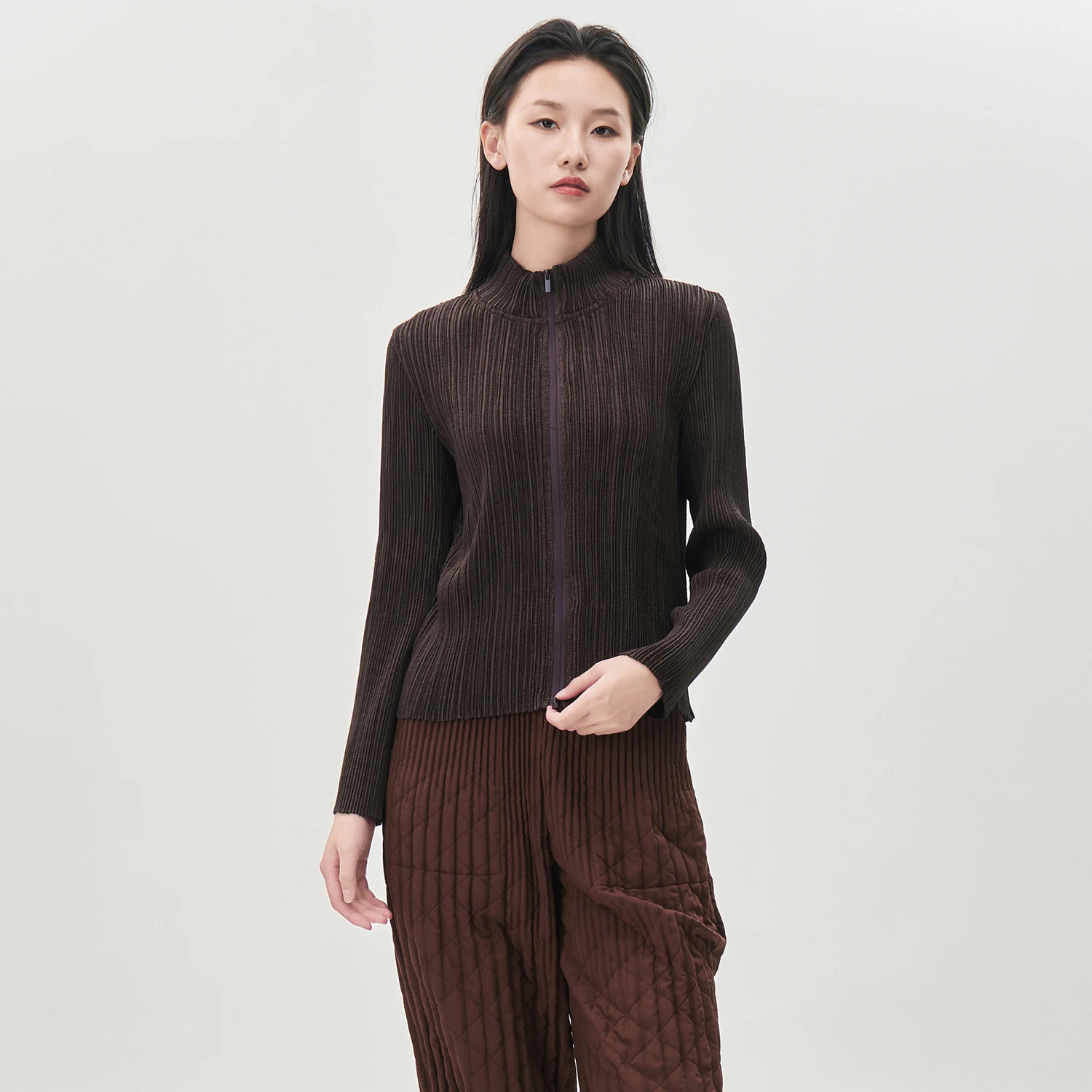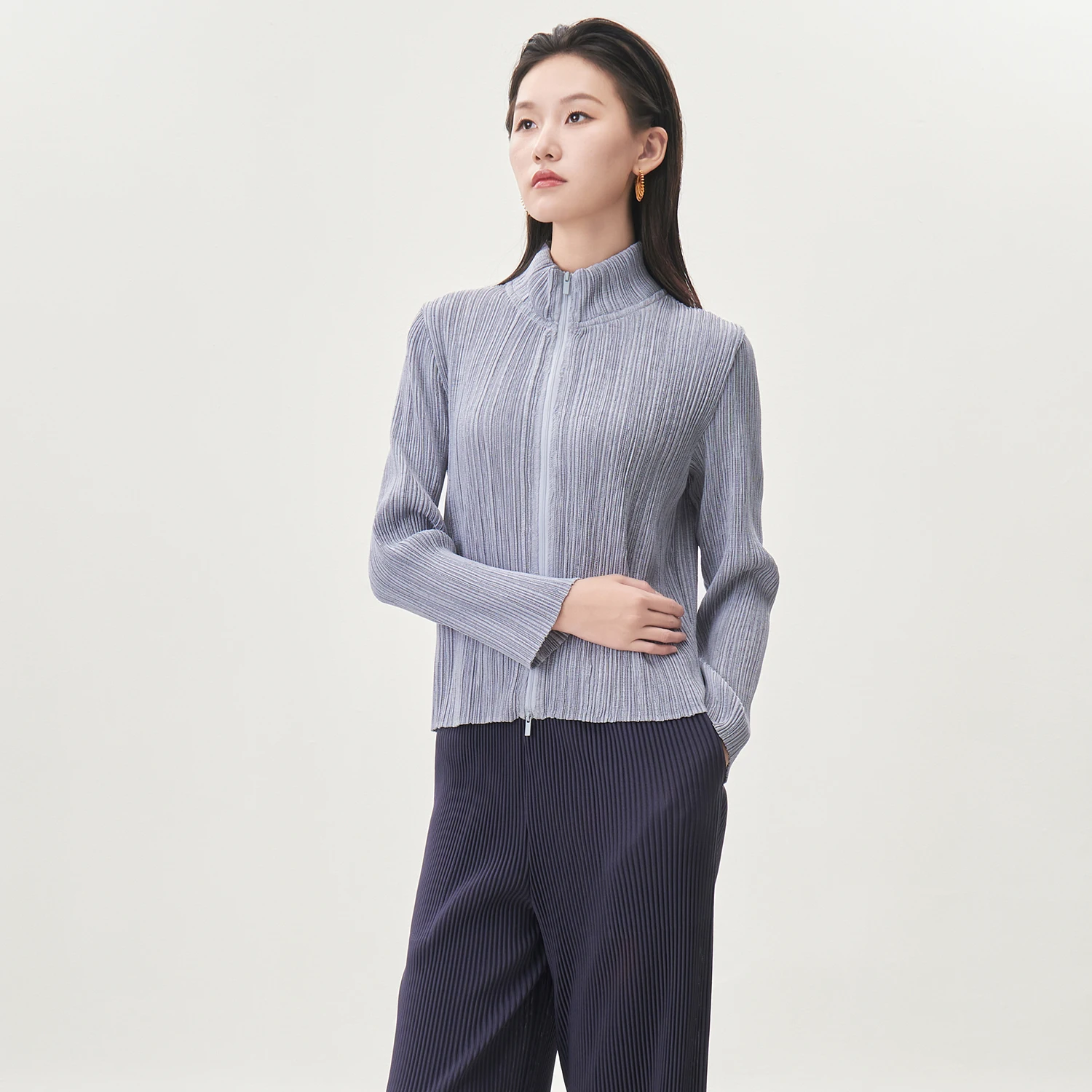 Fast Shipping Autumn Women's Fashion Tops Design Sense Cardigan Jacket Elastic Zipper Solid Color T-shirt Miyake Pleated Shirt