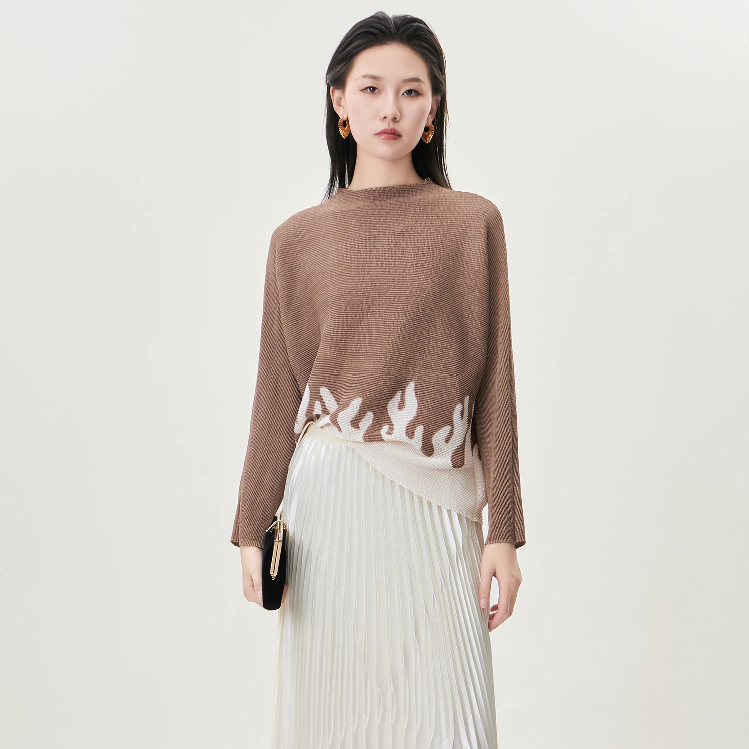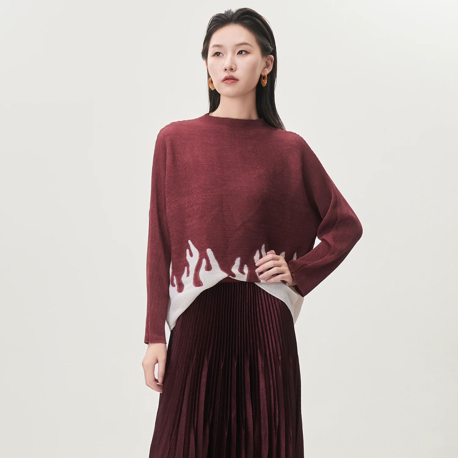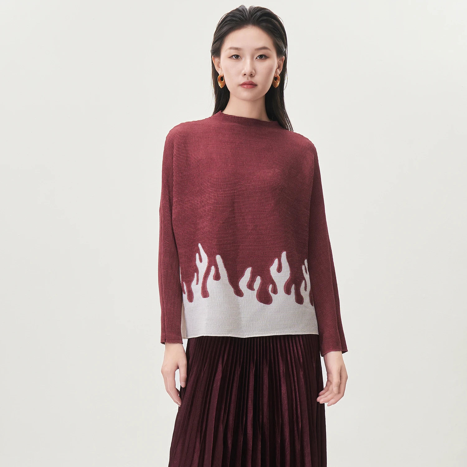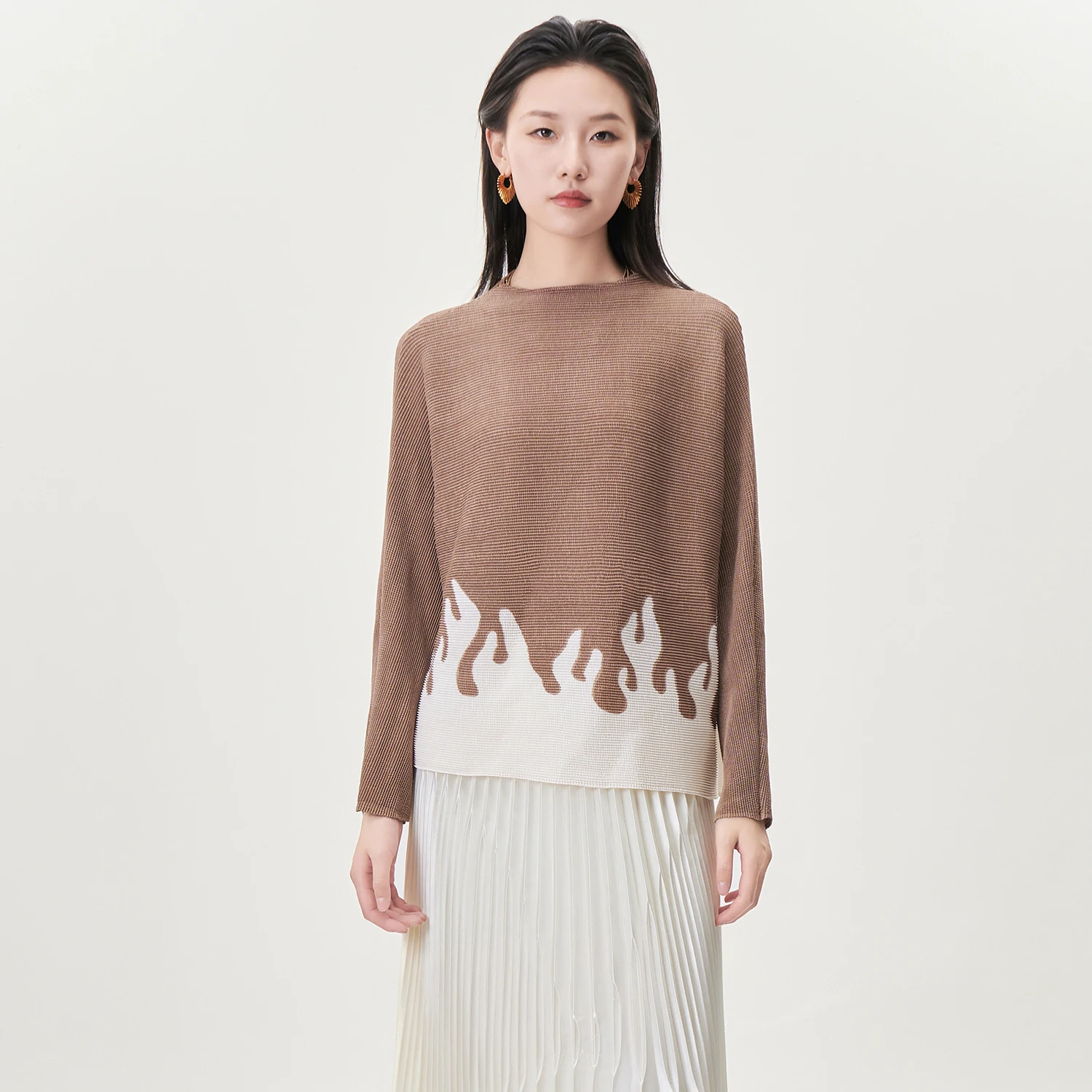 High Quality Miyake Pleated Top Design Loose Printed Long-sleeved T-shirt Autumn Women's Fashion Shirt