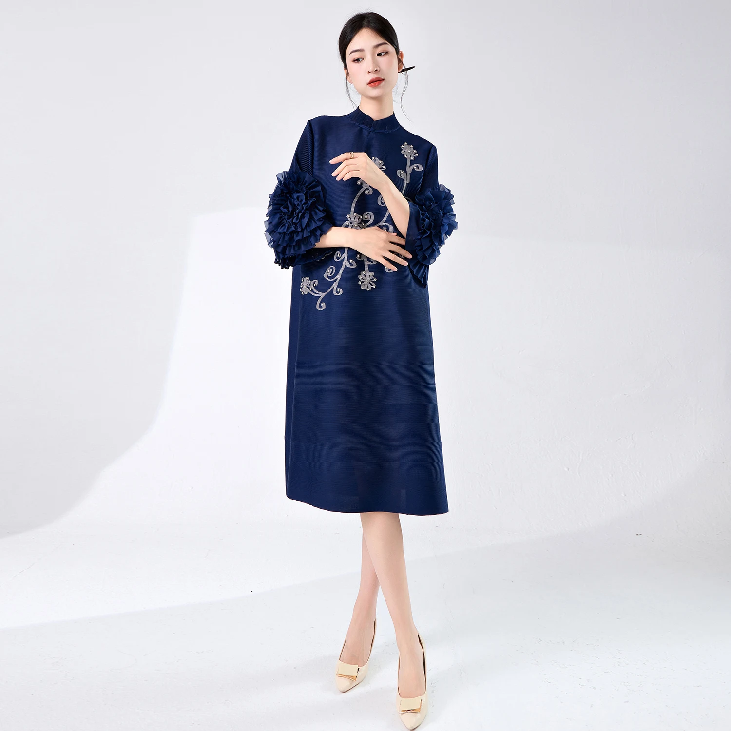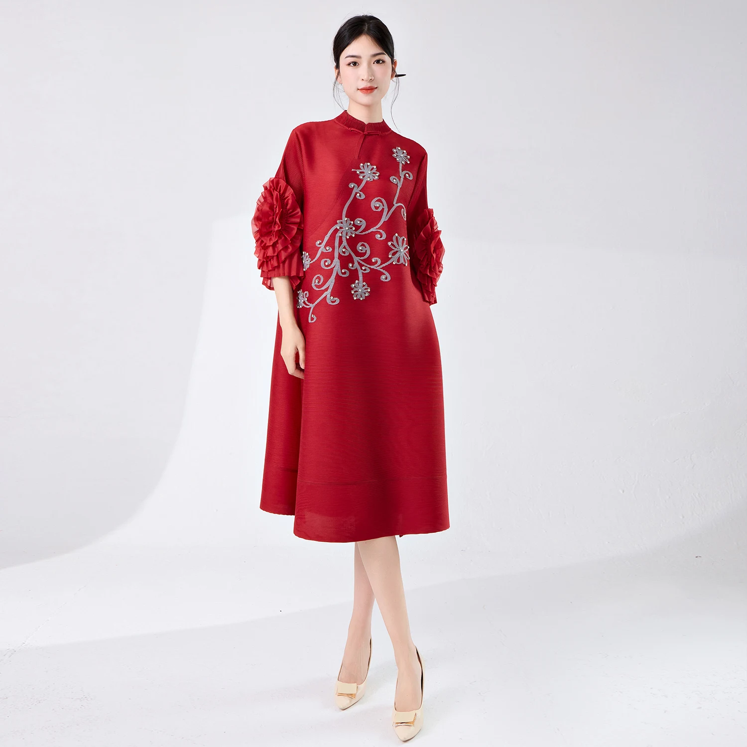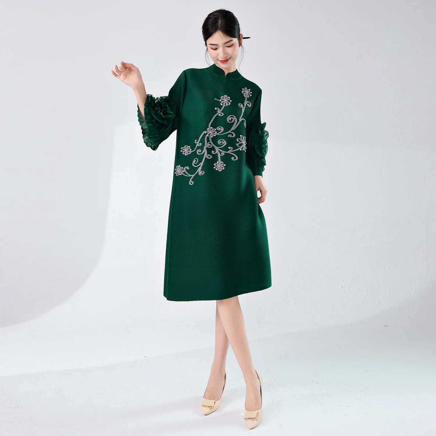 High Quality Pleated Fashionable Women's Retro Dress With Elastic Stretch Design and Cuff Pattern Midi Plus Size Loose Dress
