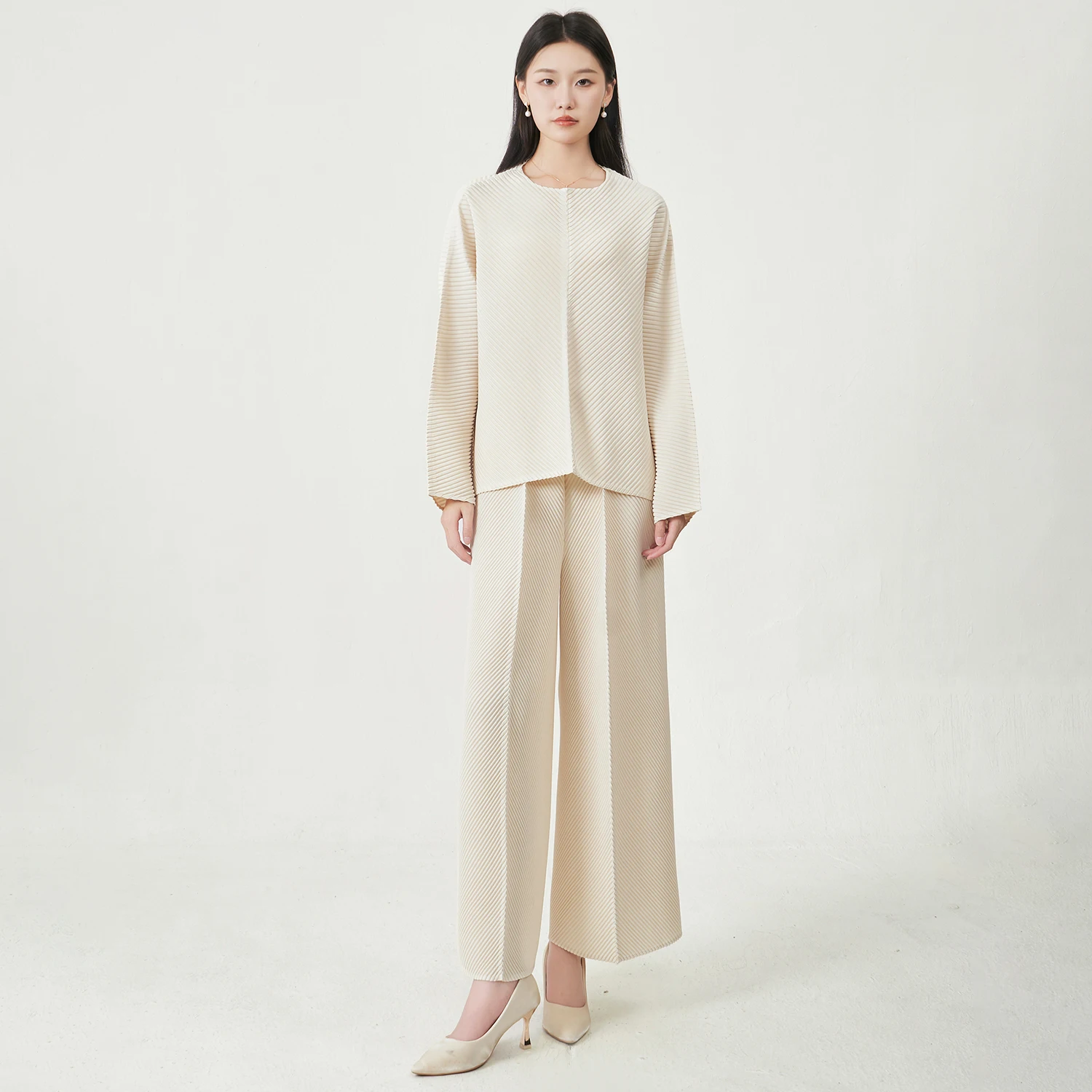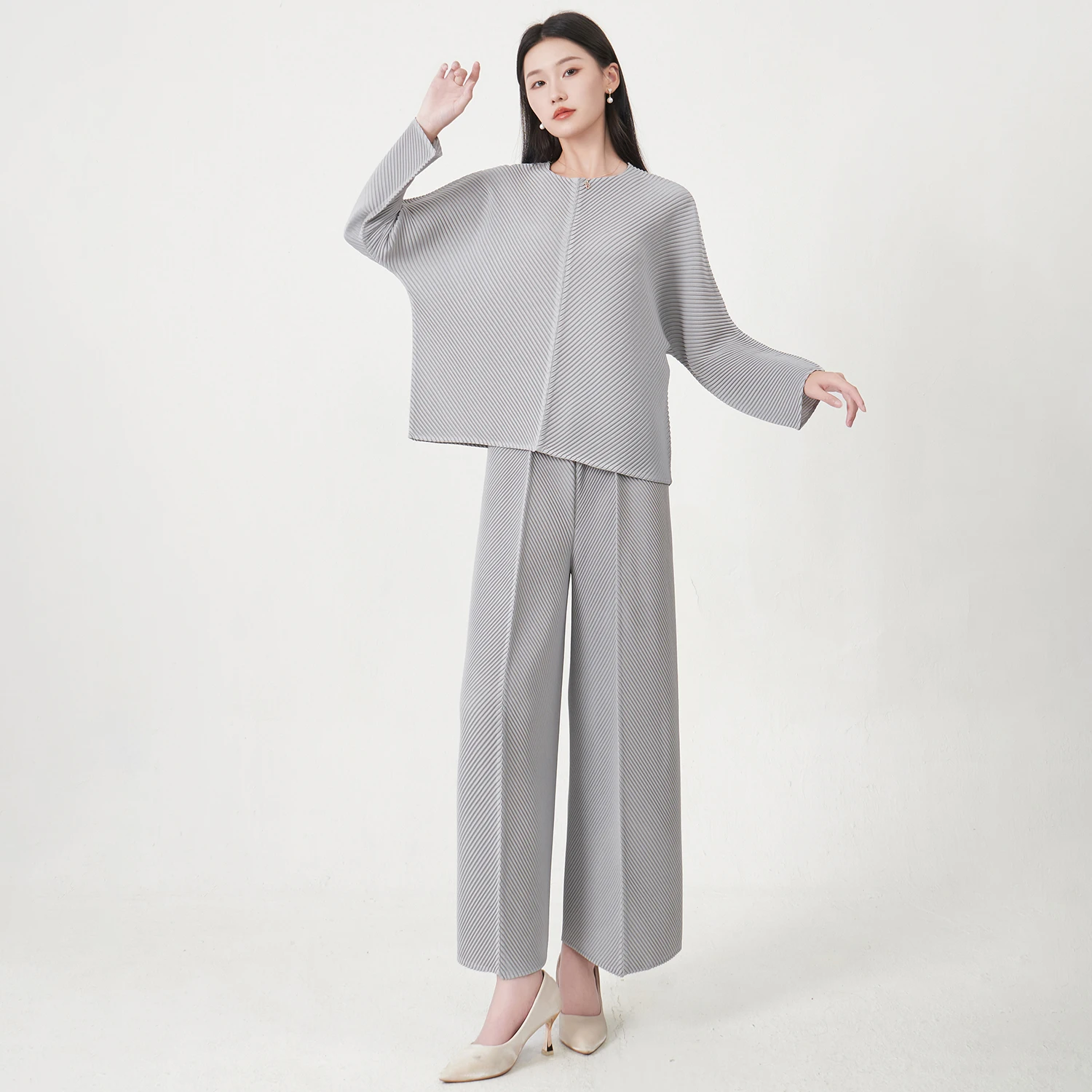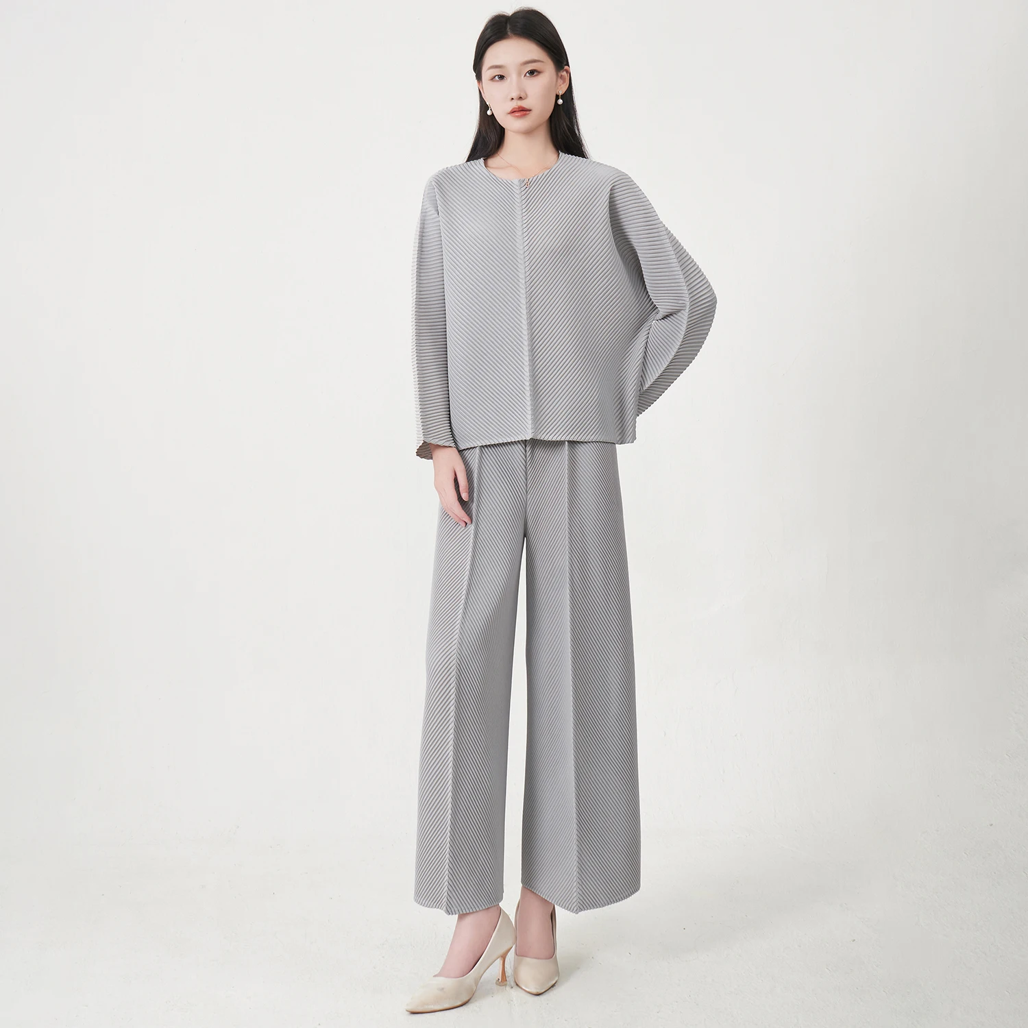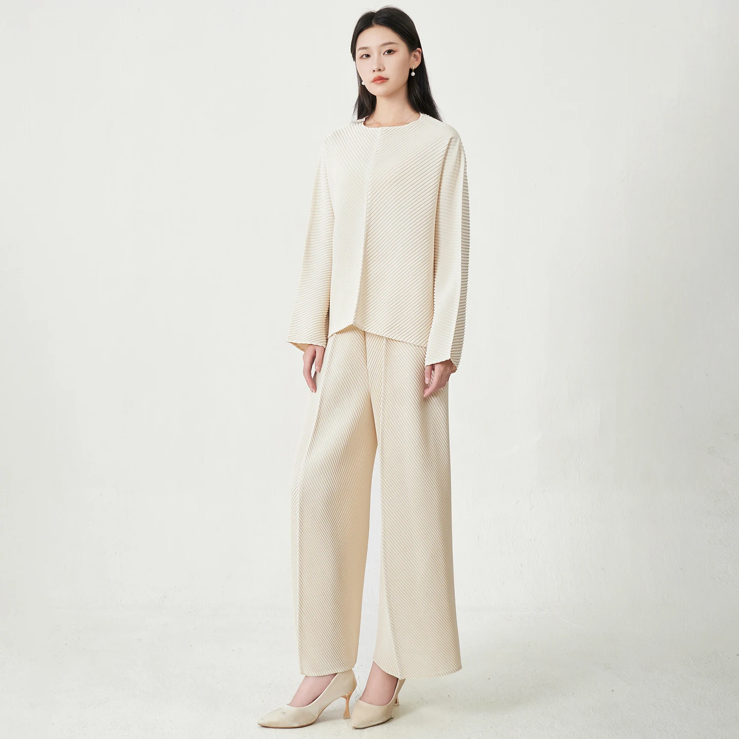 2025 Latest Design Women's Long-sleeved Top and Straight Pants Set Miyake Pleated Two-piece Solid Color Women's Fashion Set