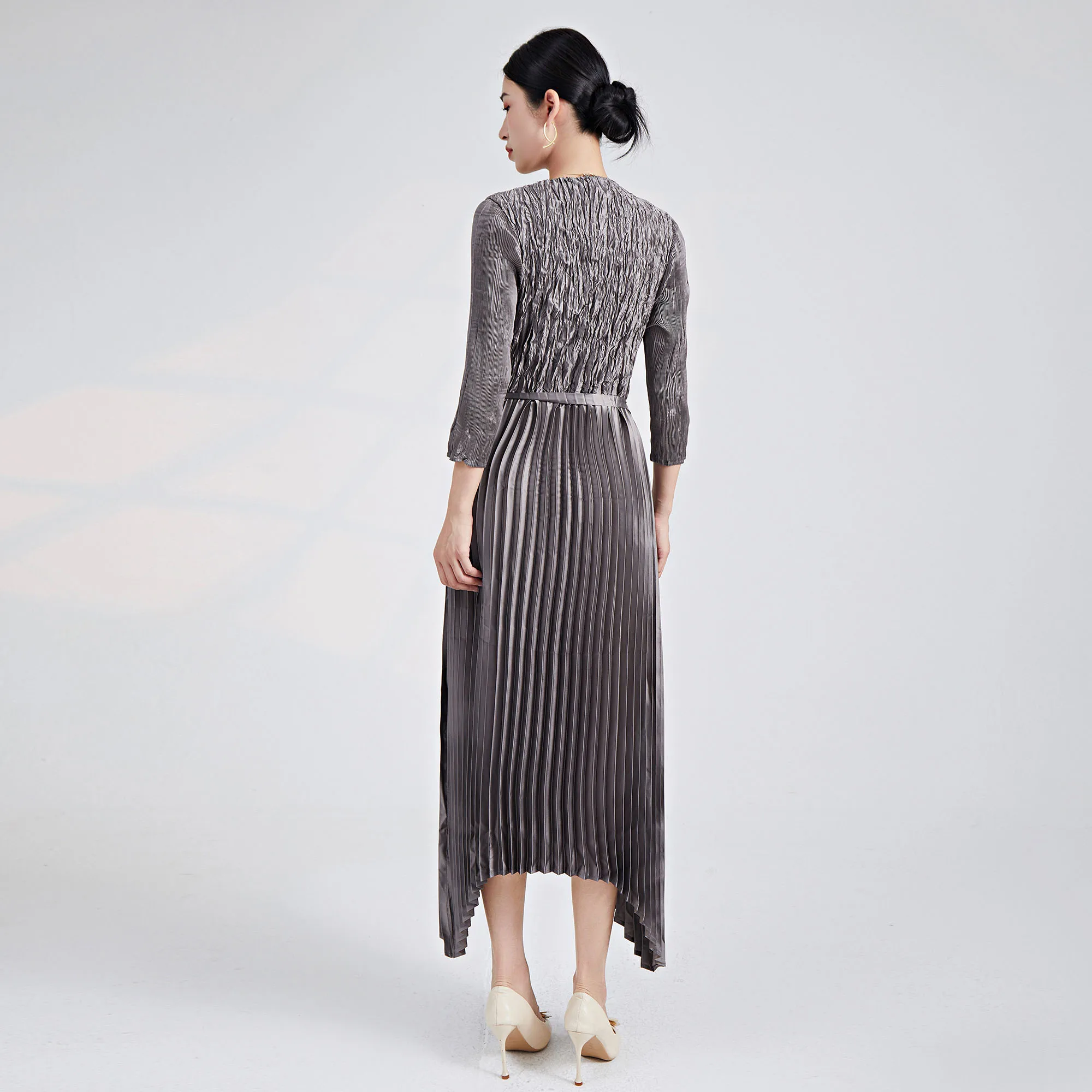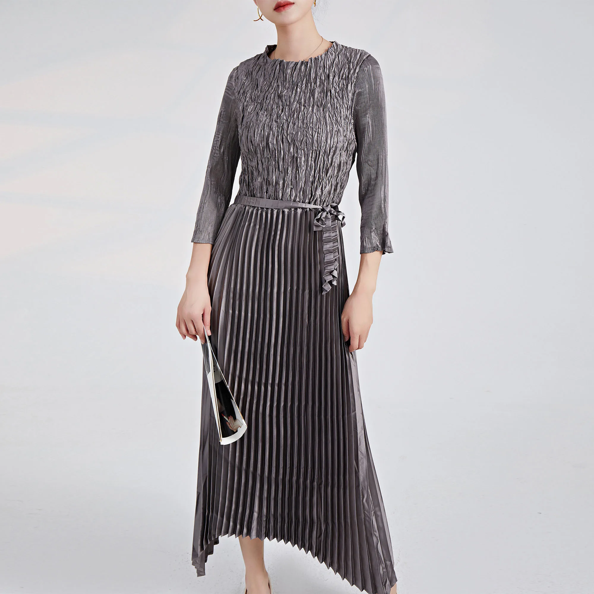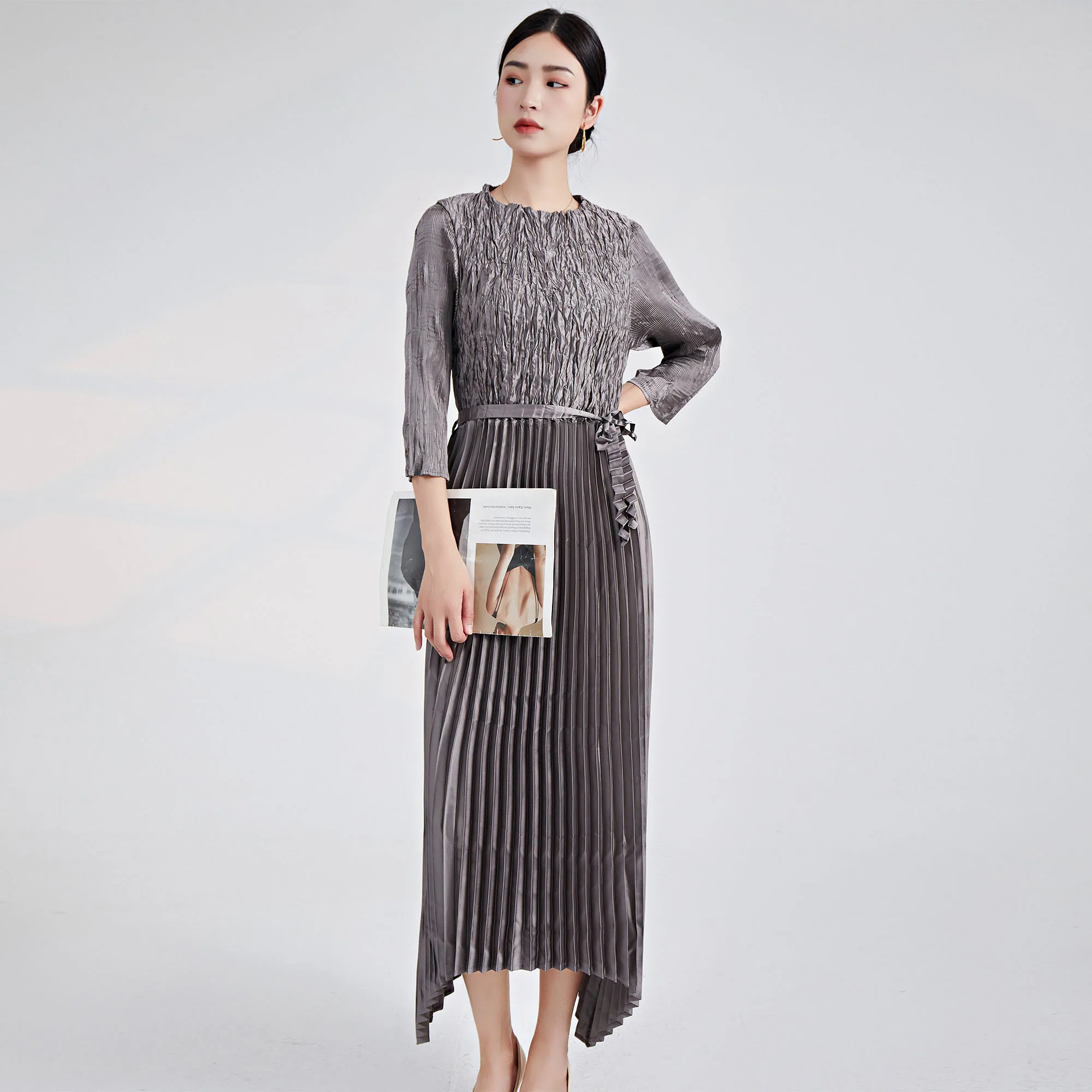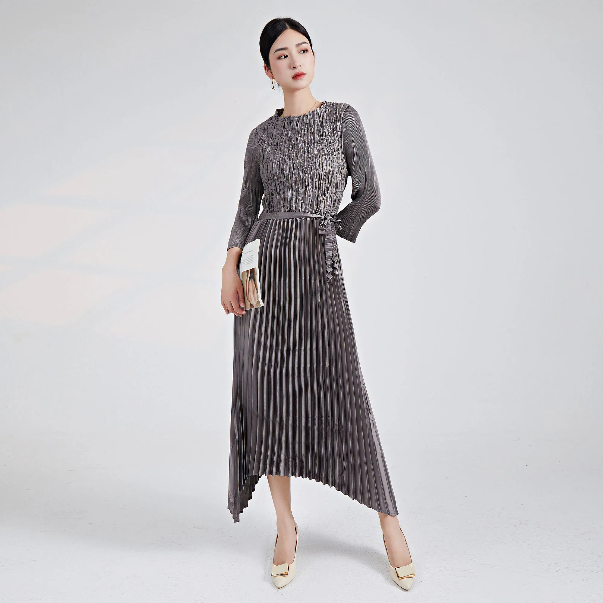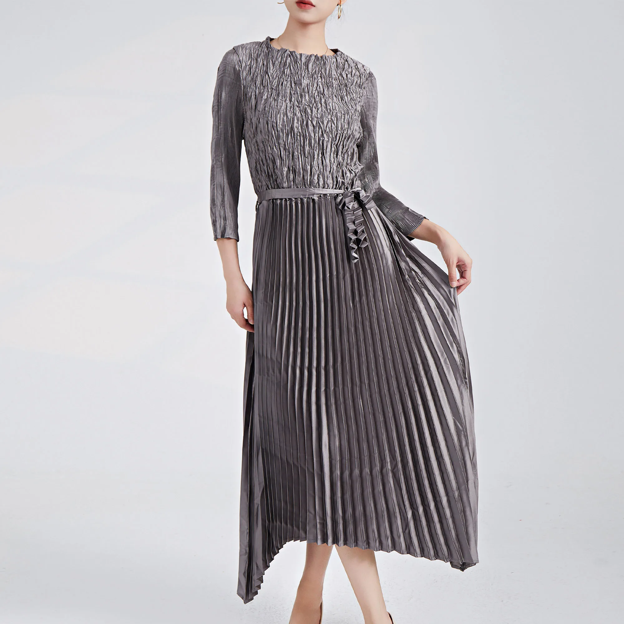 2025 Newest Design Pleated Dress European and American Fashion Dress Pleated Casual Style Belt Women Elegant Evening Dress