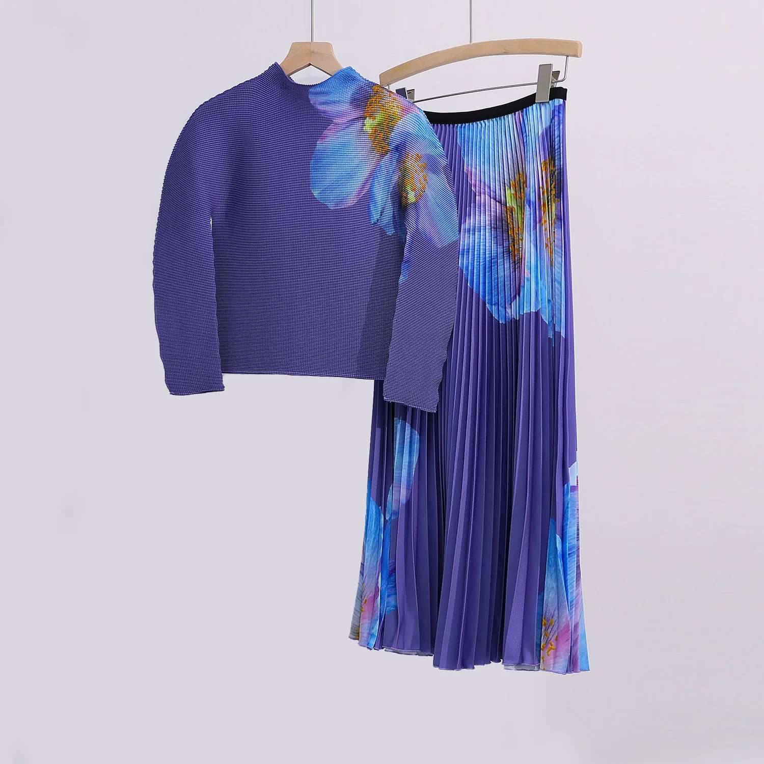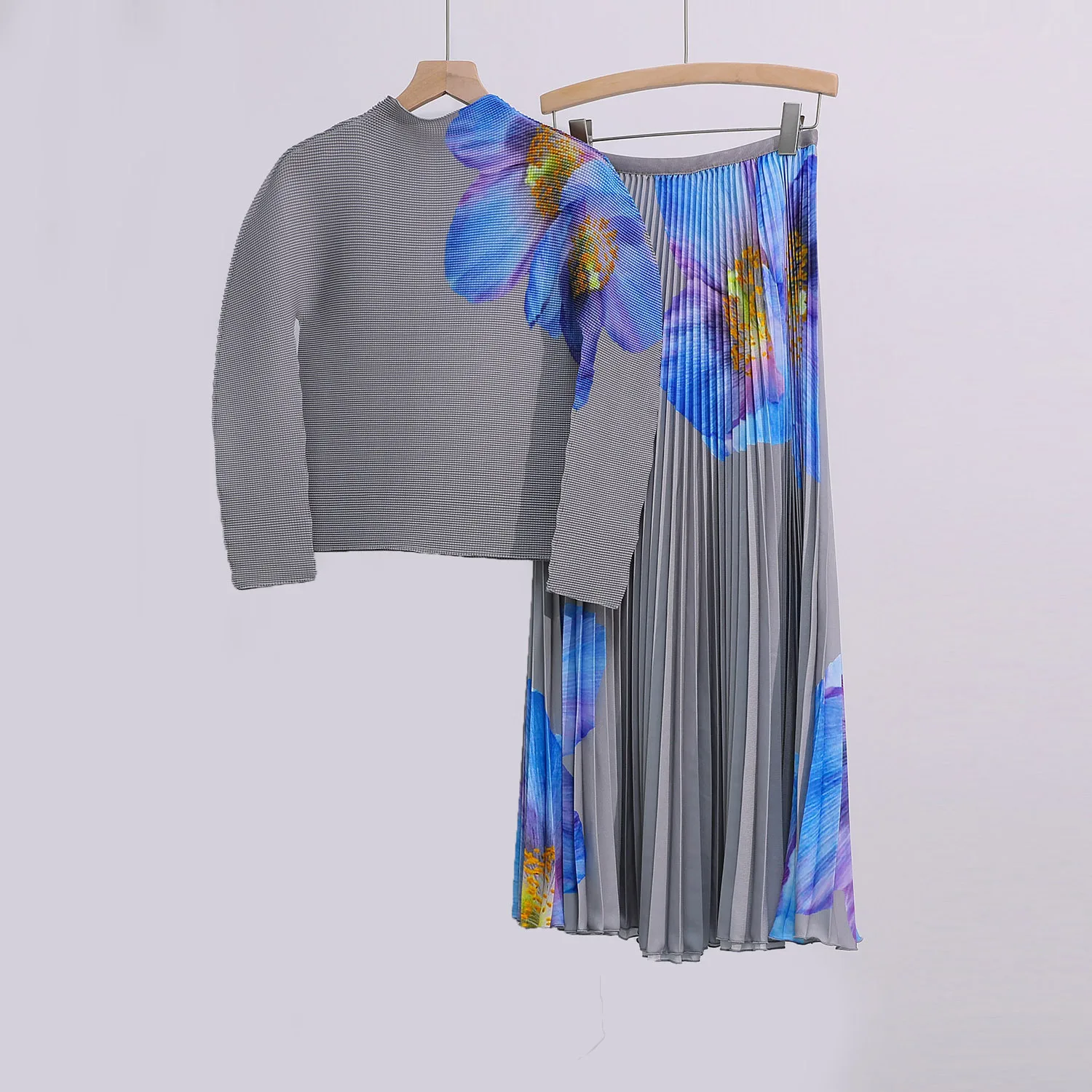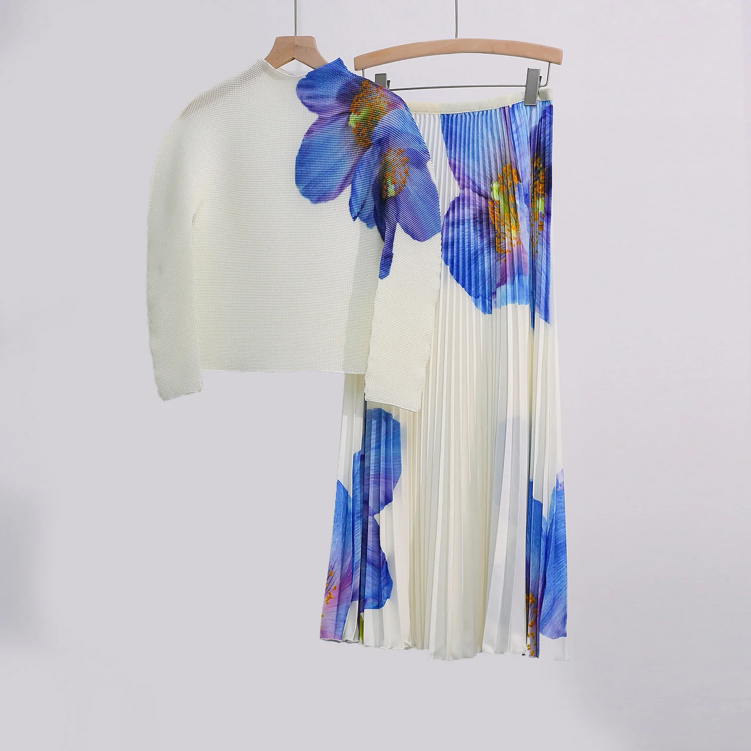 Autumn Women's Elegant Two-piece Design Elastic Long-sleeved Top and Skirt Set Printed Chiffon 2025 New Style