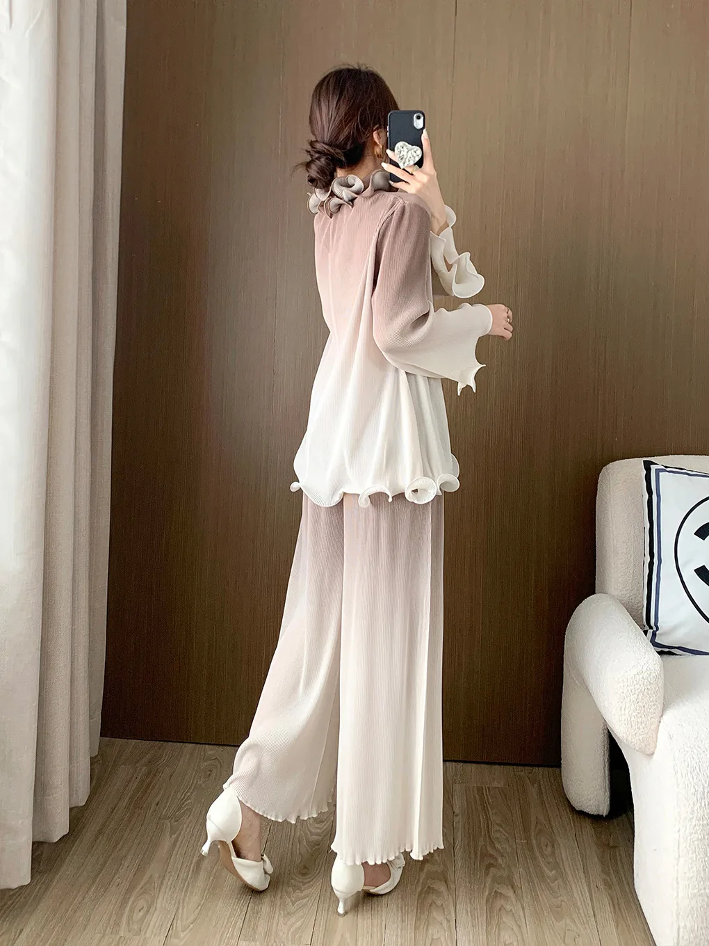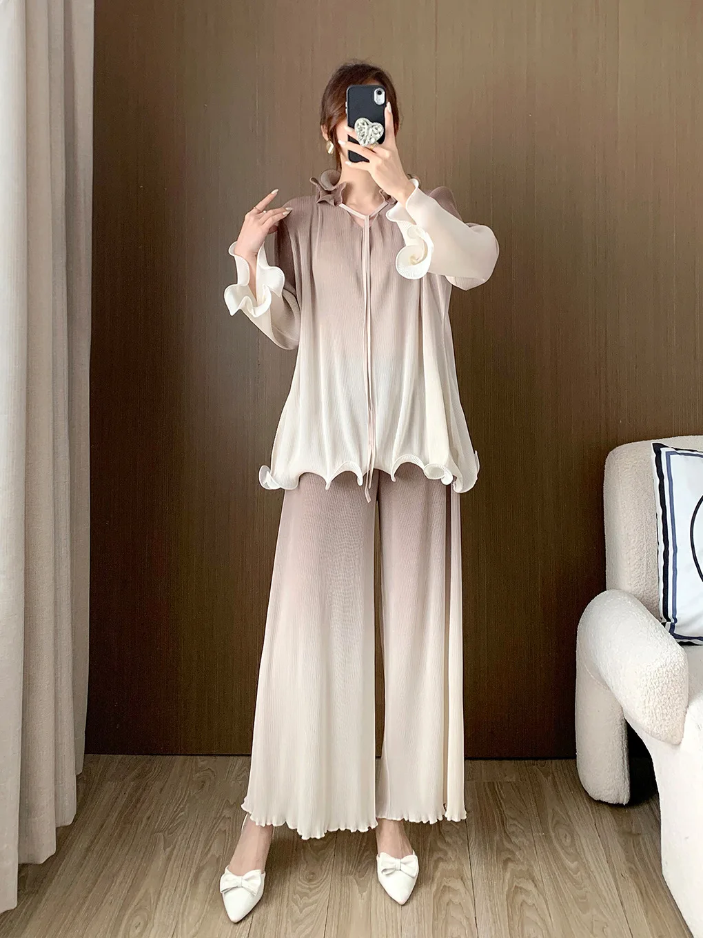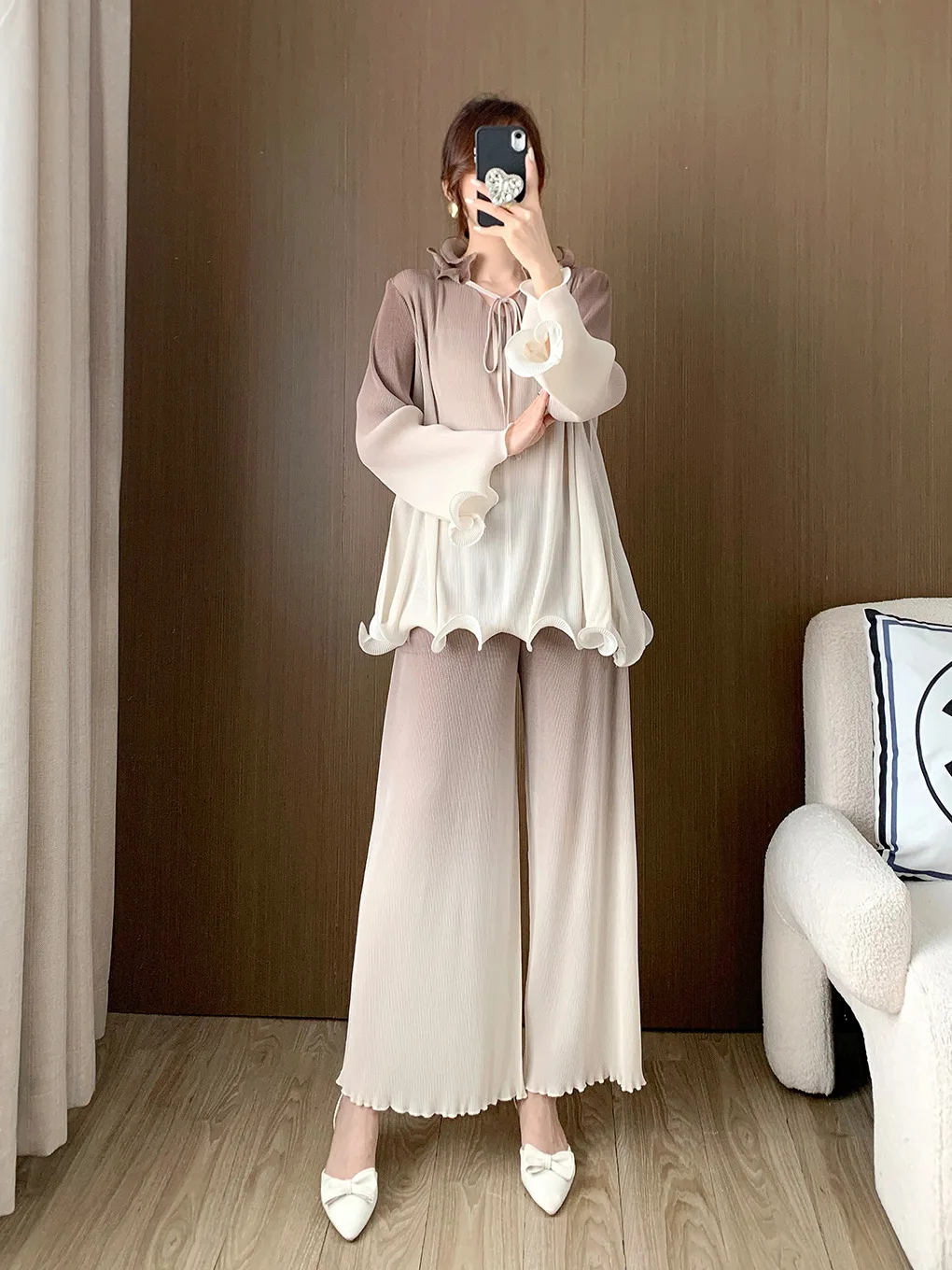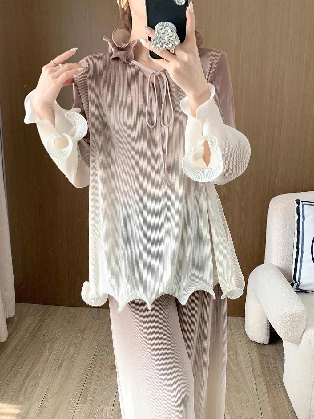 High Quality Women's Fashion Set Long Sleeve Top and Pants Two-Piece Set Pleated Stretch Wide Leg Pants Casual Suit