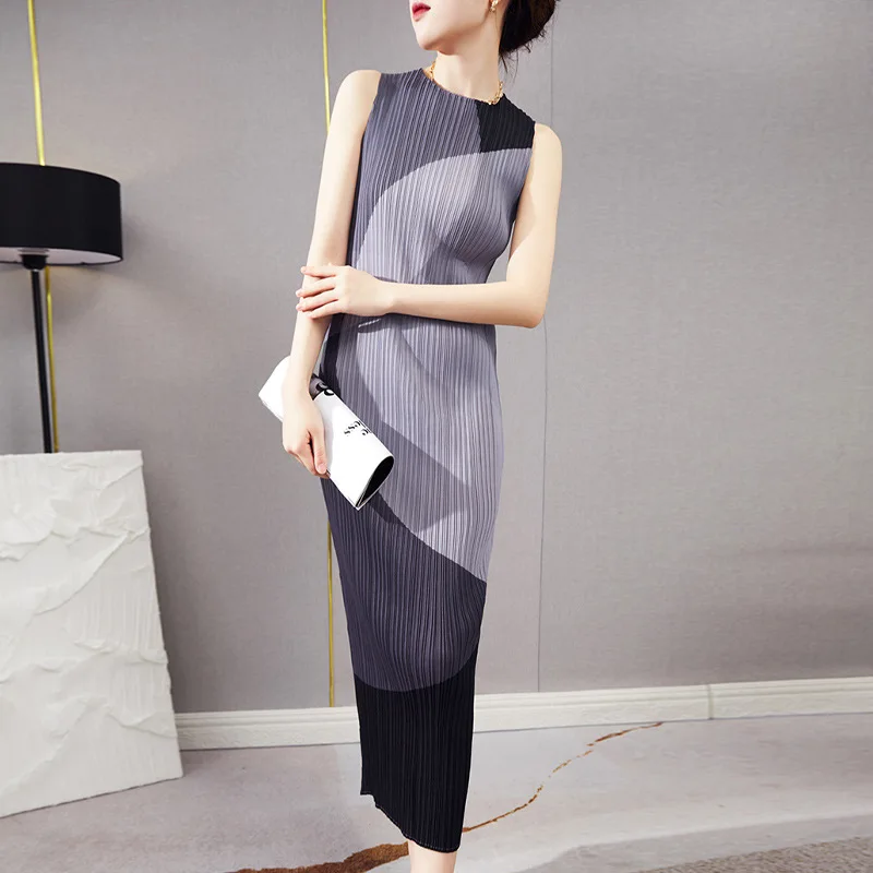 Factory Wholesale Women's Fashion Dress High Quality Summer Sleeveless Casual Dress Pleated Print Miyake Dress