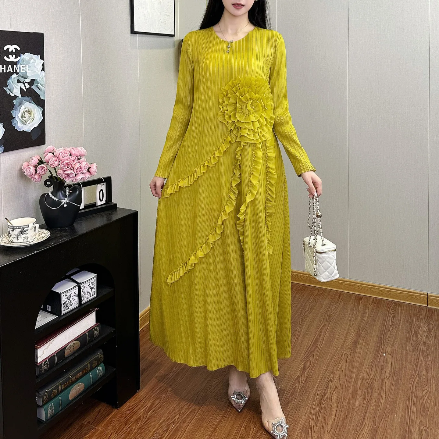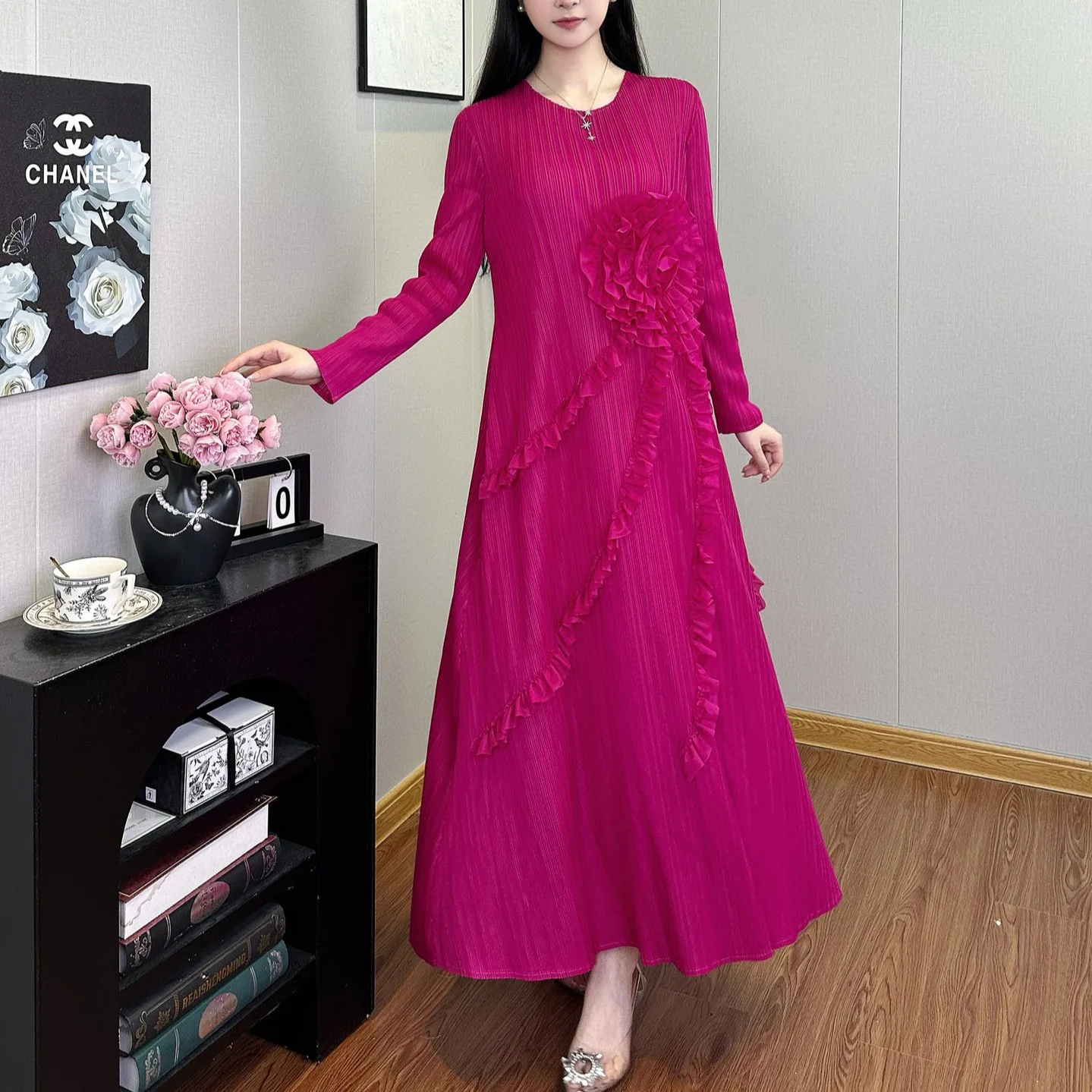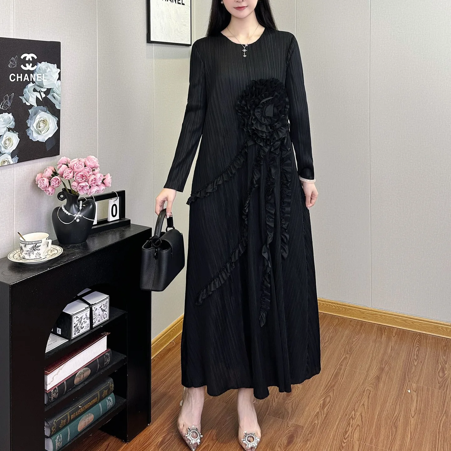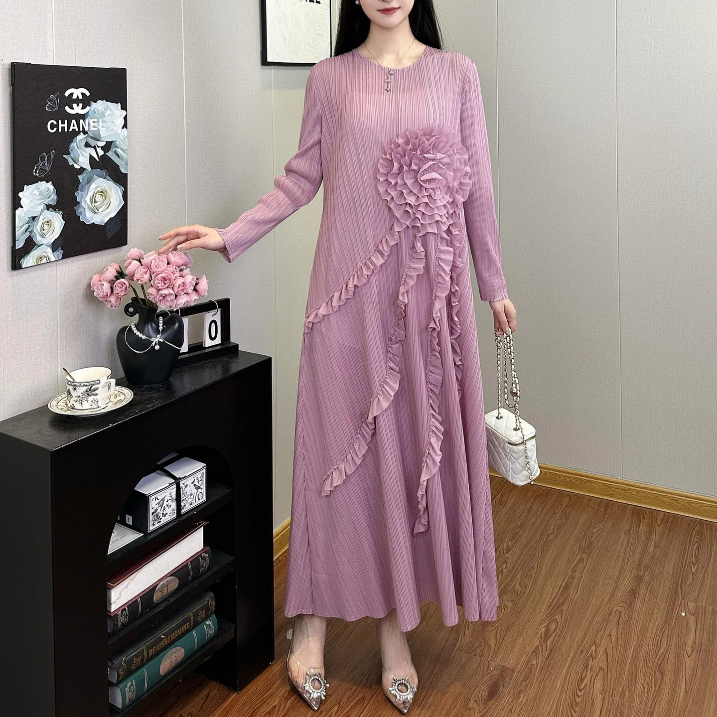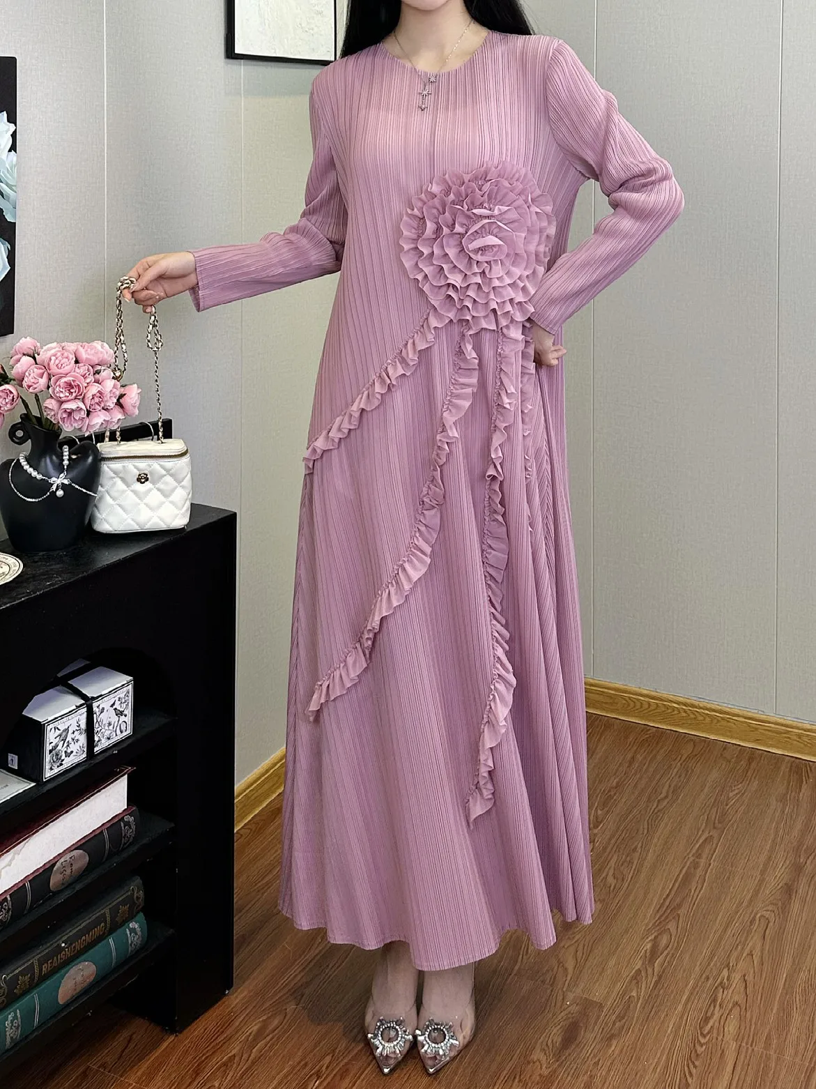 Women Clothing Wholesale Miyake Pleated Dress Design Applique Loose Dress Long Sleeve Ladies Elegant Dress