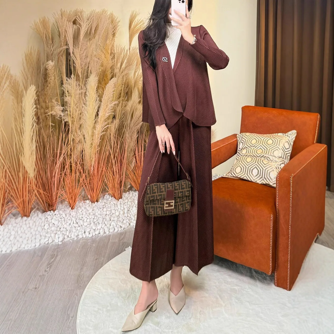 2025 Latest Autumn Women's Fashion Set Coat Top and Wide-leg Pants Two-piece Elastic Casual Miyake Pleated Suit
