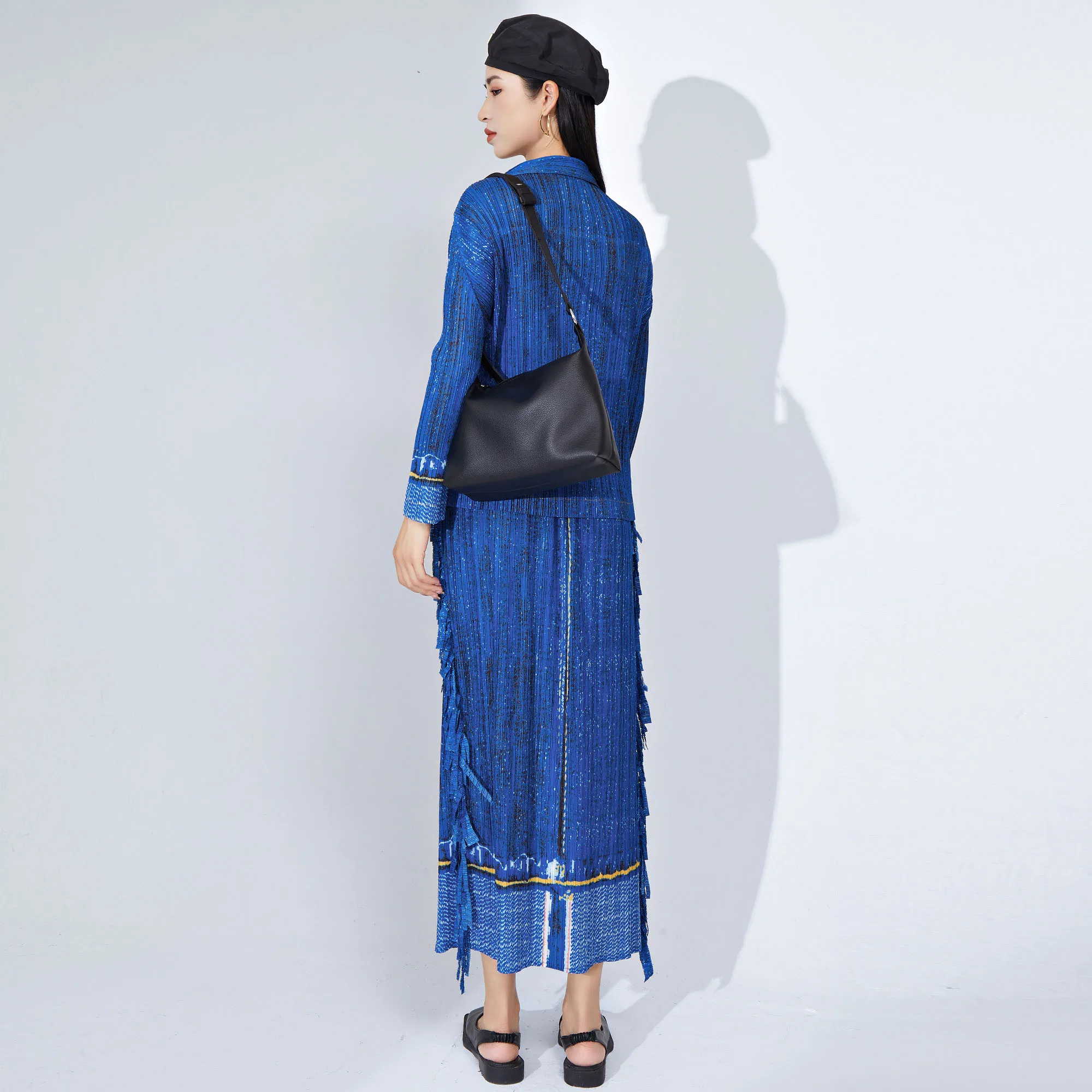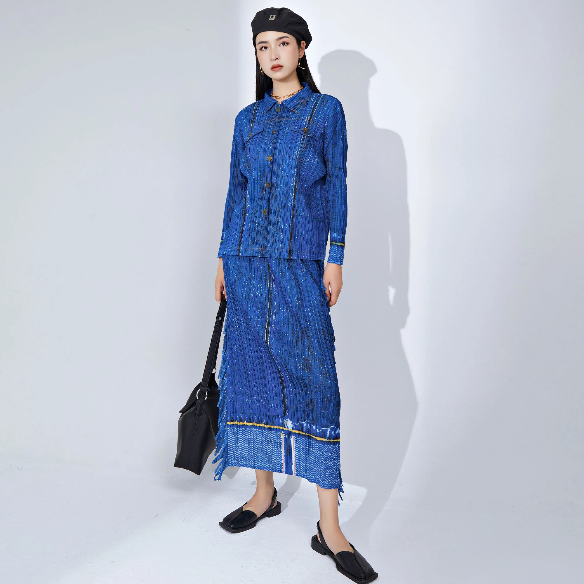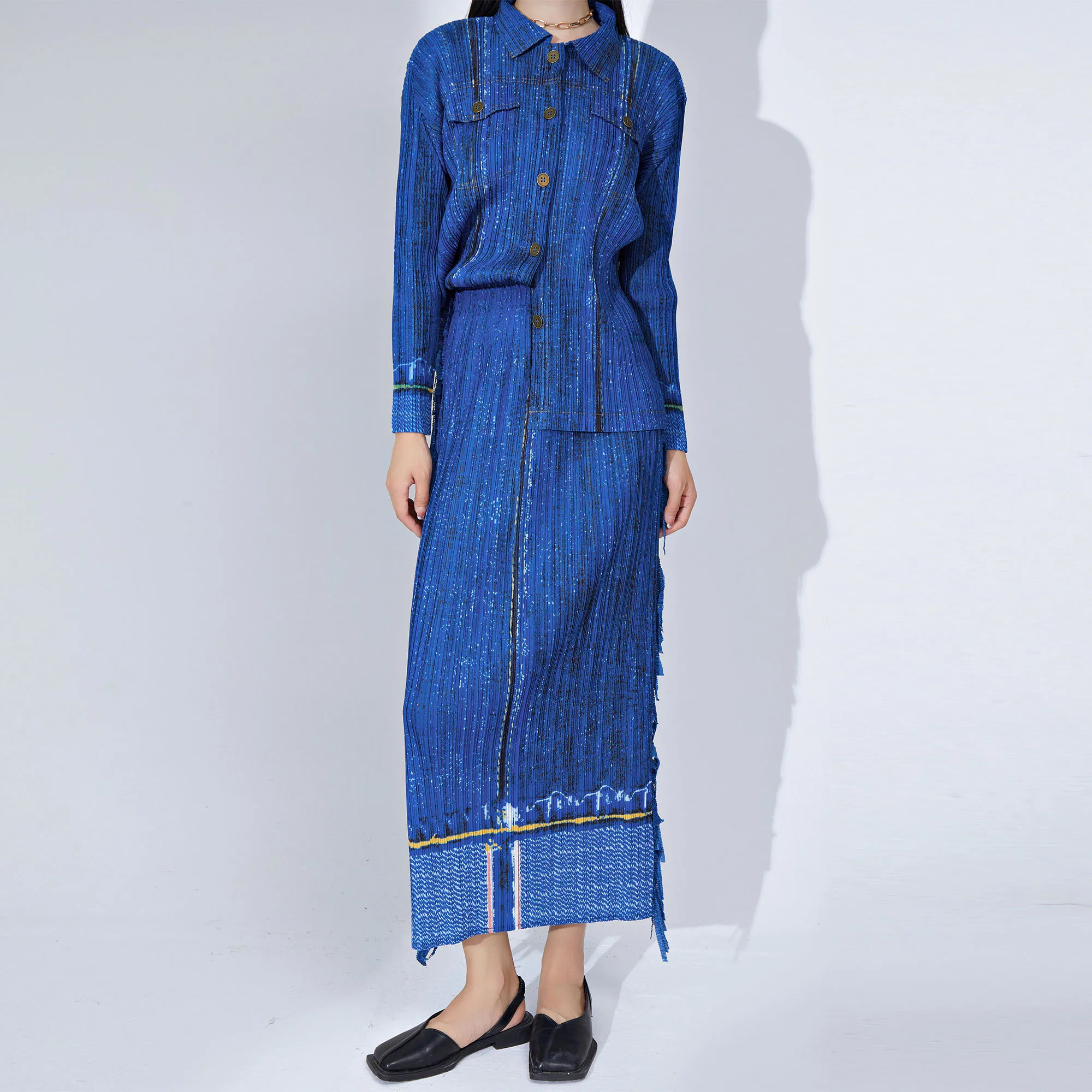 Women's Pleated Denim Set Casual Style Long-Sleeve Cardigan Top and Long Pleated Denim Skirt 2-Piece