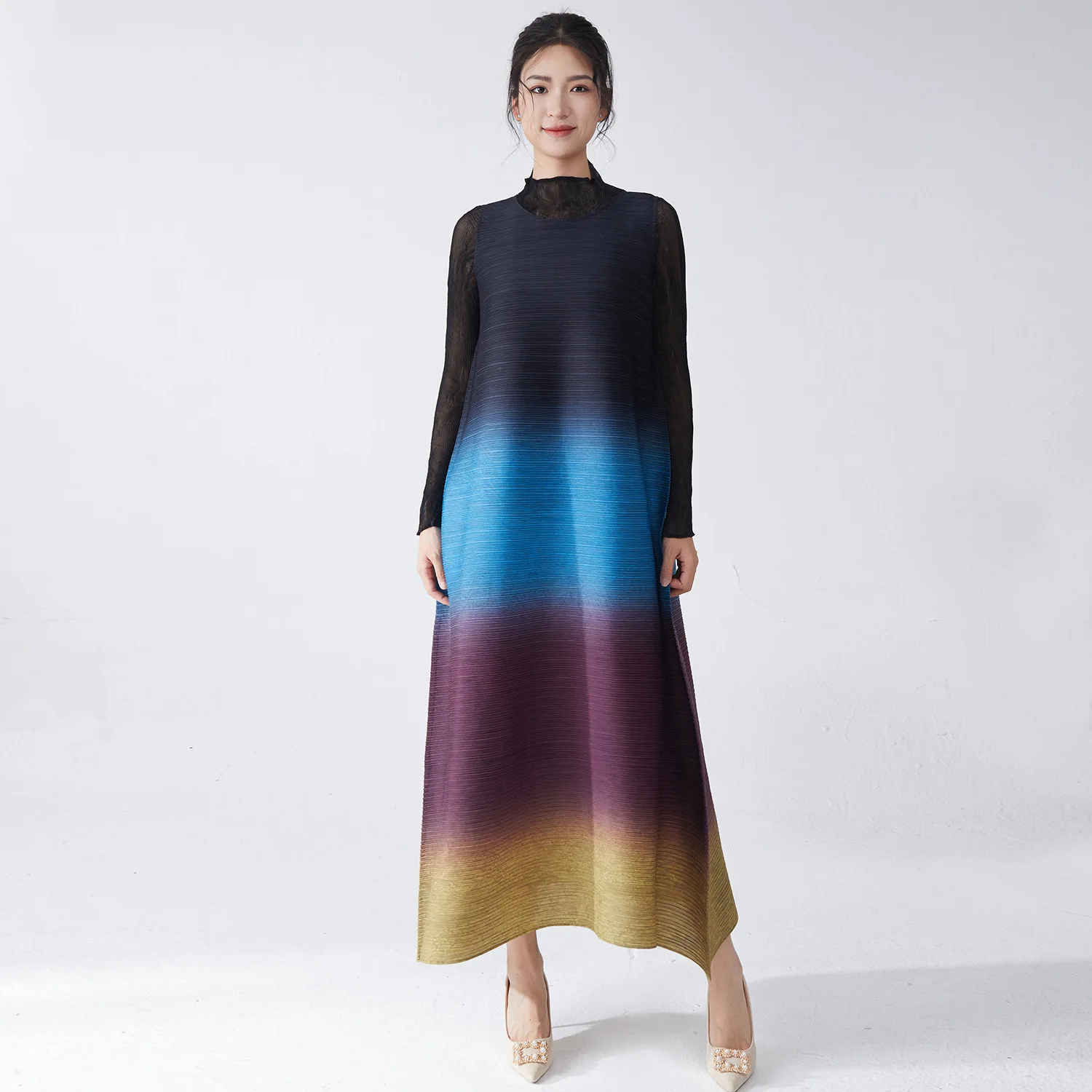 2025 Latest Design Miyake Pleated Dress Stretchable Gradient Ladies Sleeveless Plus Size Casual Dress Polyester Women Dresses