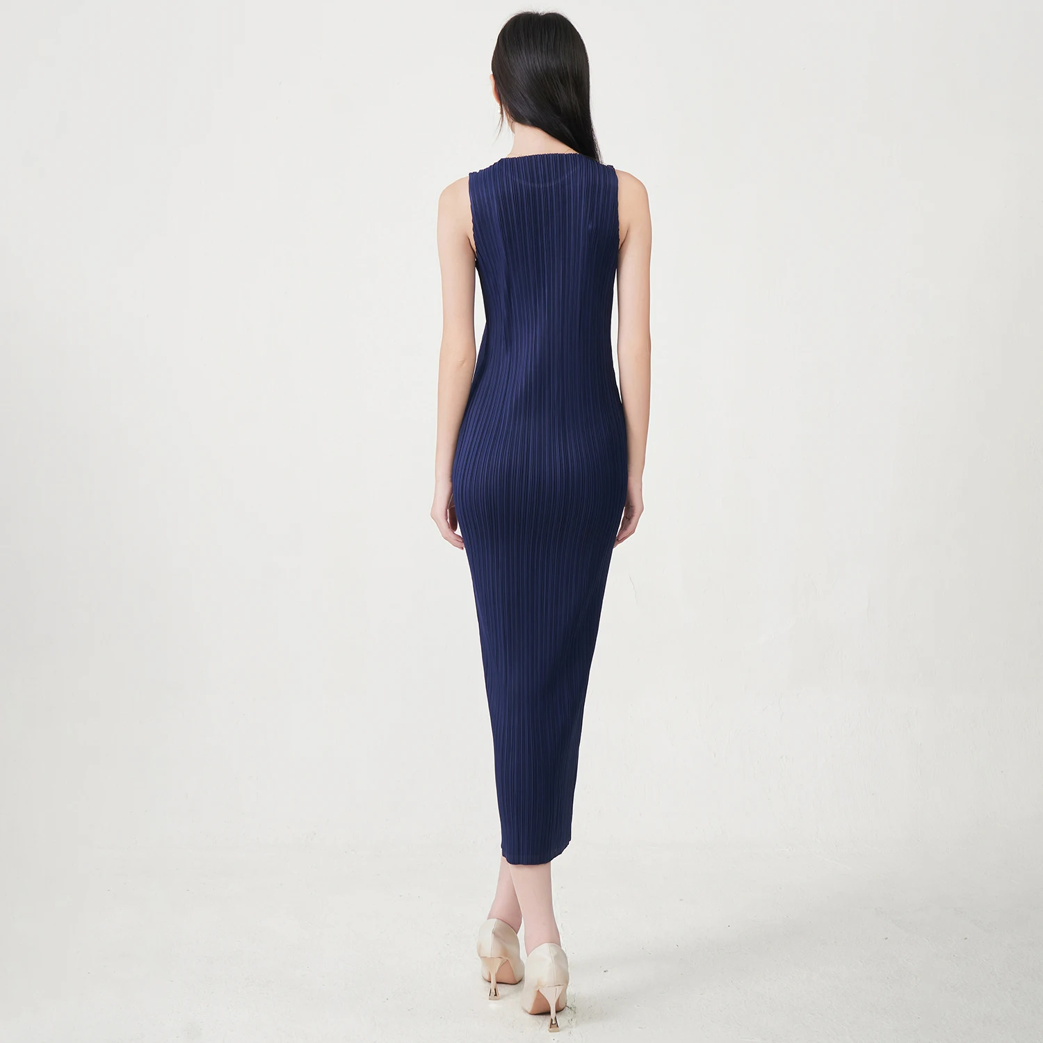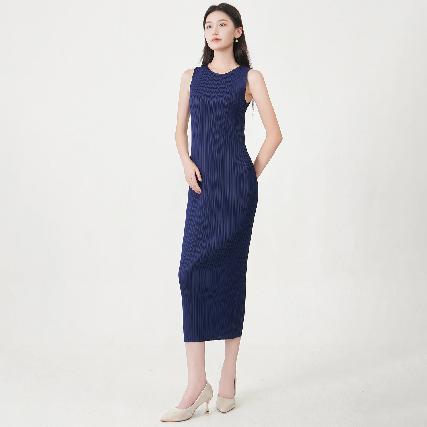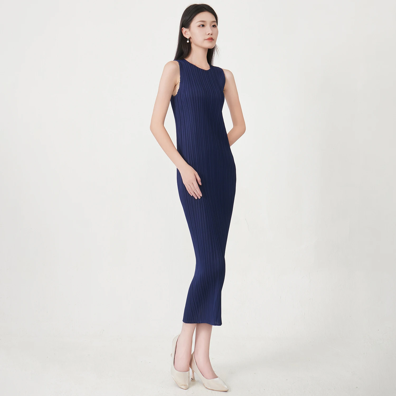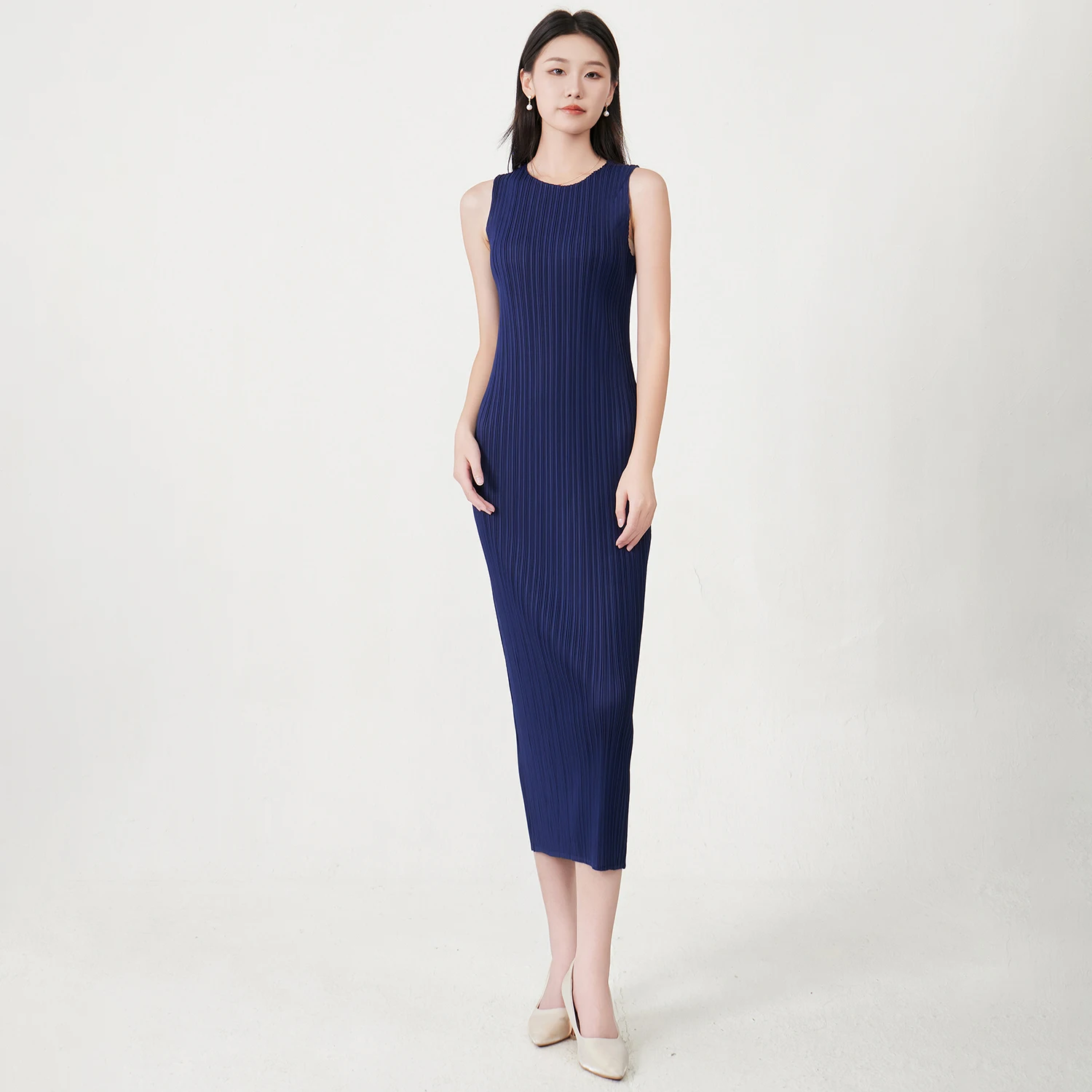 Miyake Pleated Dress Basic Classic Dress High Quality Women's Fashion Dress Crew Neck Sleeveless Mid-length Straight Dress