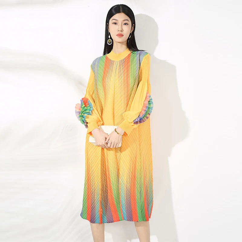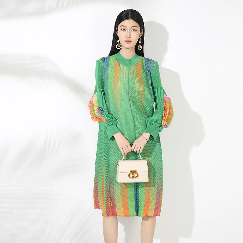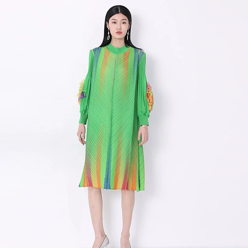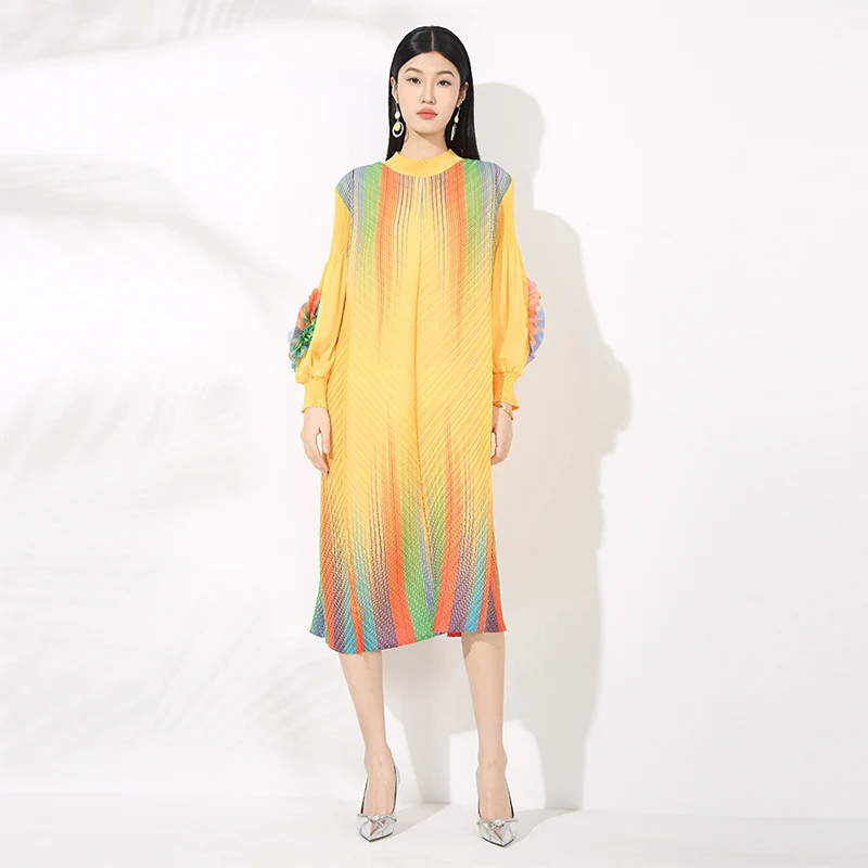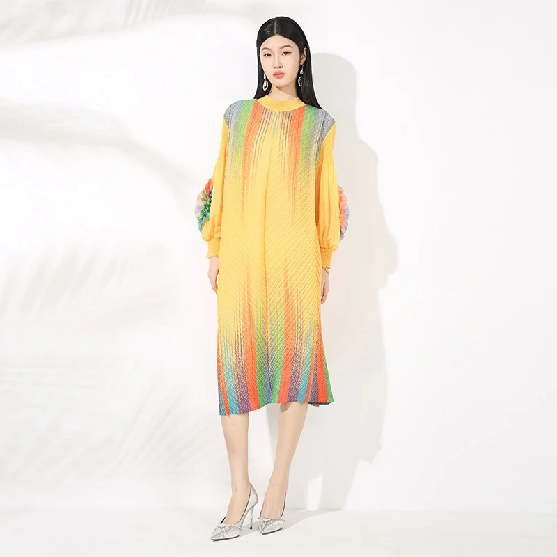 Miyake Pleated Dress 2025 Autumn New Women's Elegant Dress Elastic Printed Sleeves Flower Loose Mid-length Dress