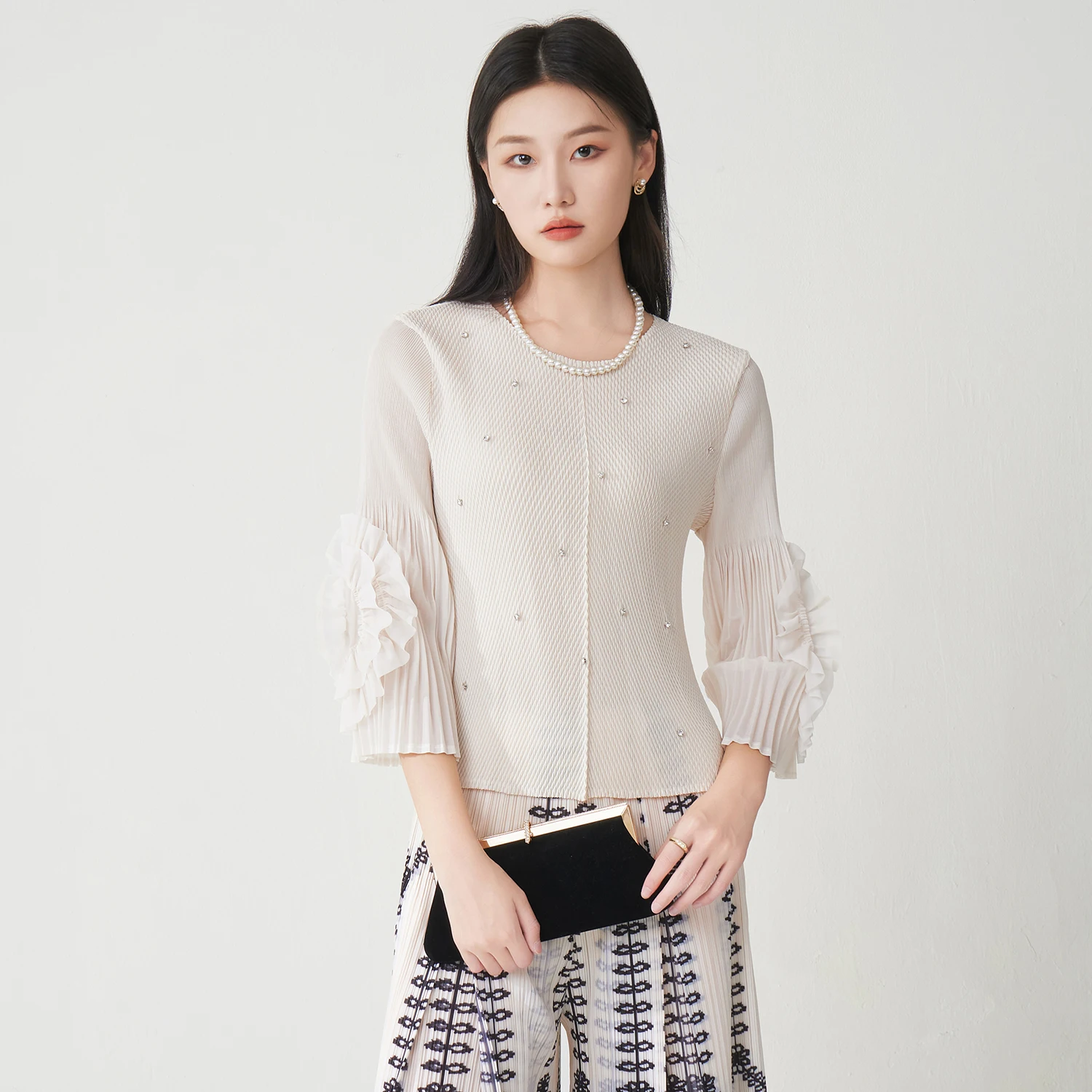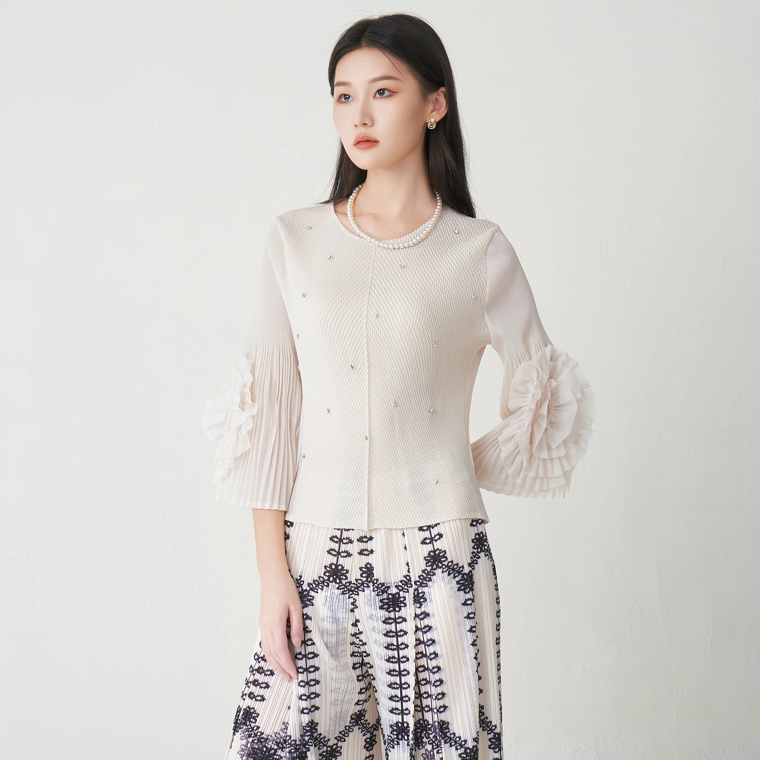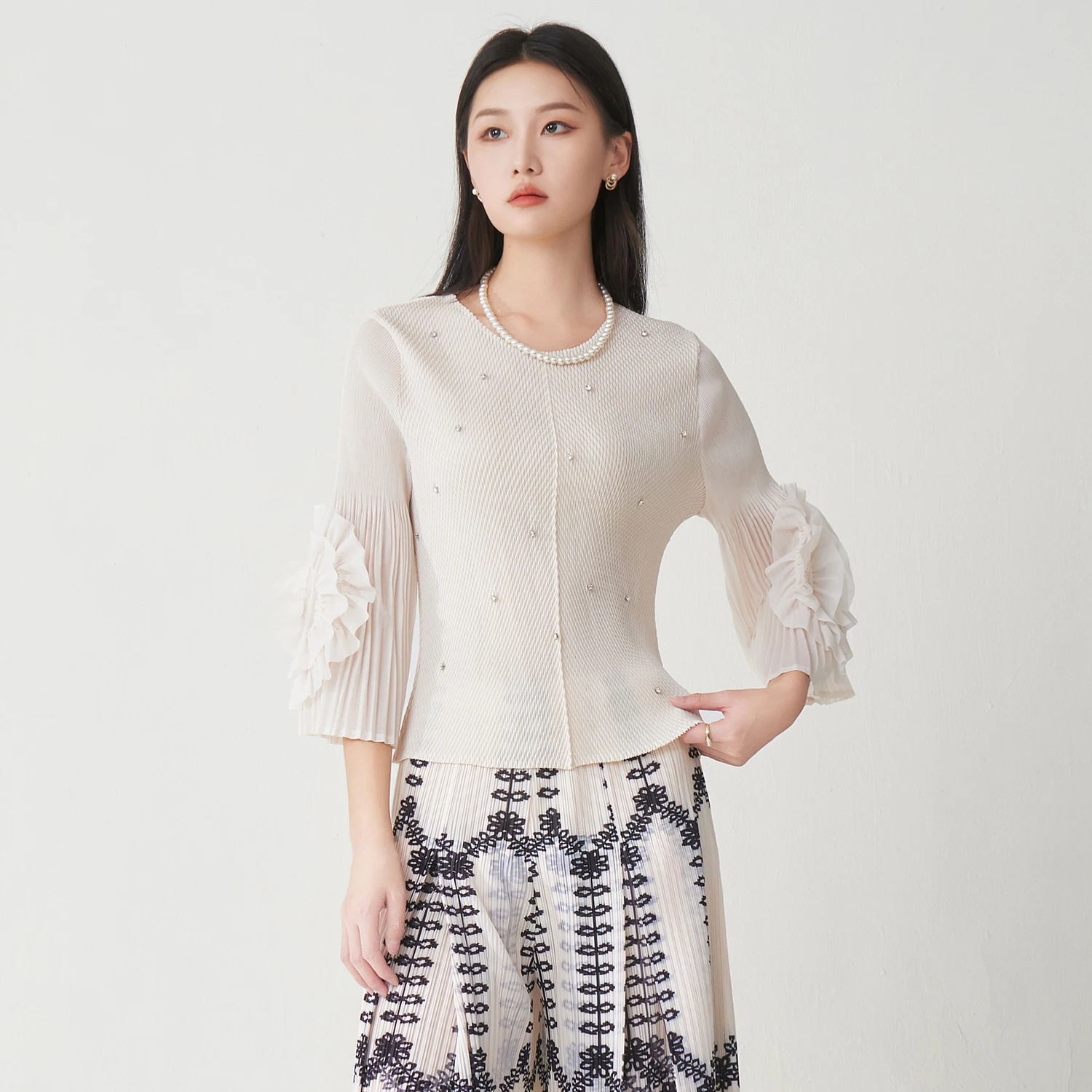 2025 Autumn New Women's Elegant Tops Design Sense Nail Diamond Fashion Miyake Pleated Long-sleeved Shirt