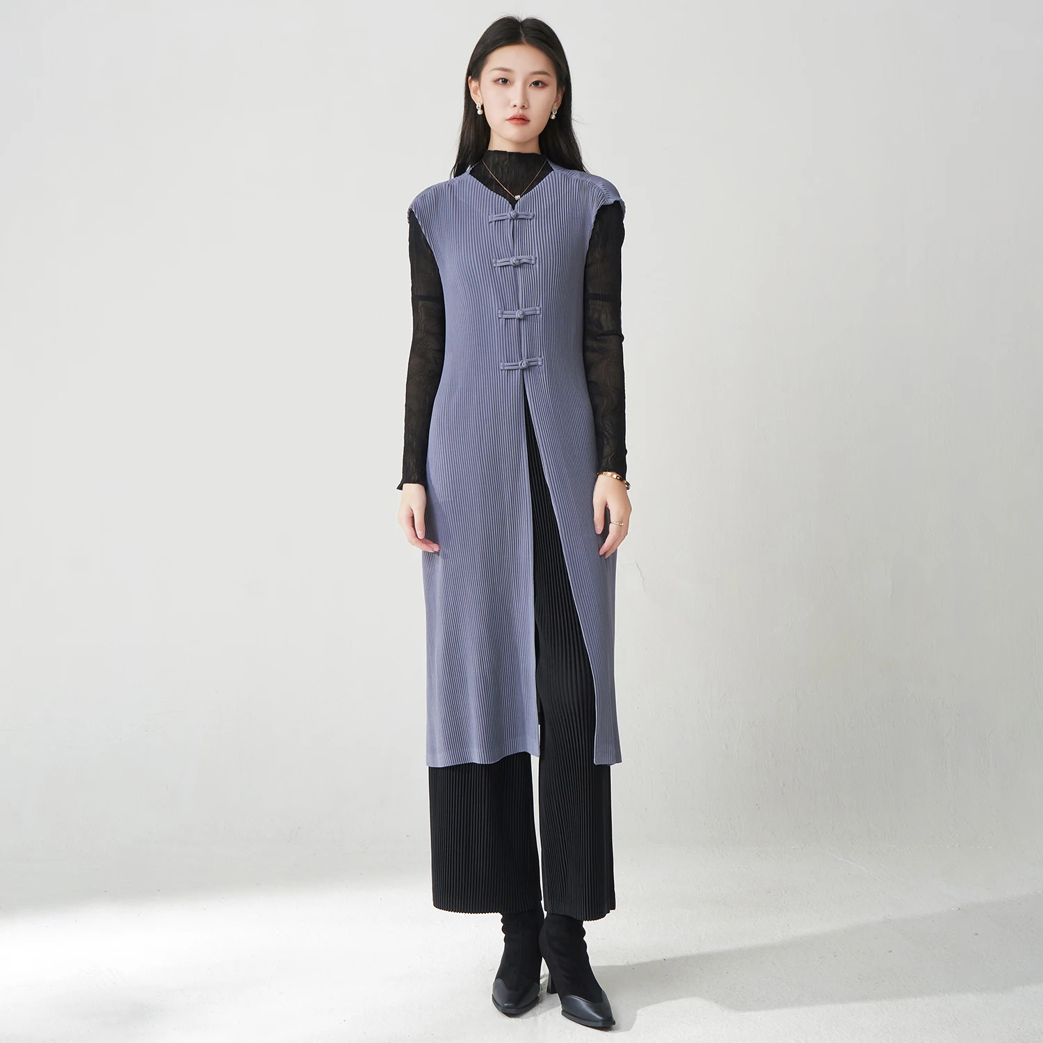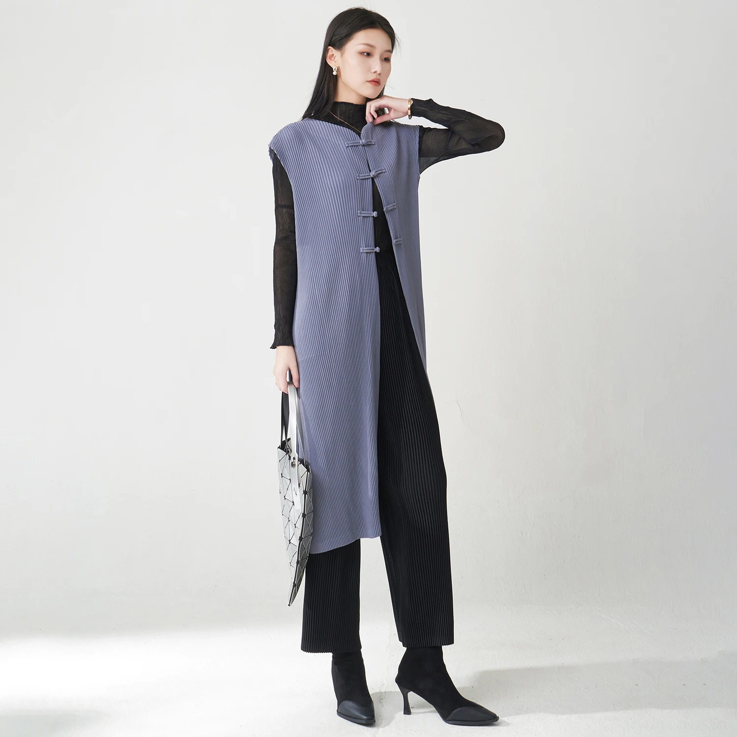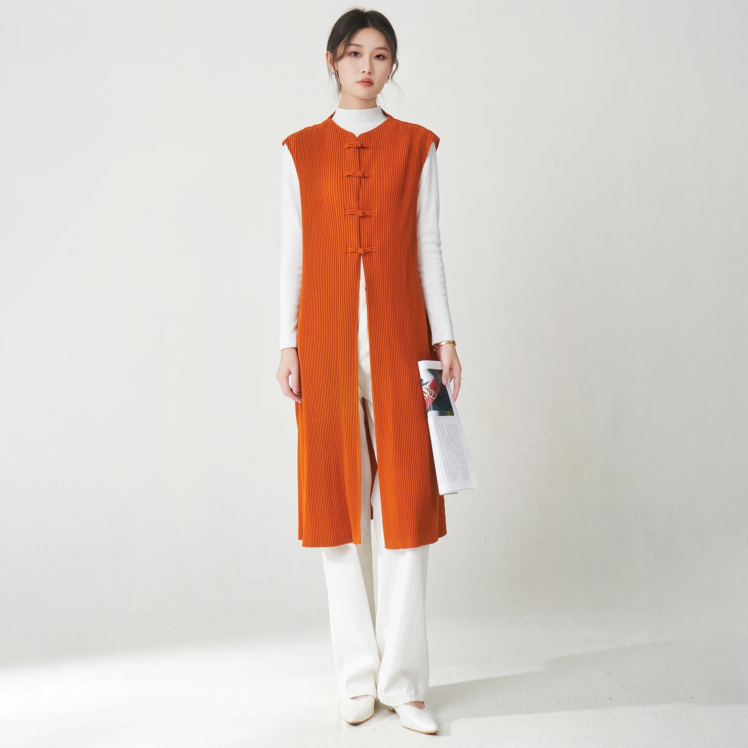 Wholesale Clothing Women's Vest Jacket Design Retro Fashion Top Sleeveless Button Autumn New Mid-length Miyake Jacket