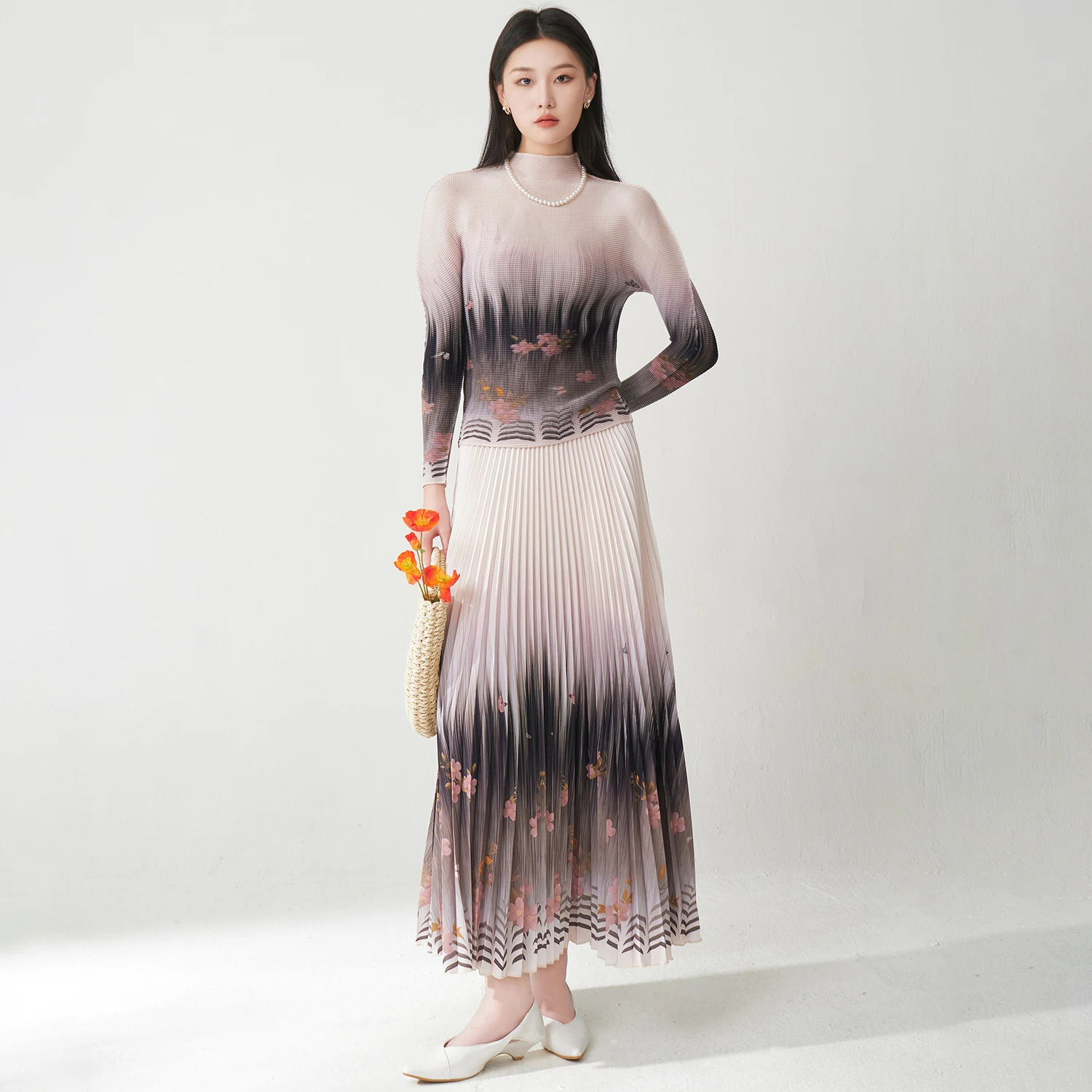 Factory Direct Sales Women's Elegant Two-piece Set Design Sense Printed Long-sleeved Top and Skirt Set Miyake Pleated Set