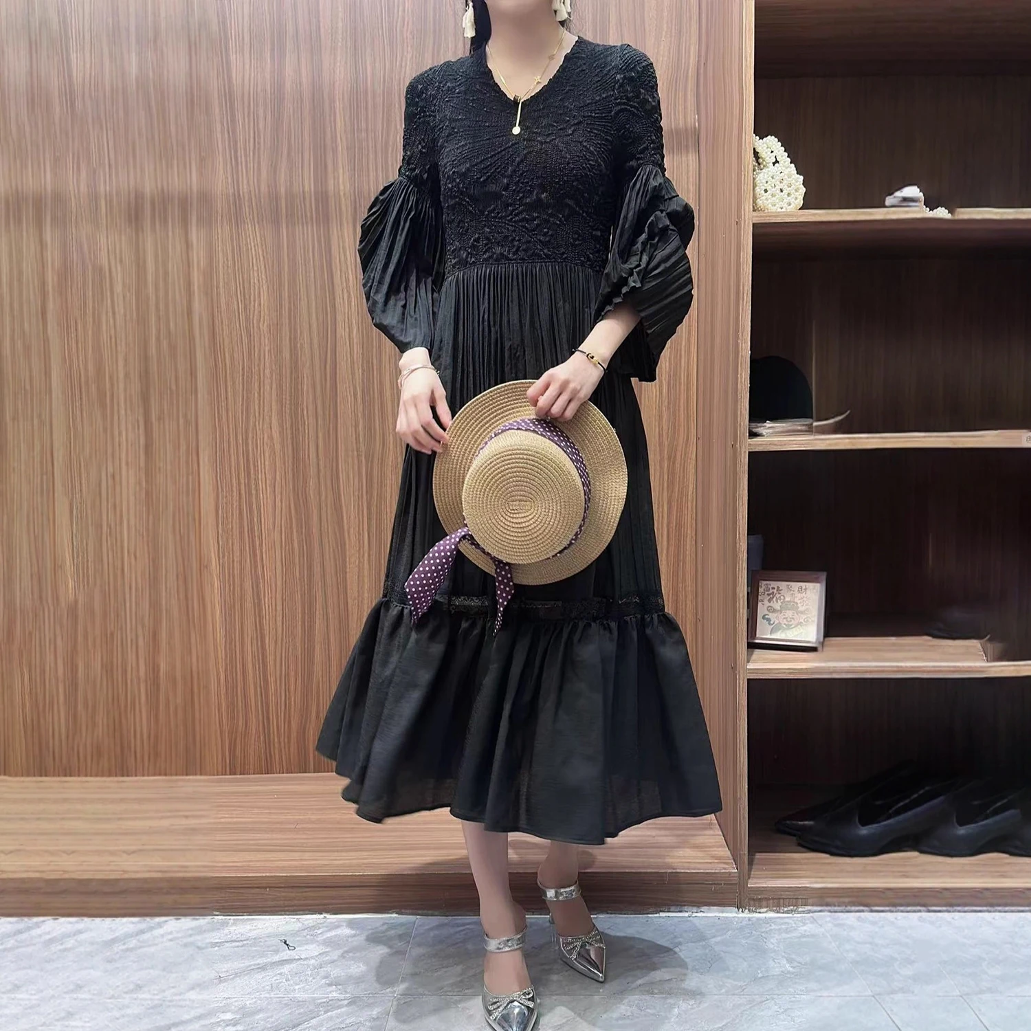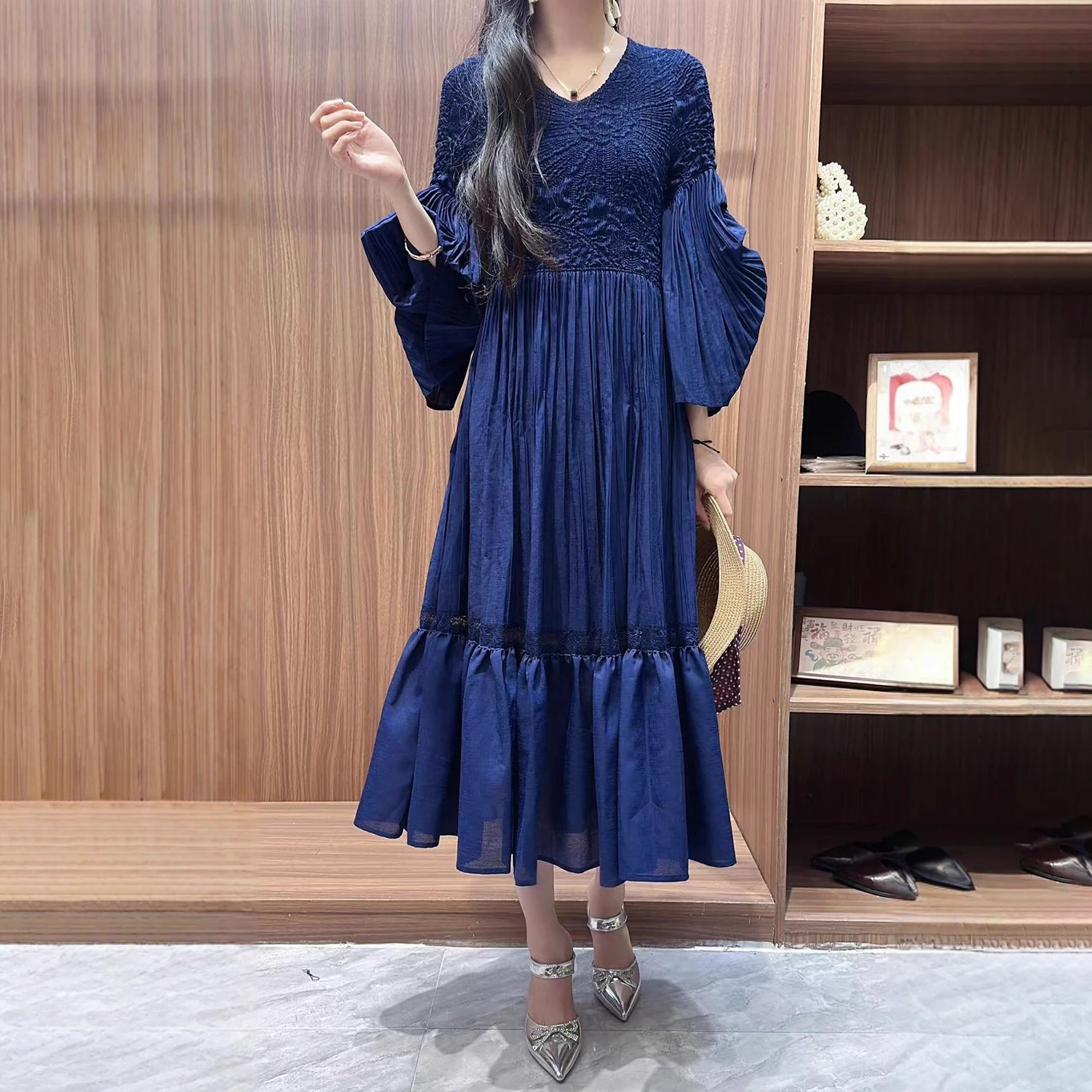 Factory Quality Fast Delivery Women's Fashion Dress Autumn Design V-neck Casual Dress Chic Pleated Dress