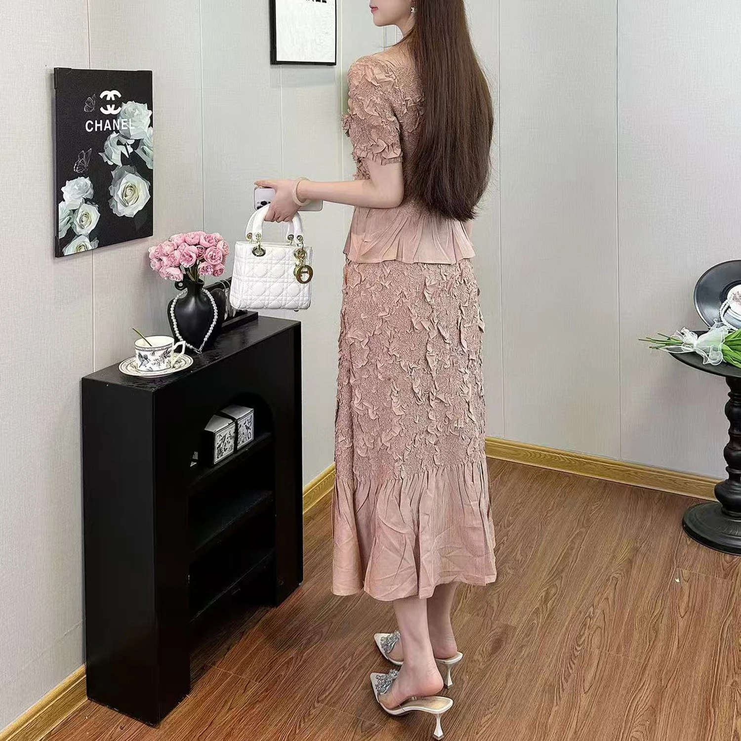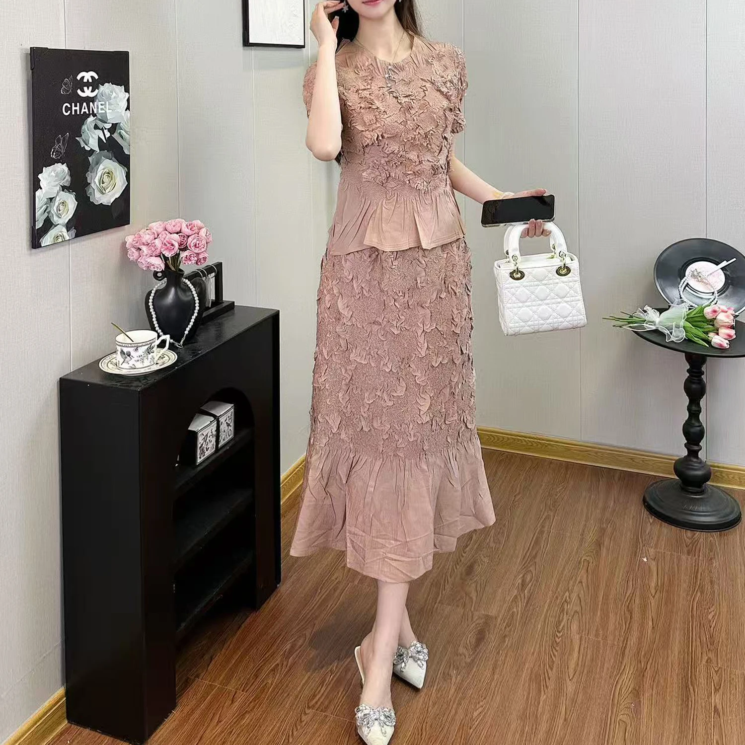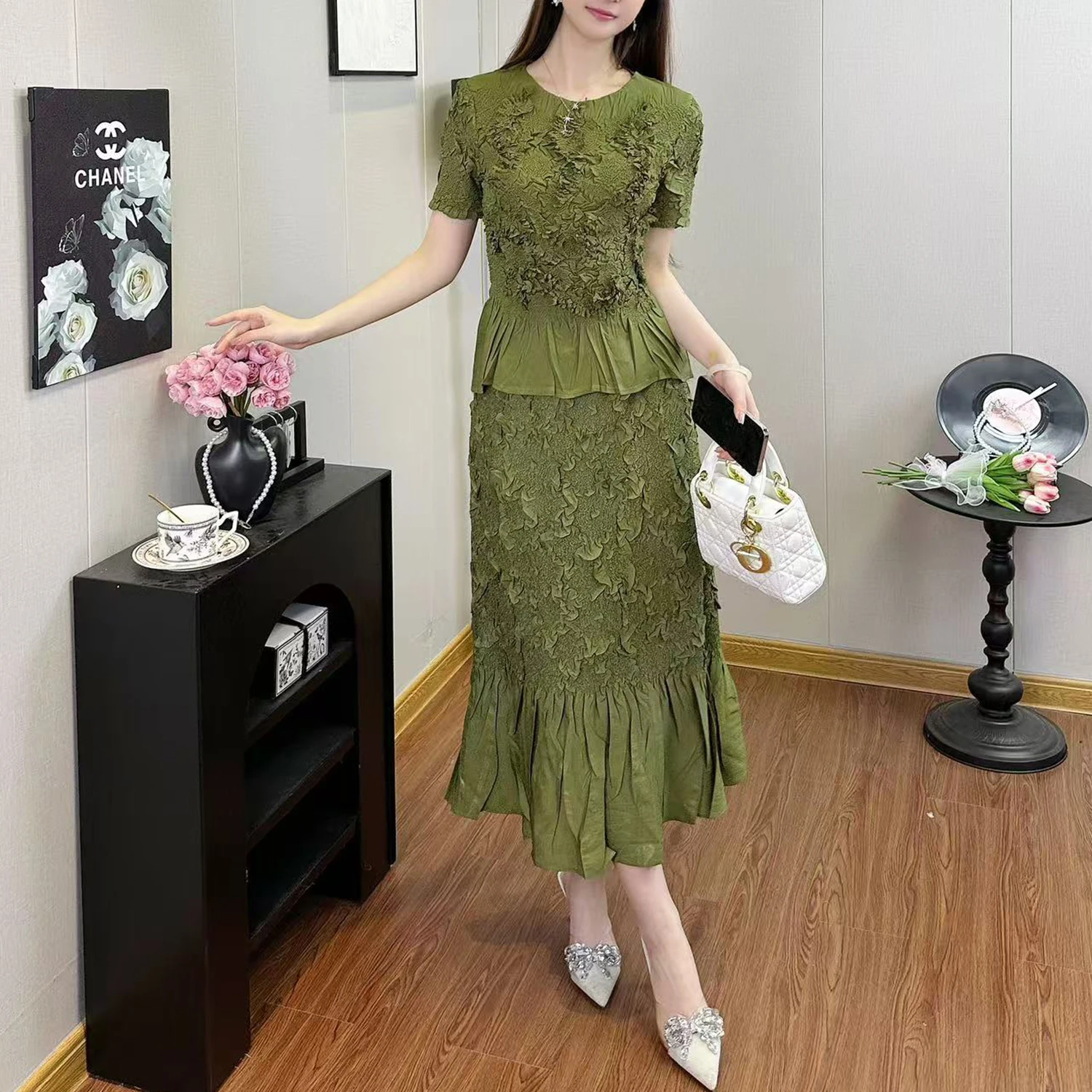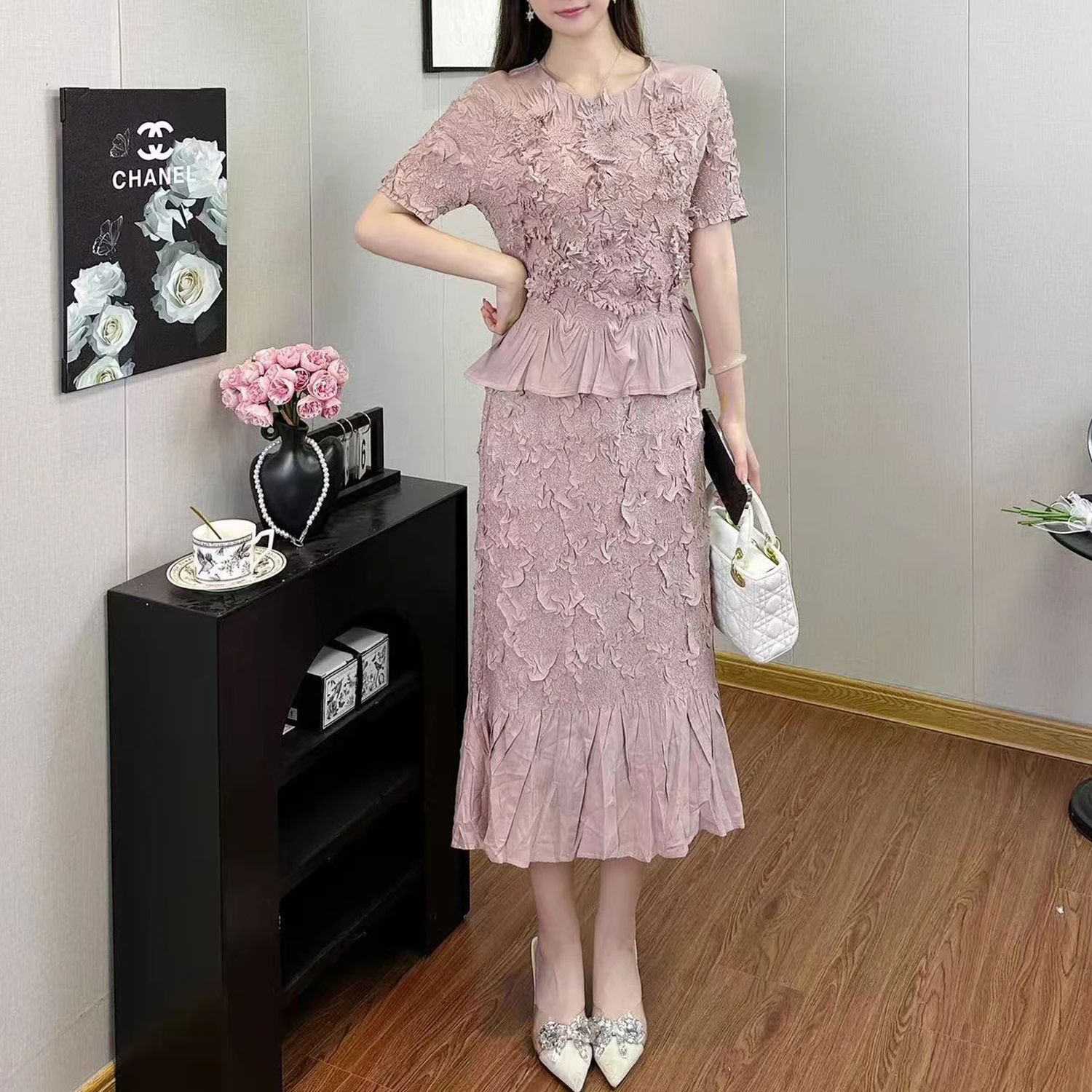 Factory Wholesale Women's Fashion Set Designer Embroidered Short Sleeves and Skirt Suits Miyake Pleated Two-piece Set