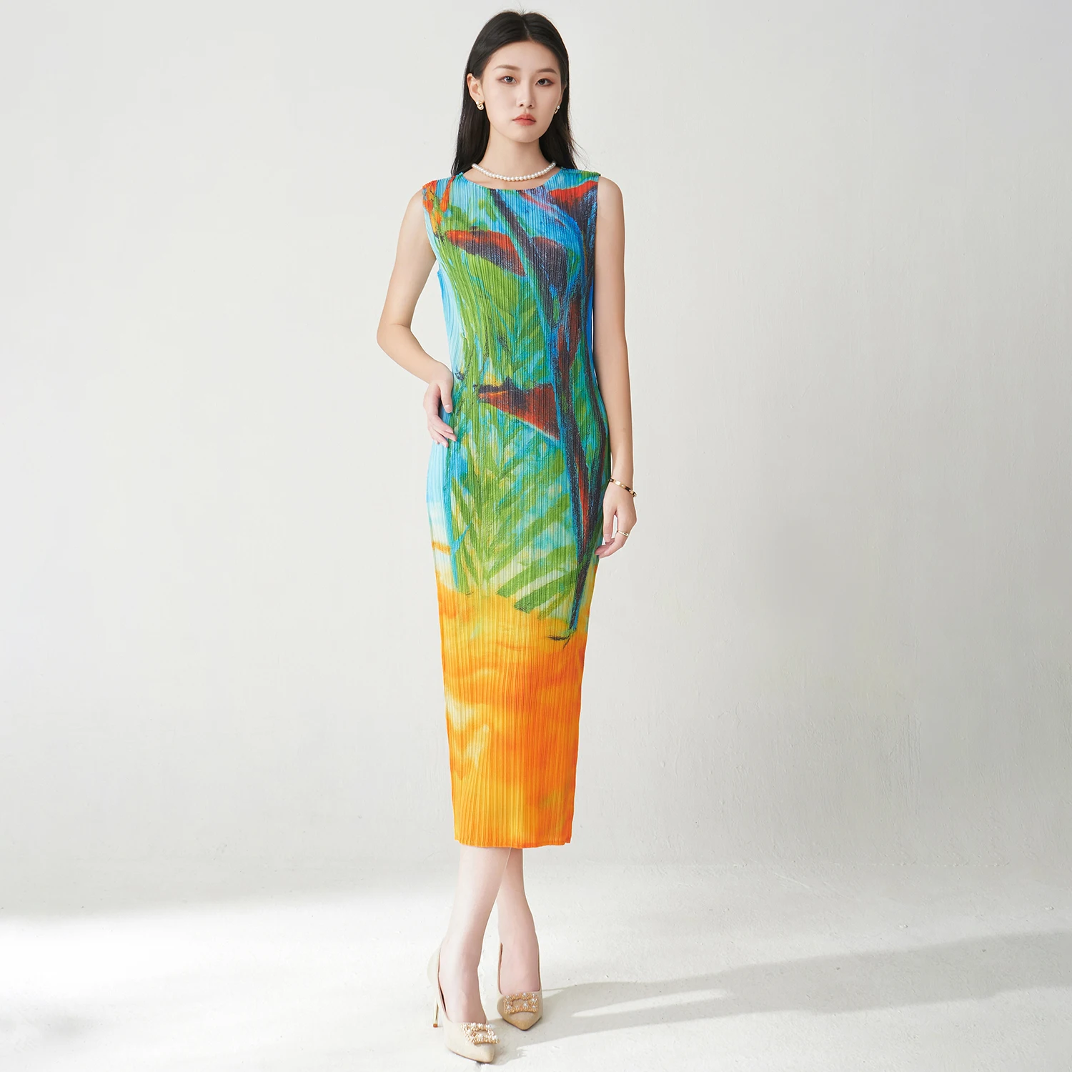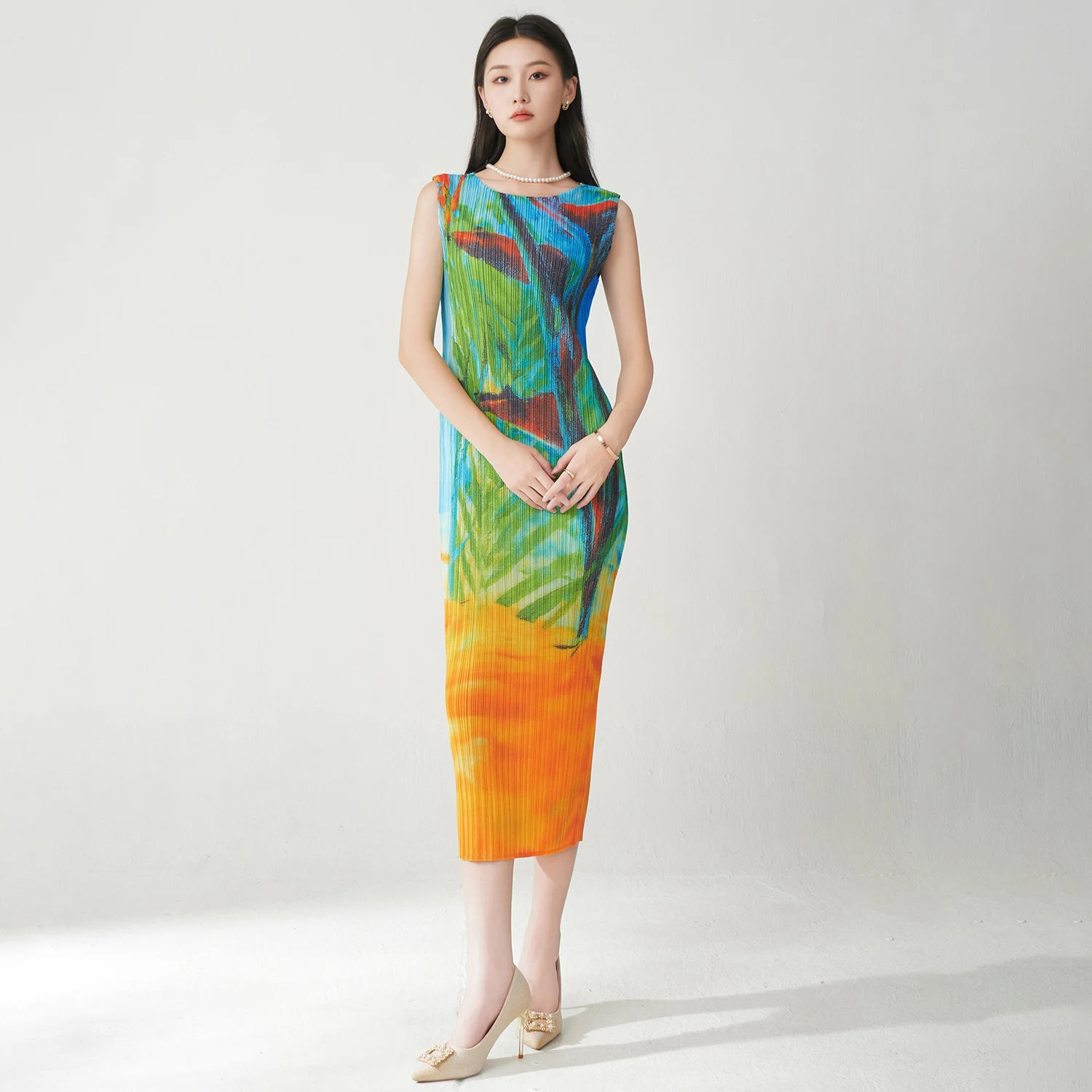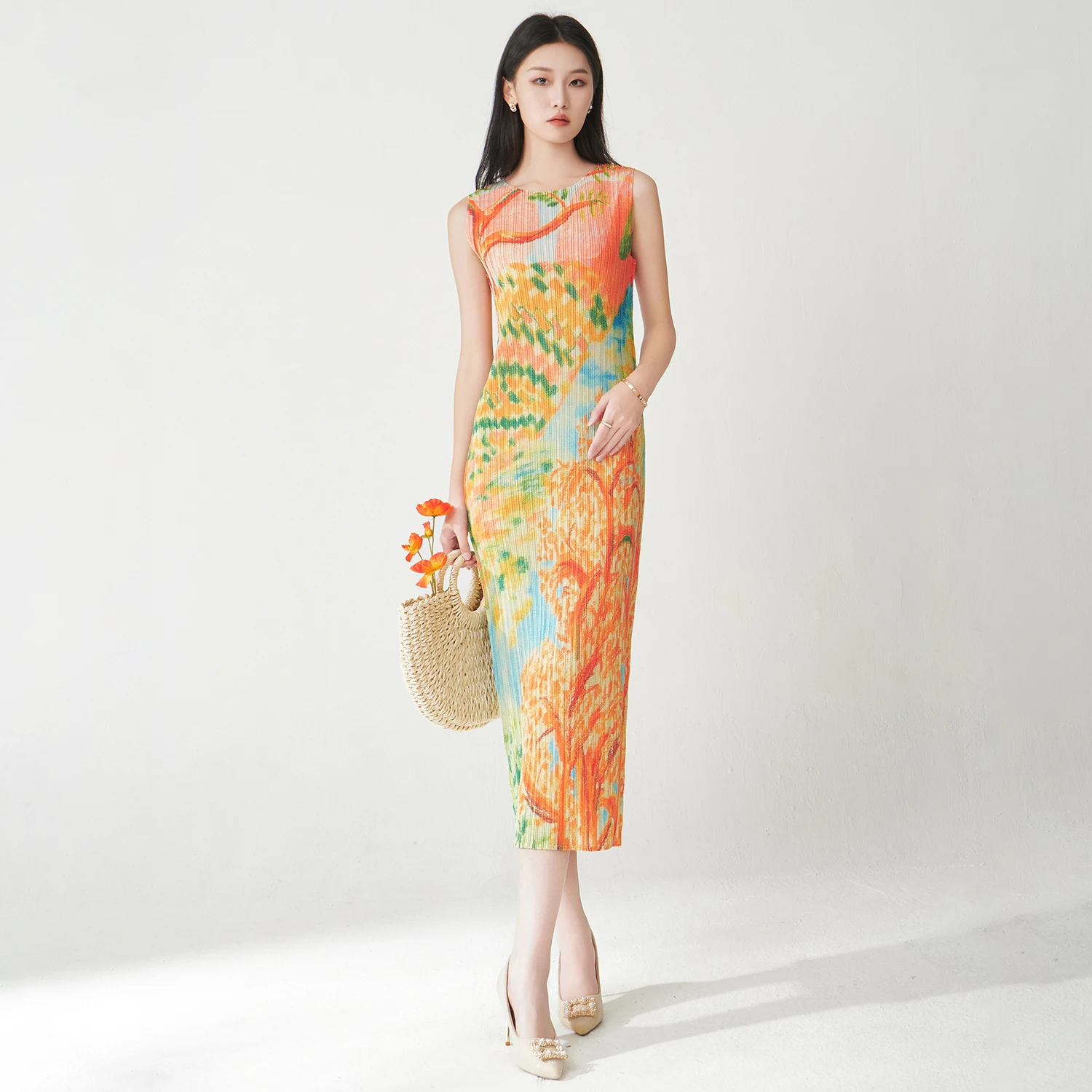 Women Elegant Summer Casual Dresses High Quality Stretch Straight Pleated Printed Dress Factory Polyester Fabric