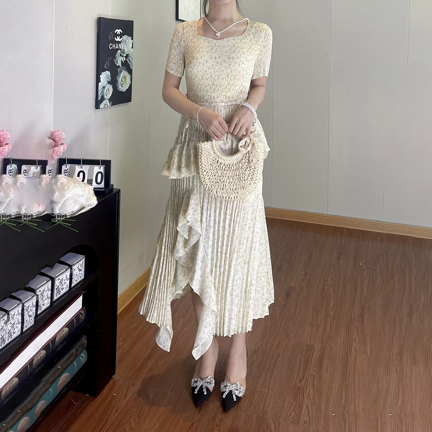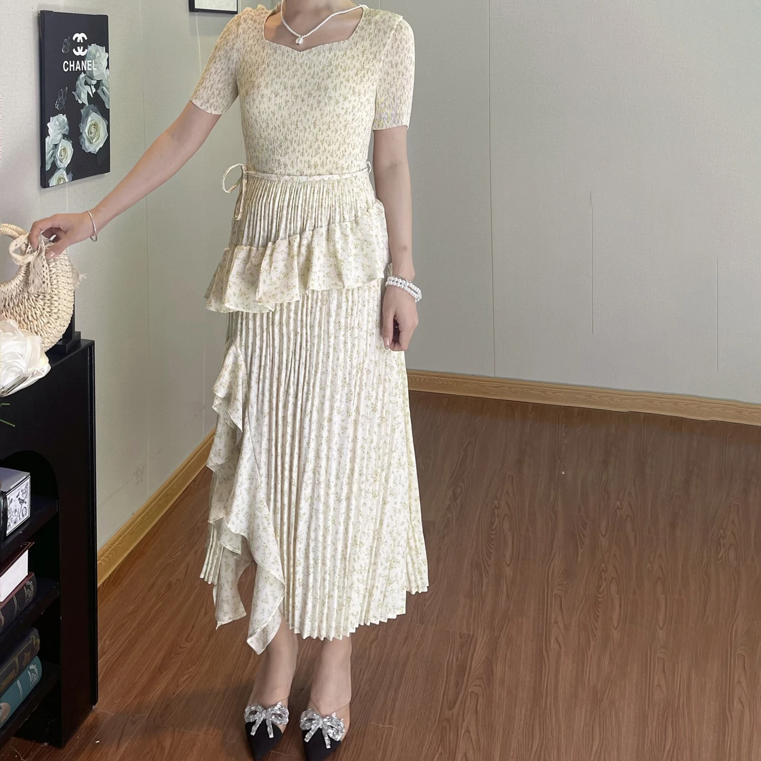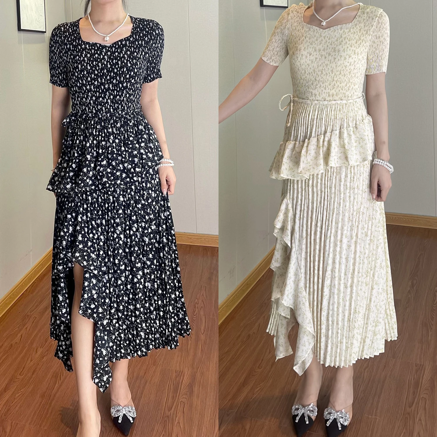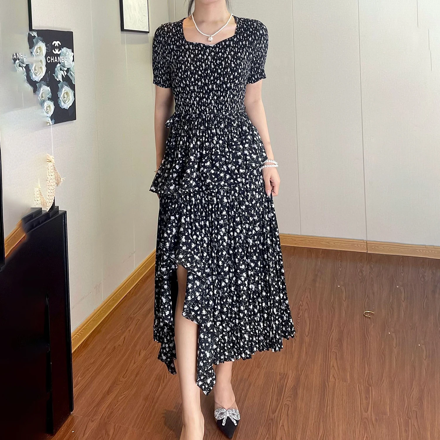 Summer Women's Fashion Dress Polyester Fabric High Quality Pleated Print Design Casual Dress