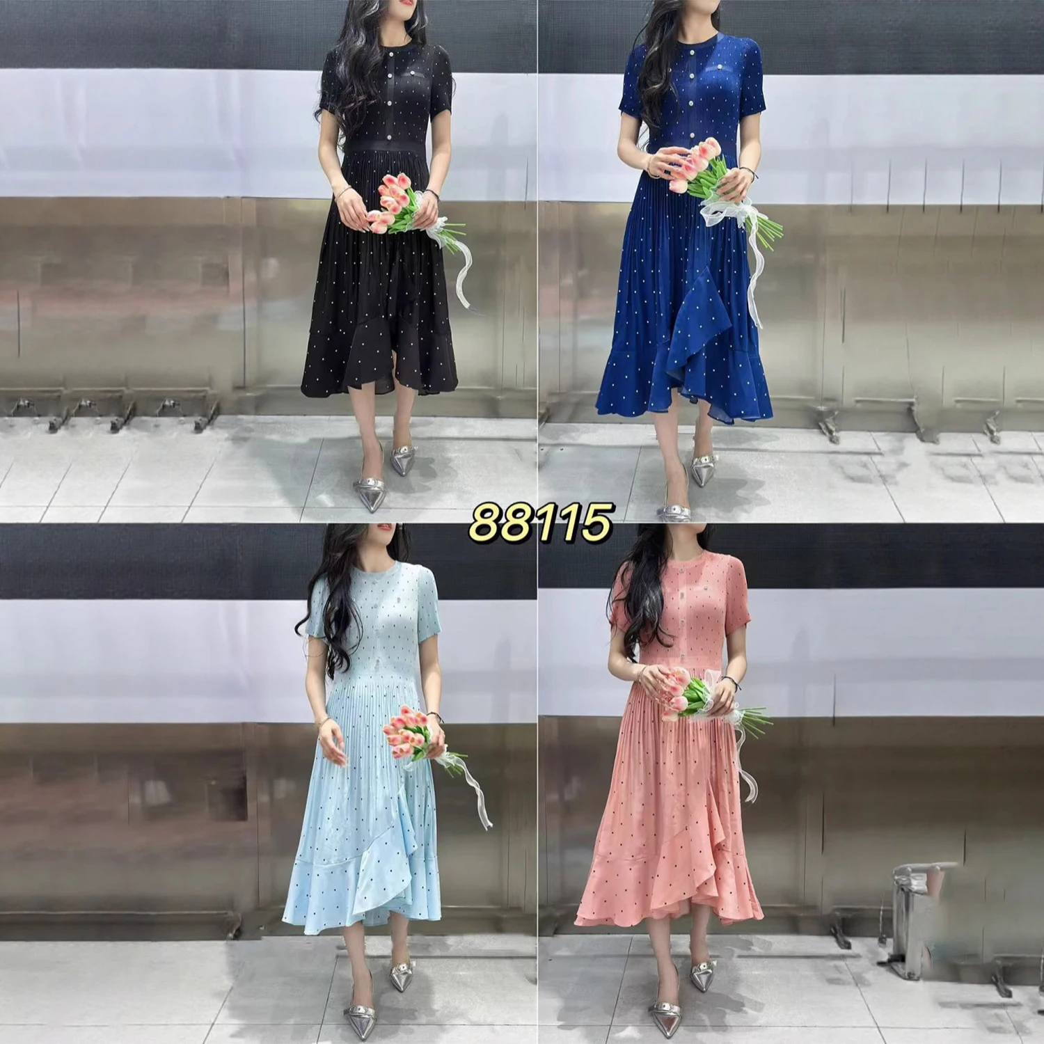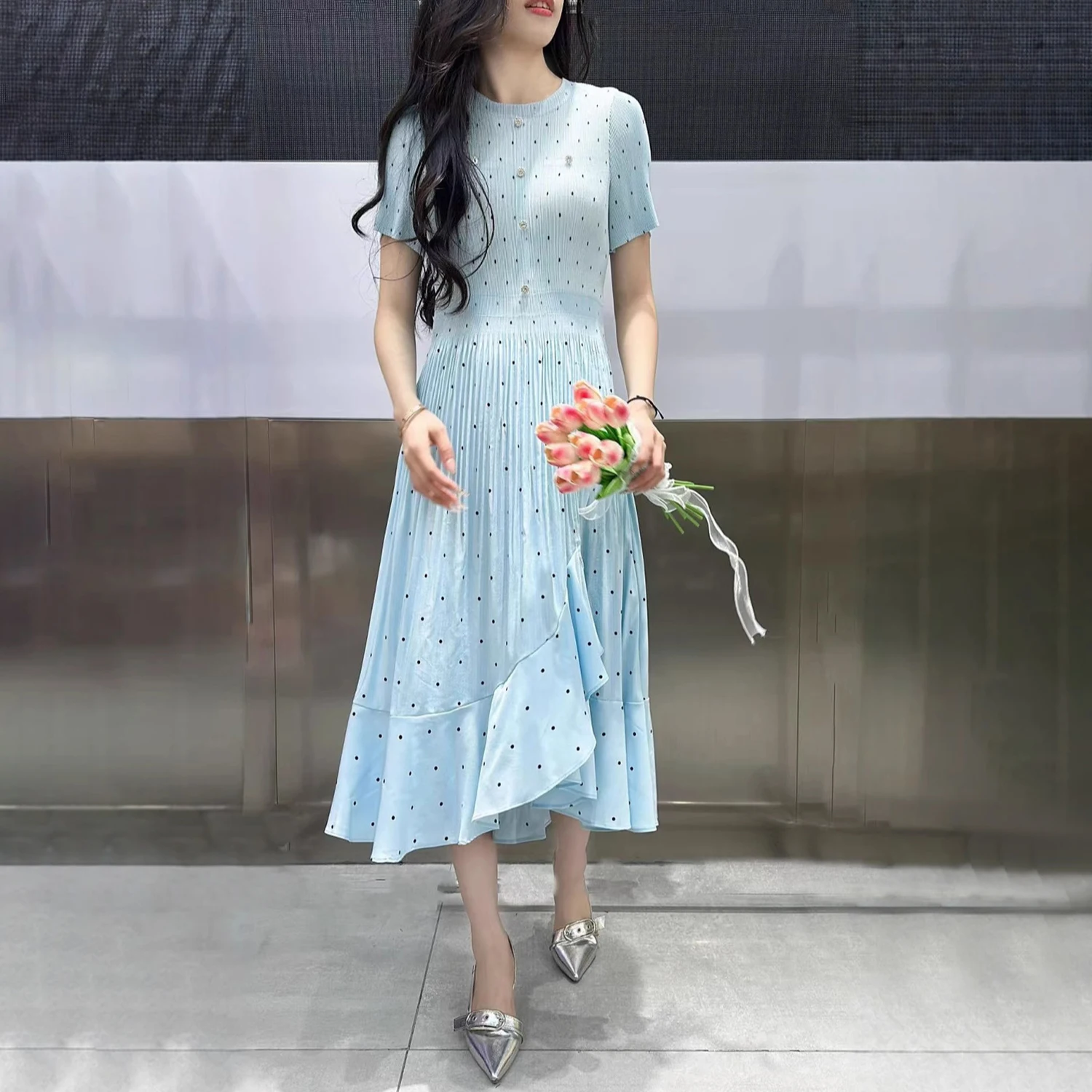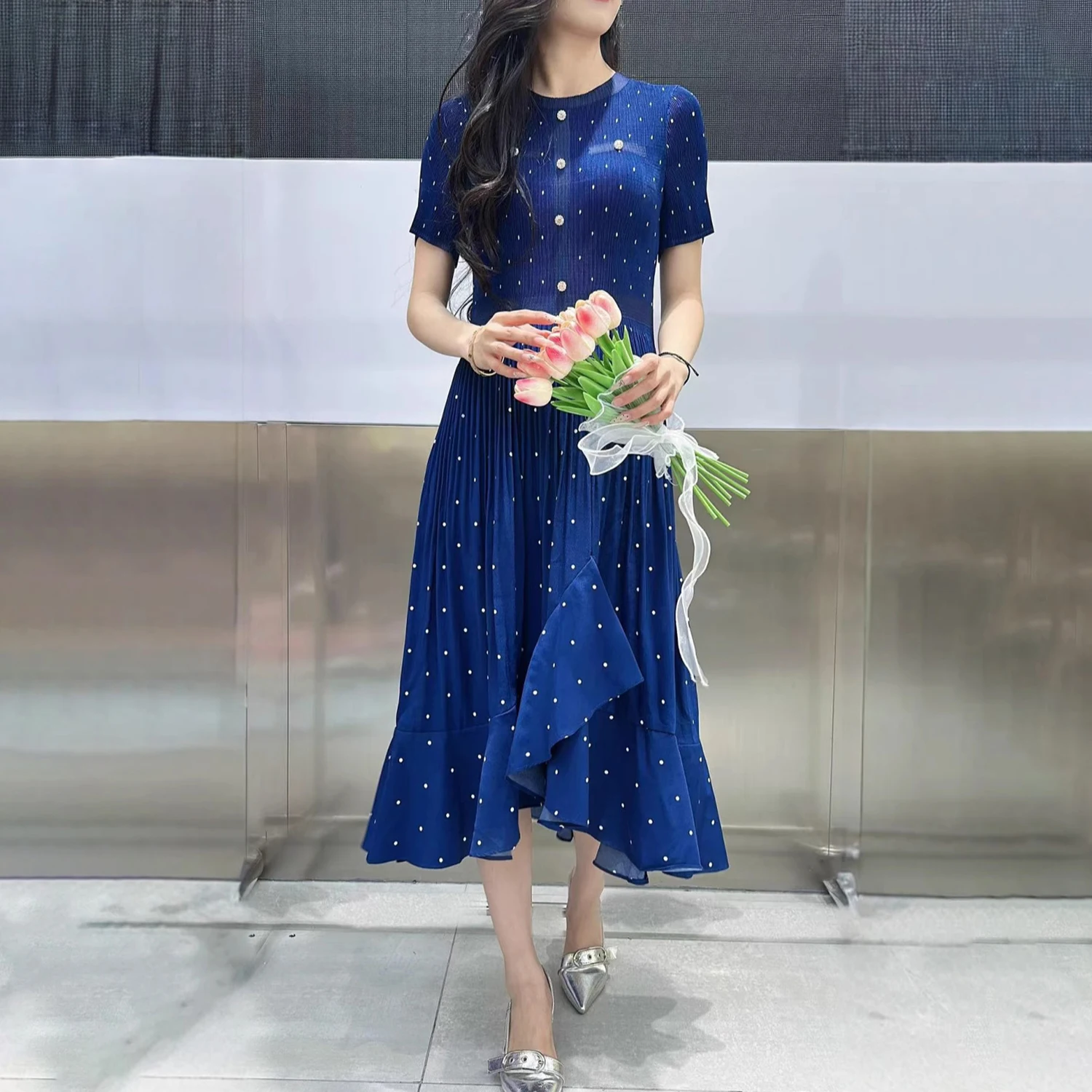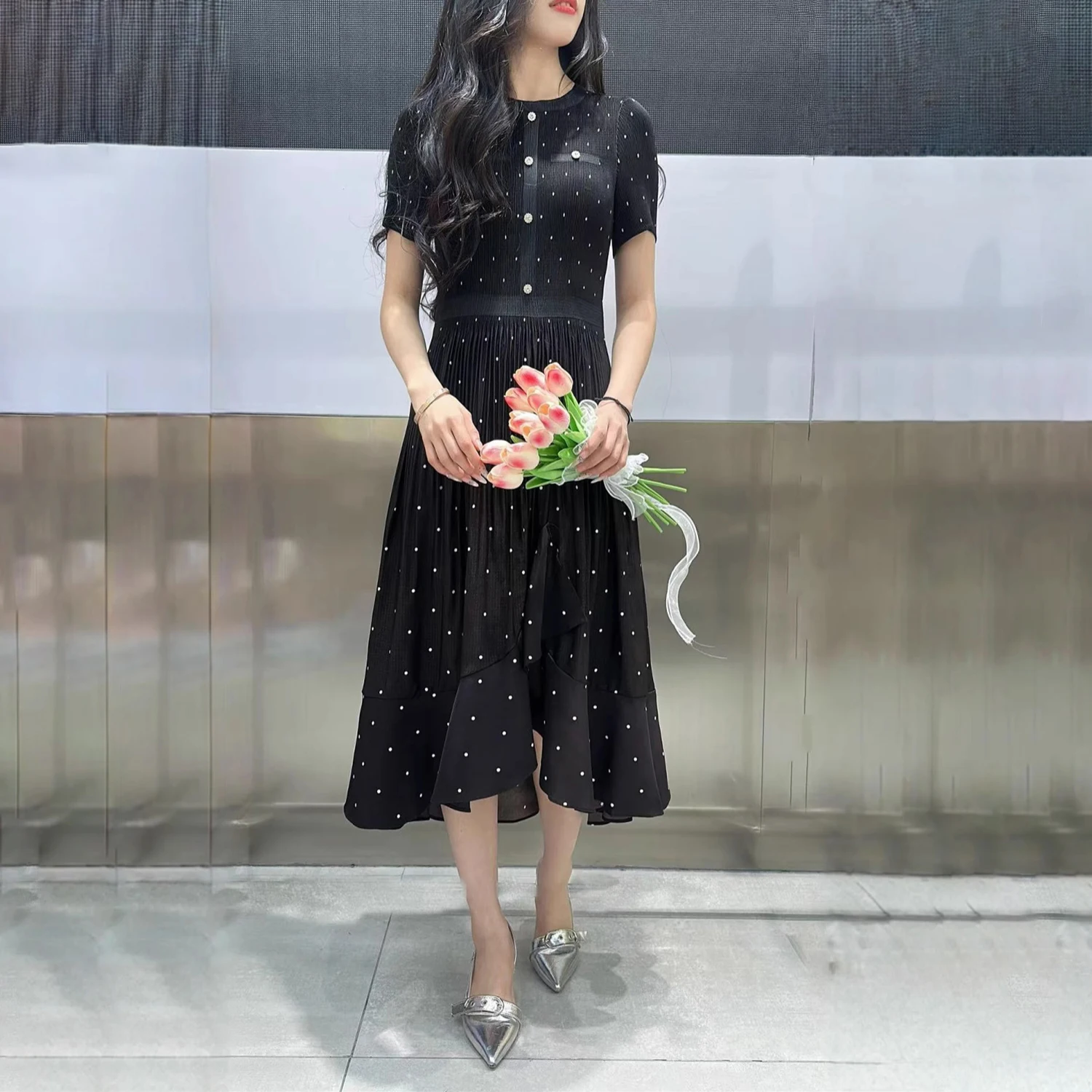 New Arrival 2025 Women's Elegant Dress Summer Short Sleeve Polka Dot Office Dress Factory Wholesale One Size