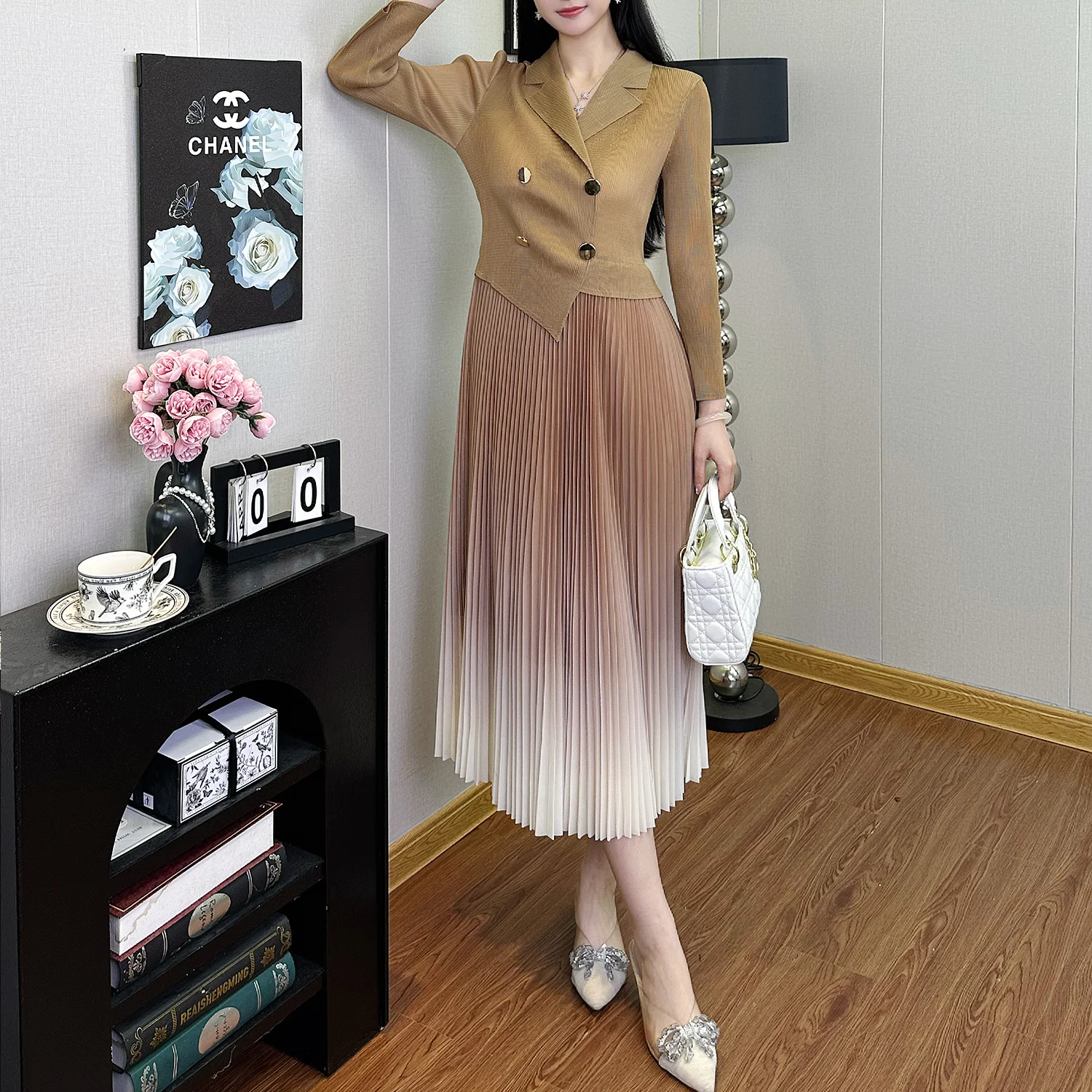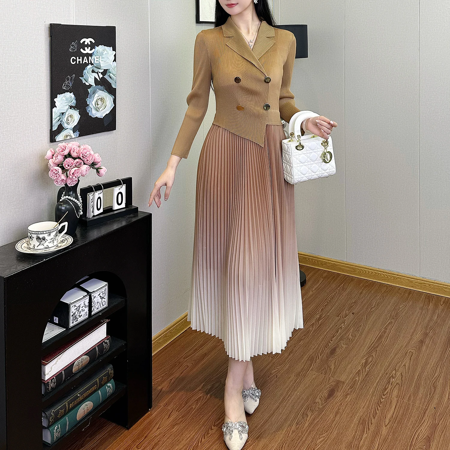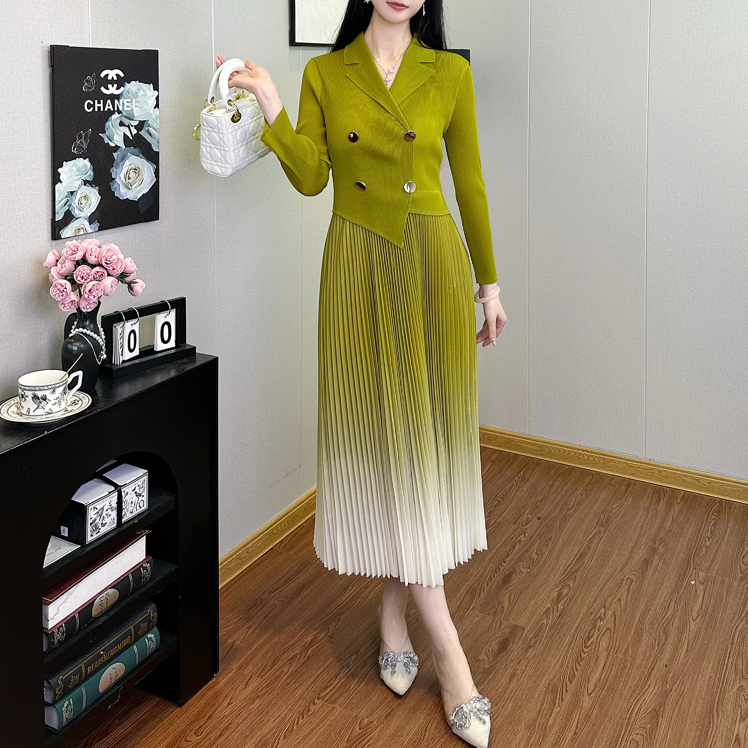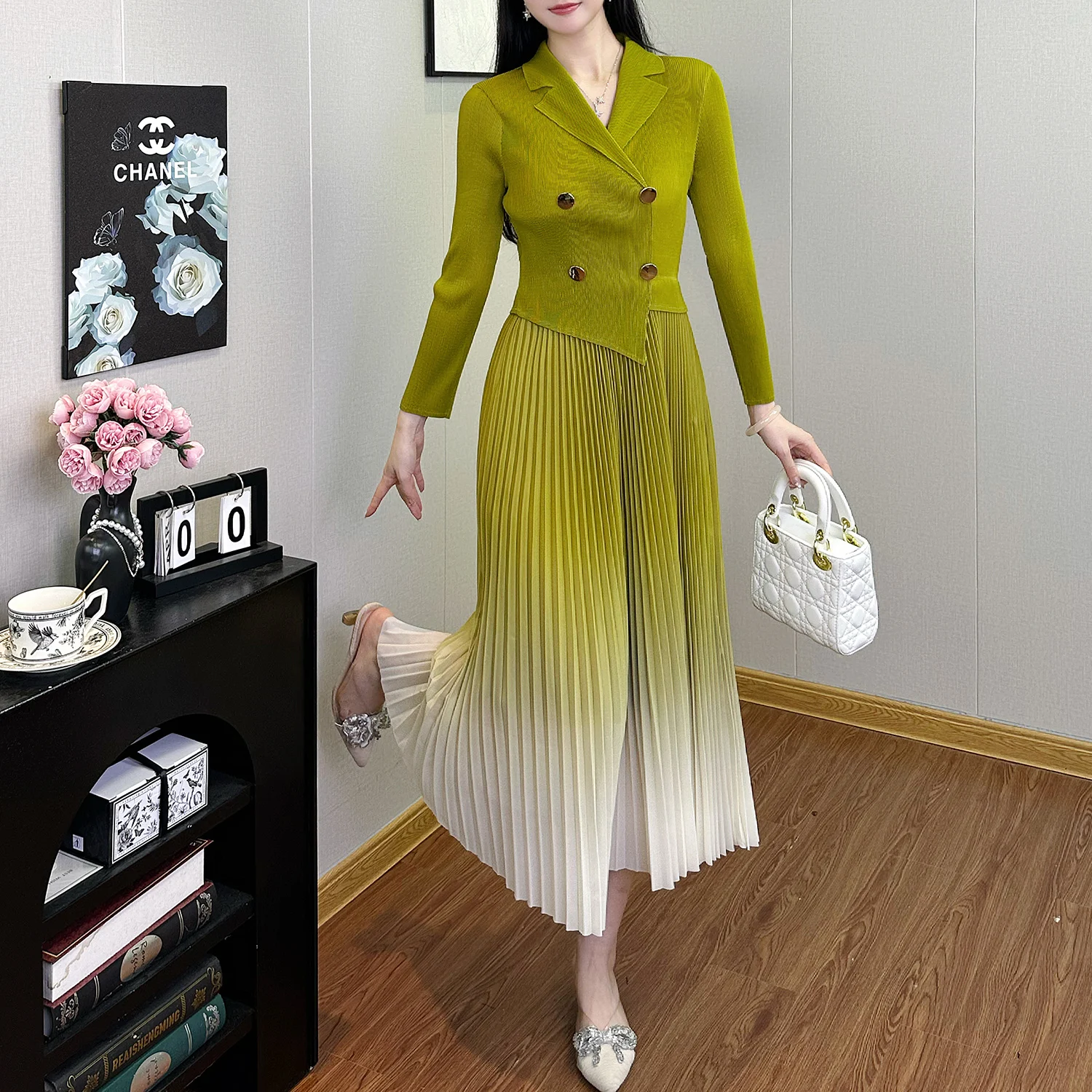 Women's Fashion Dress Pleated Print Gradient Color Stretch Office Dress Chic Casual Midi One Size Dress
