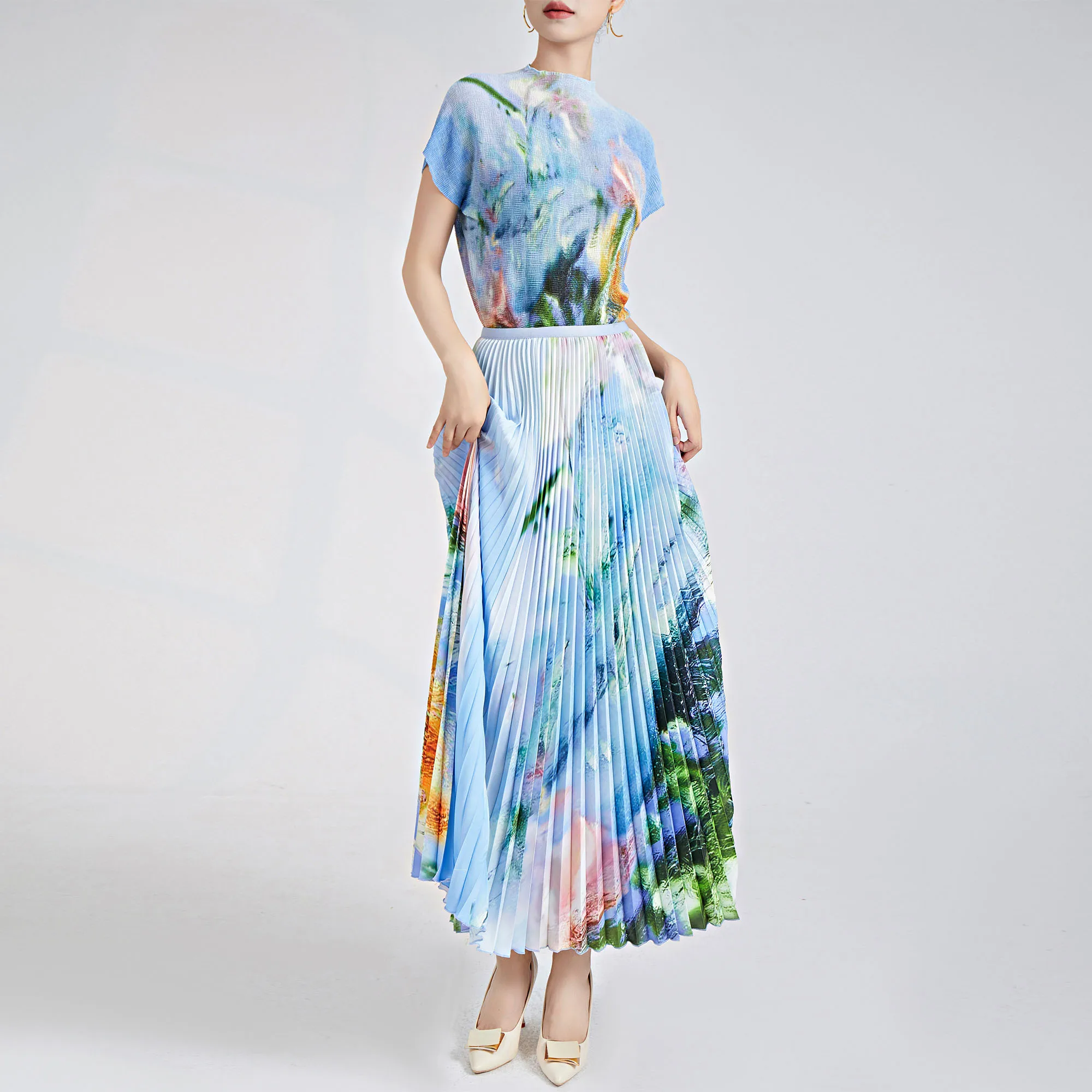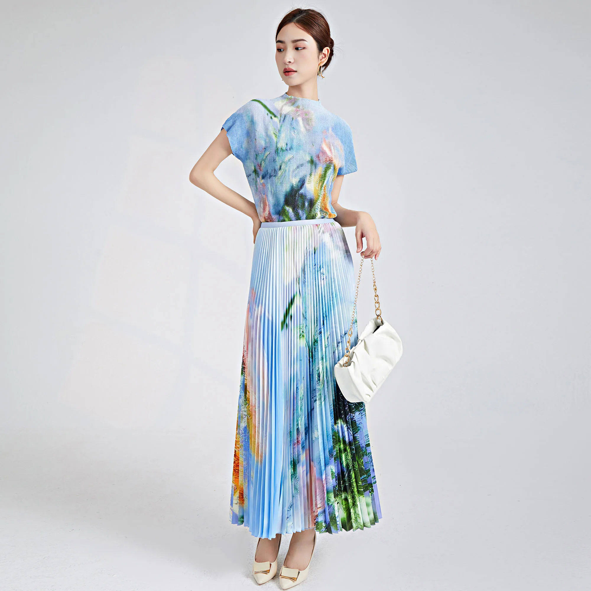 Wholesale Women Two-Piece Set Elegant High Waist 100% Polyester Midi Skirt Casual Pleated Skirt Set