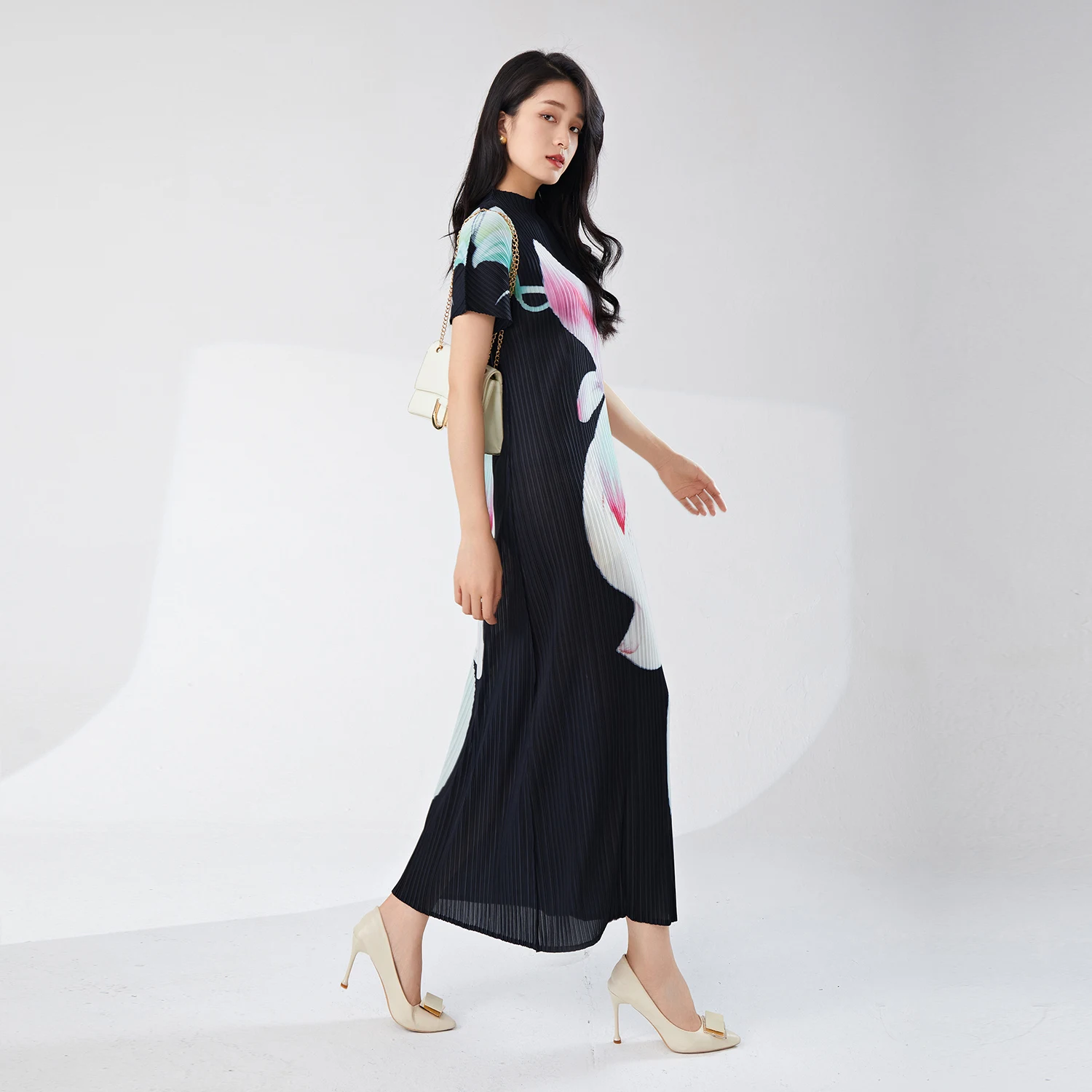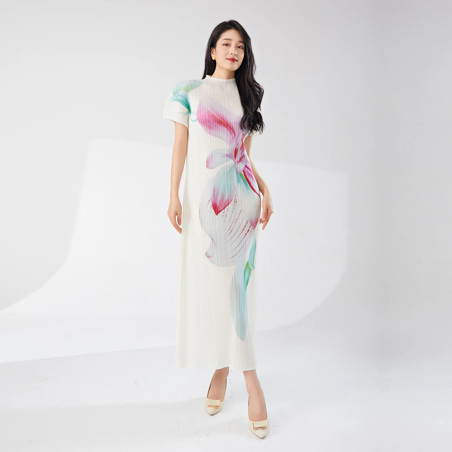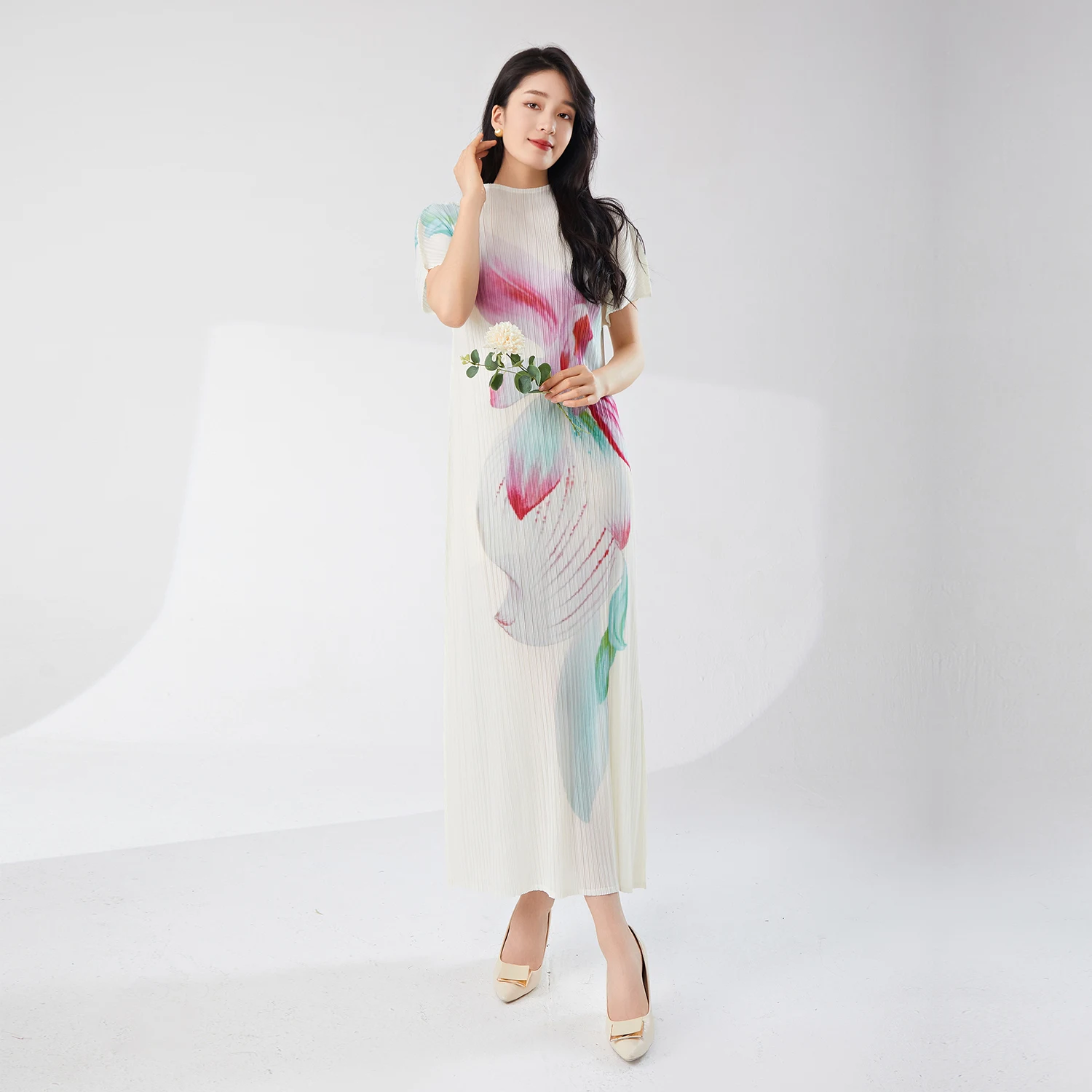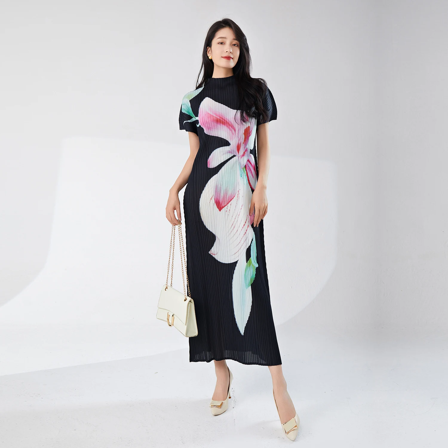 High Quality Ladies Fashion Dress Floral Printed Pleated Midi Length Loose Casual Summer Style Short Sleeves Dress Hot Sale