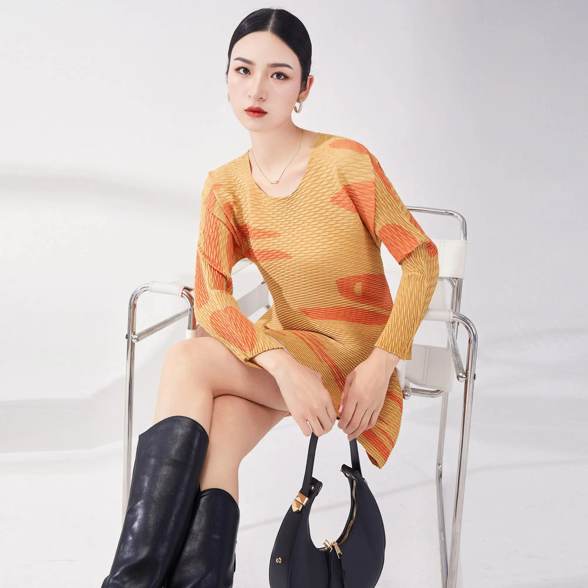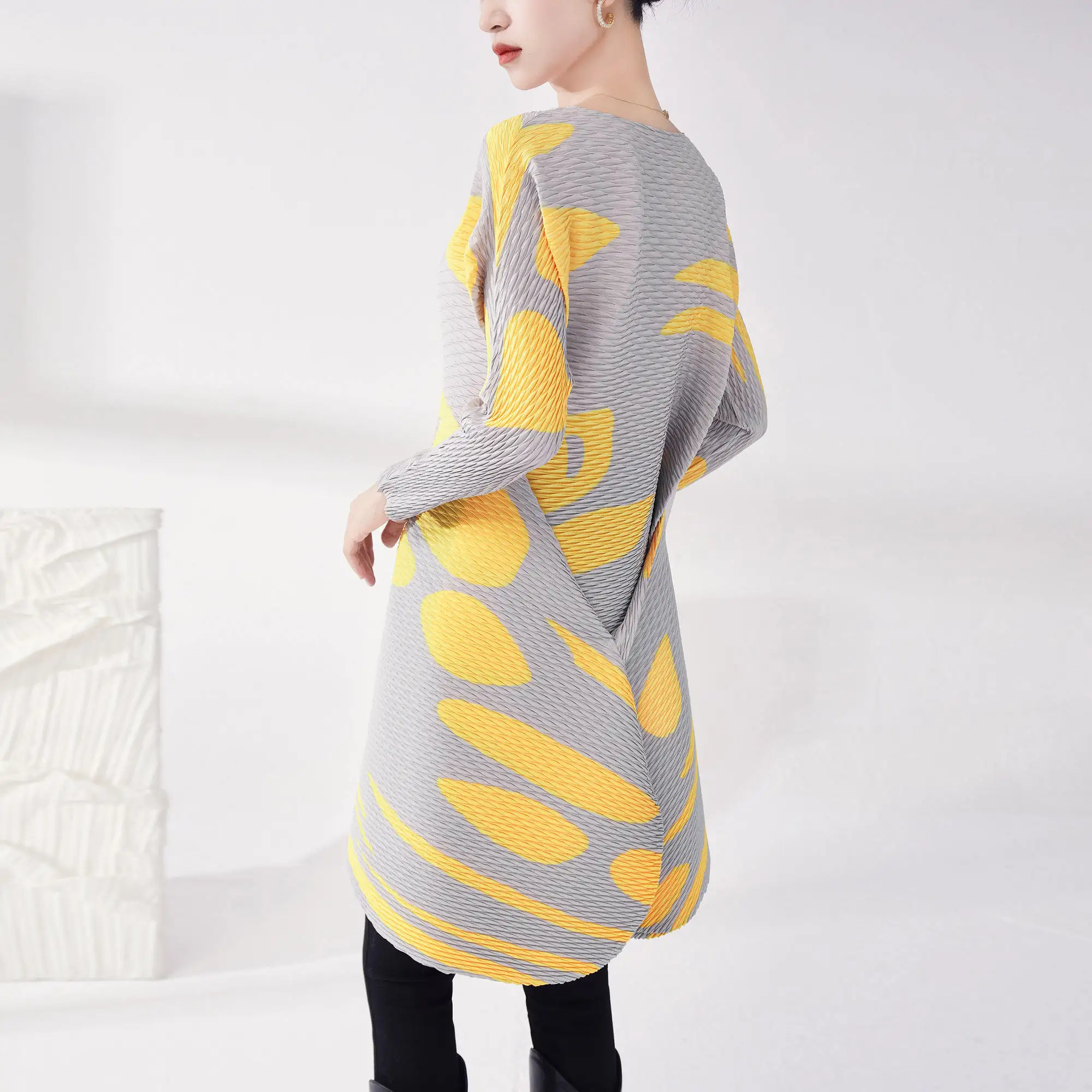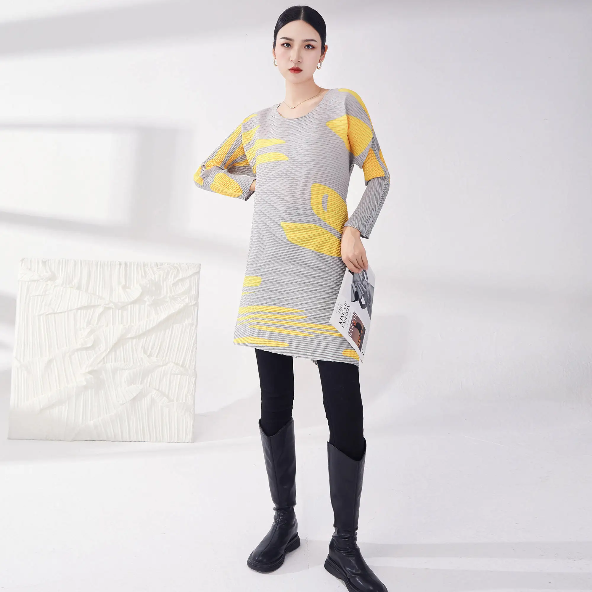 Women's Miyake Pleated Top Long Sleeve Casual Loose Fit Pleated Summer Fashion Dresses Woven Fabric Print Style Dresses