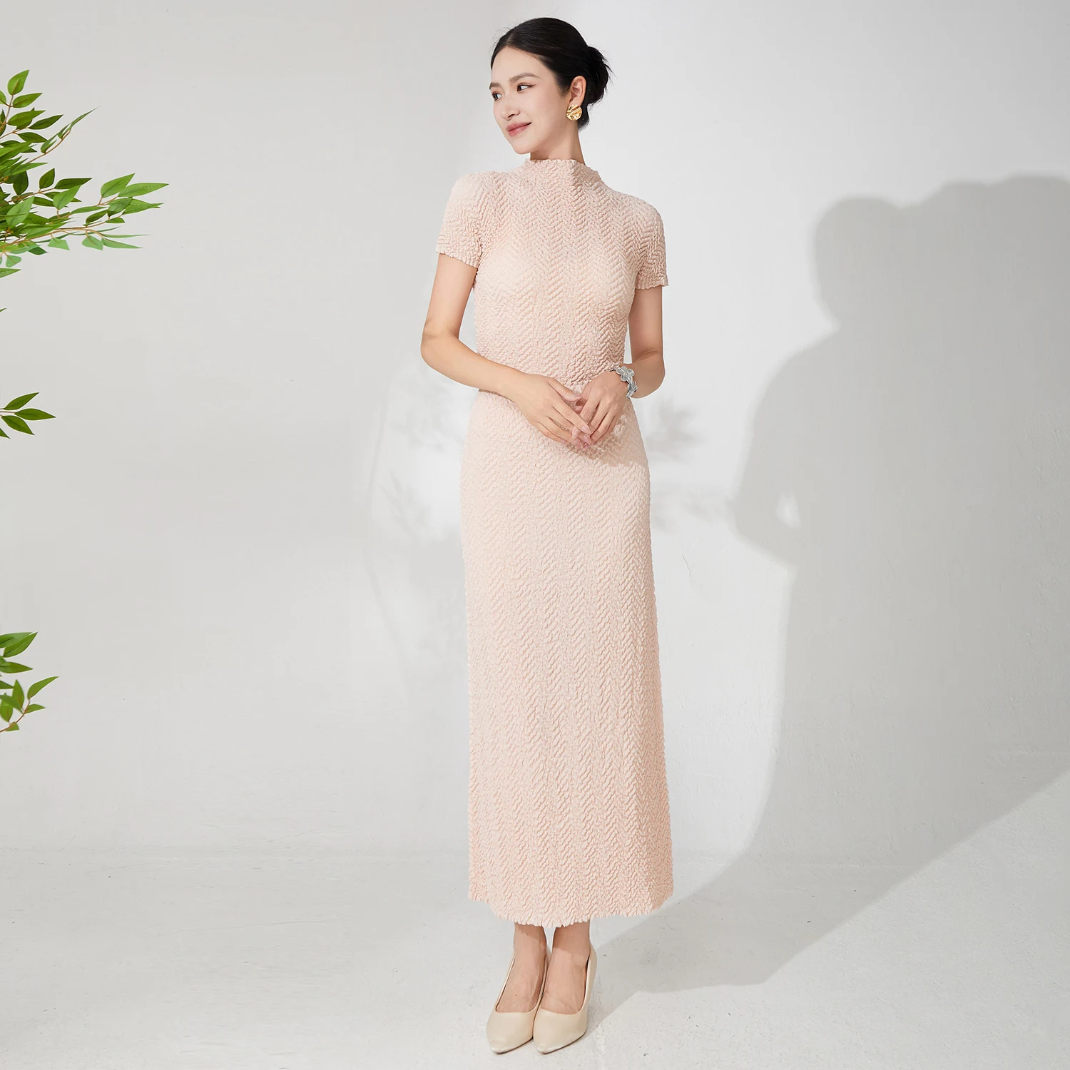 ZYHT 73907 Custom Design Long Sleeve High Neck Fashion Pleated Crystal Beads Ruched Knot High Slit Sexy Luxury Evening Dress