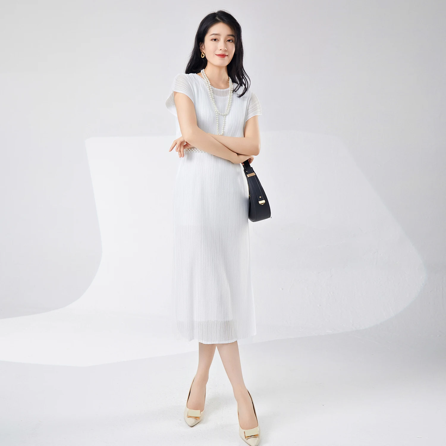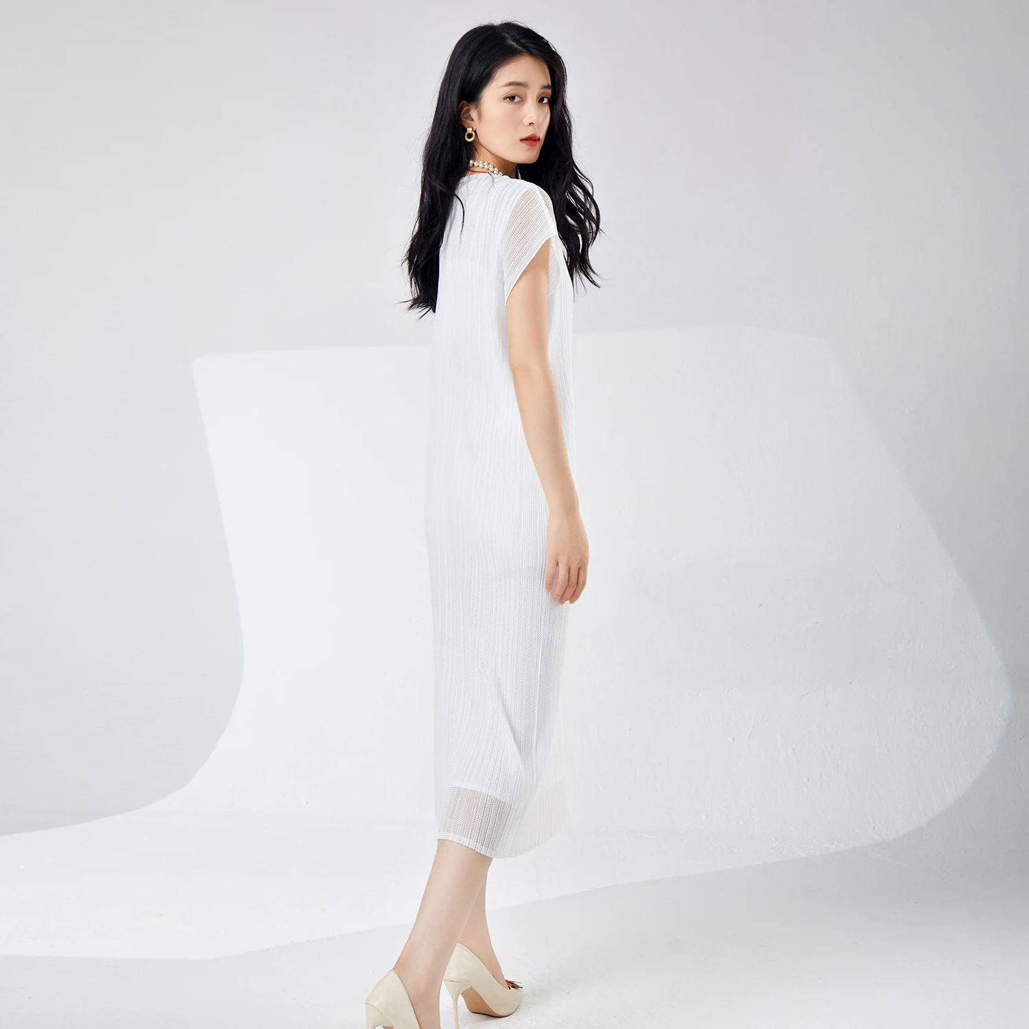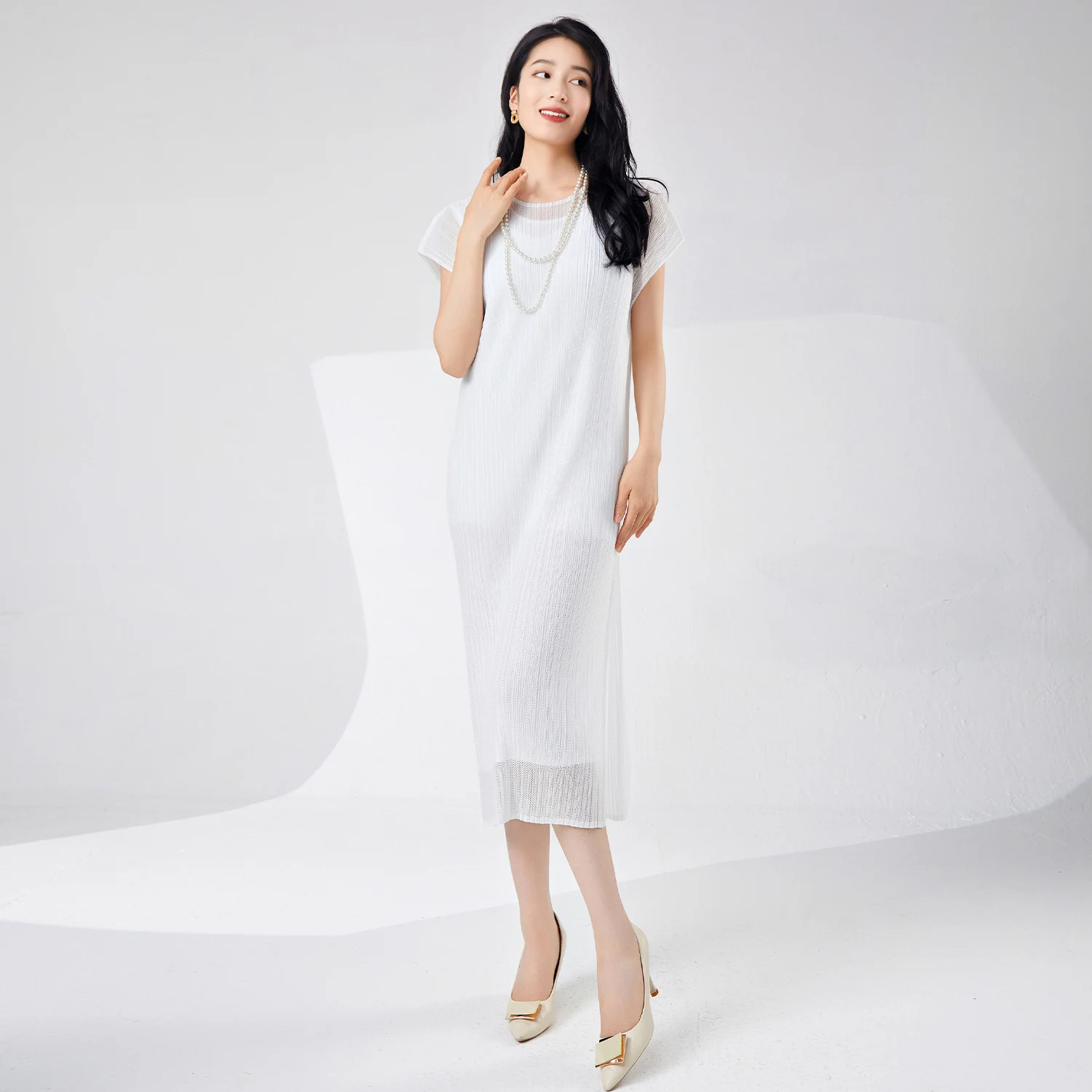 Ladies Pleated Casual Summer Fashion High Quality Stretch Mesh Women's Midi Dress Short Sleeve Plus Size Pleat Decoration