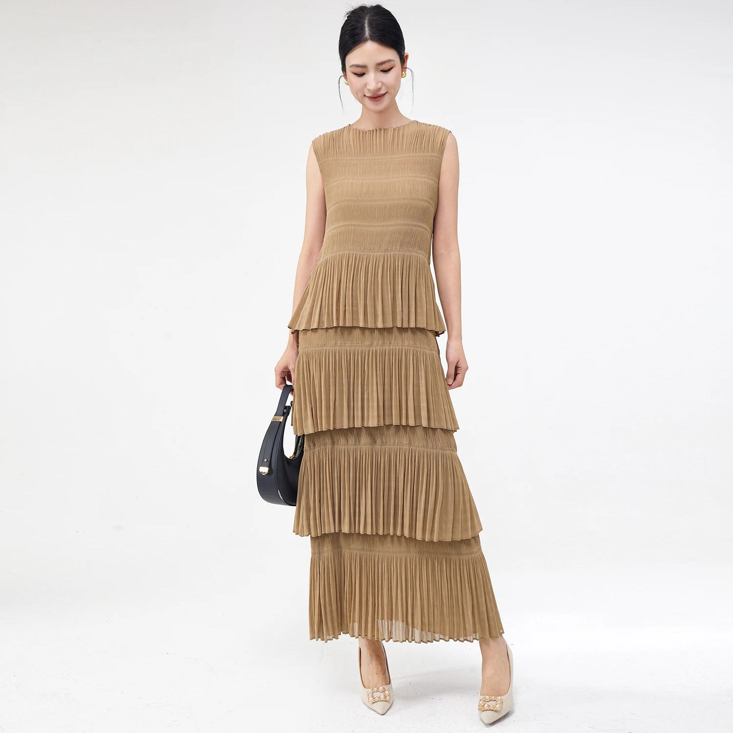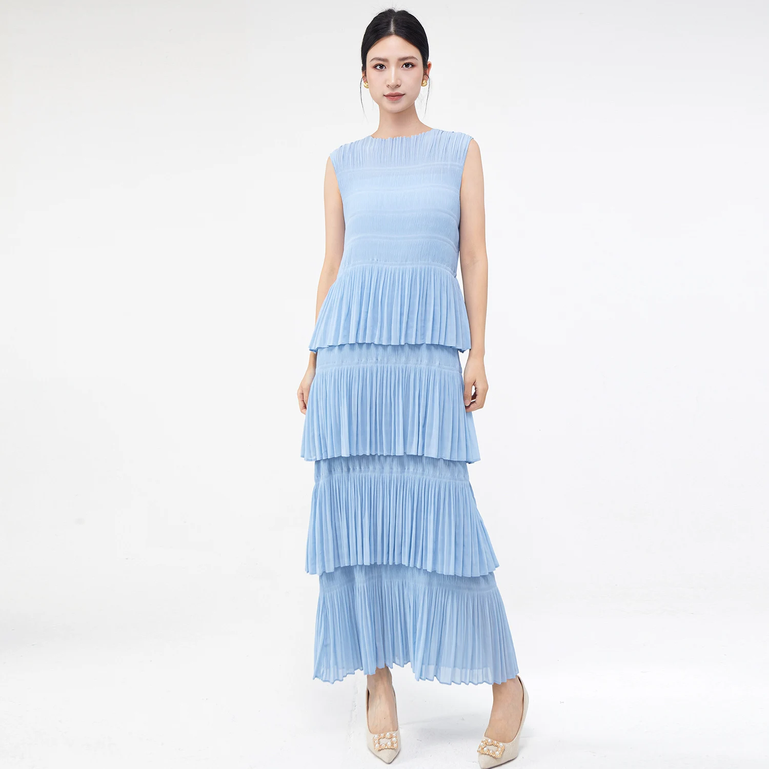 High Quality Women Fashion Dress Design Summer Ruffle Sleeveless Solid Color Party Dress