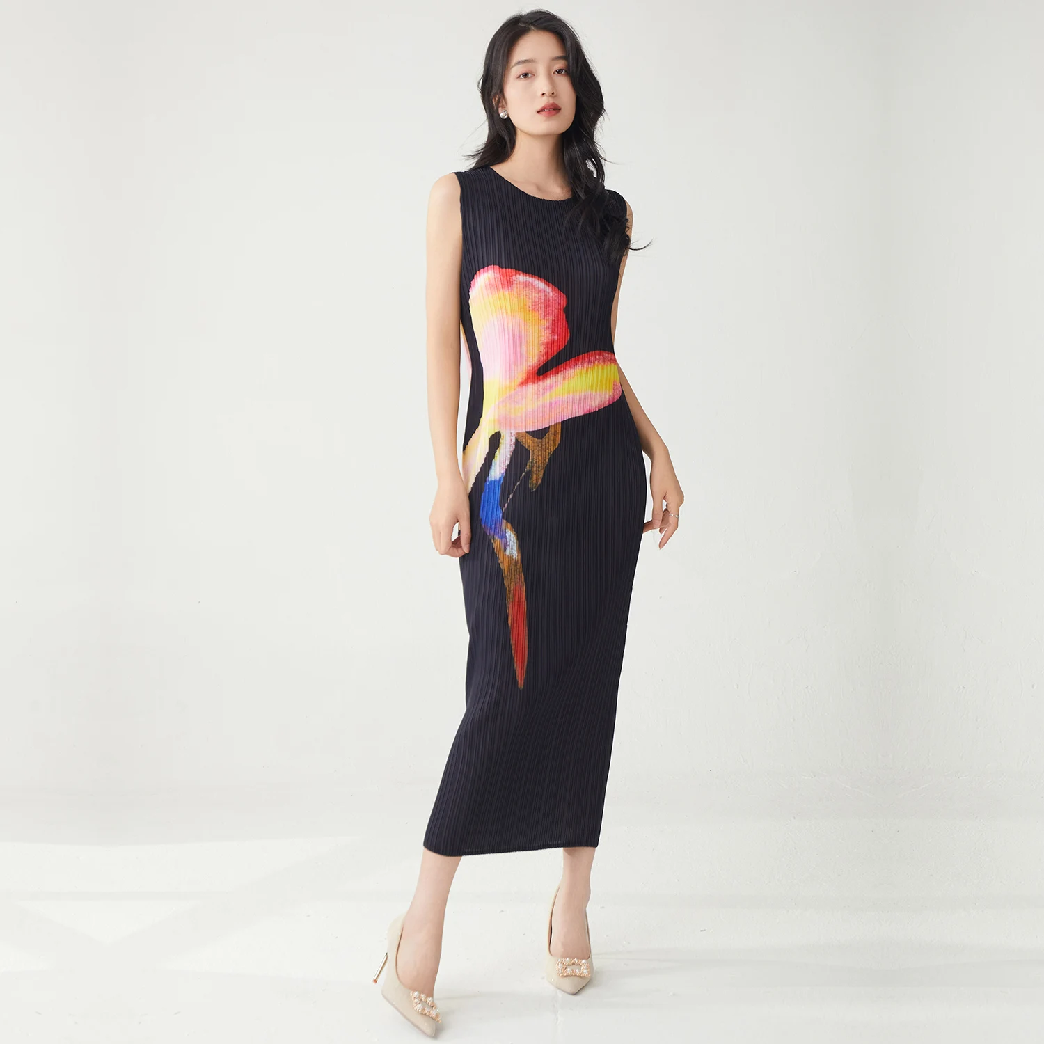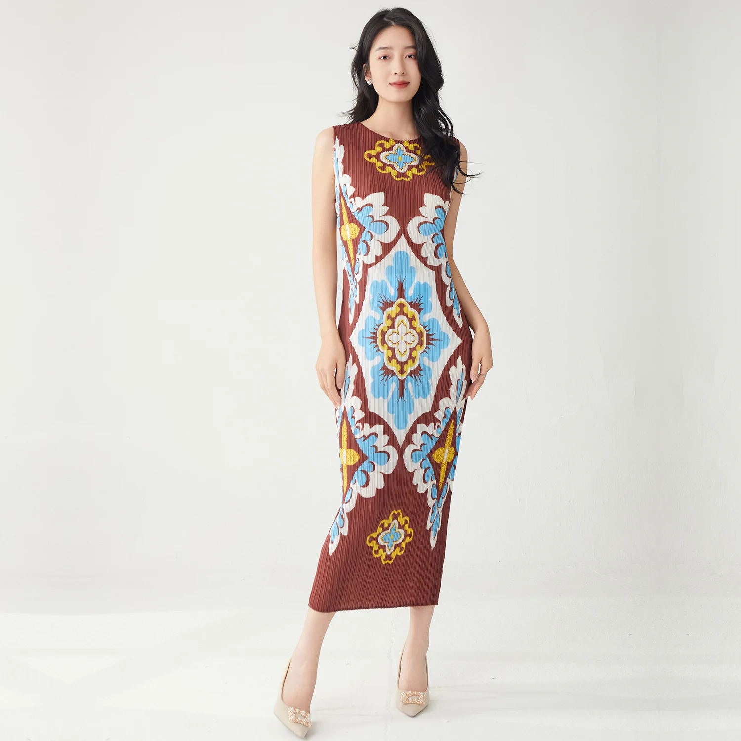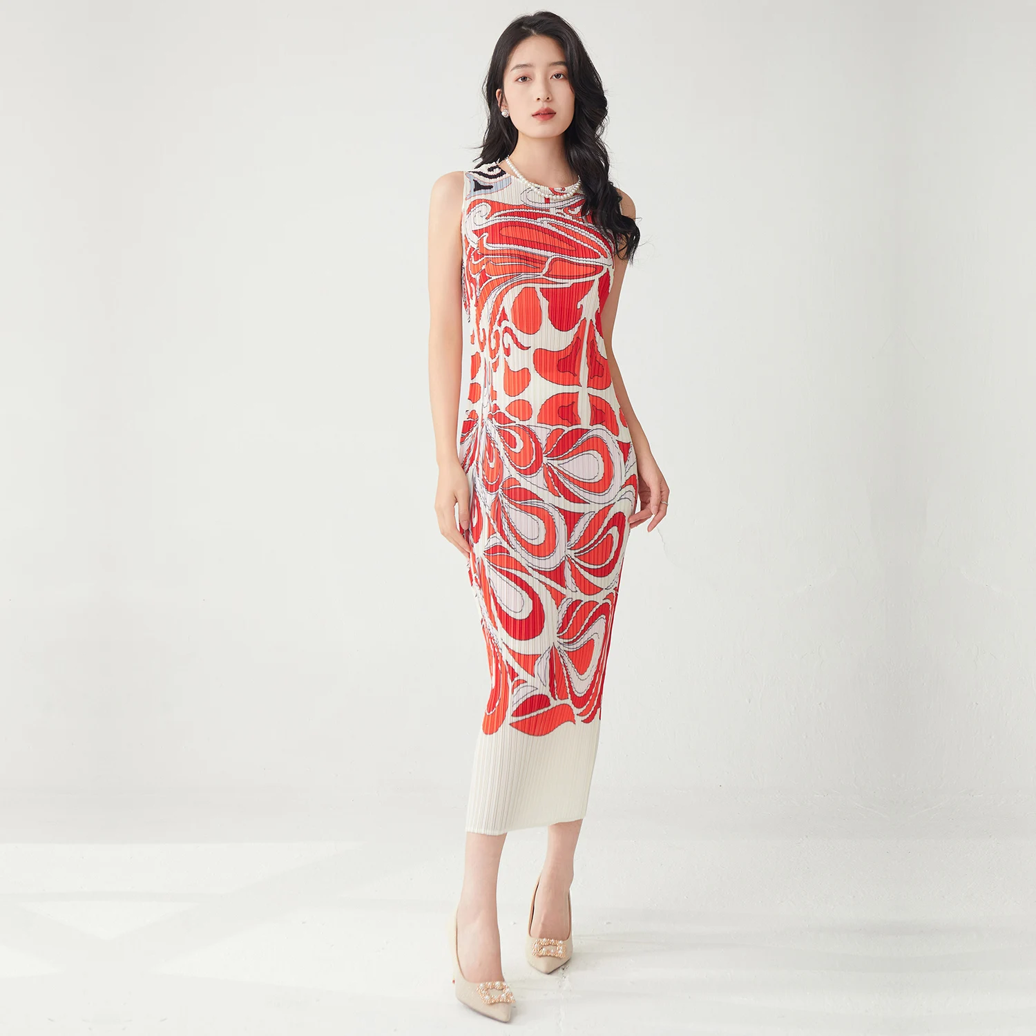 Summer Women Pleated Dress High Quality Printed Sleeveless Stretch Miyake Shift Dress