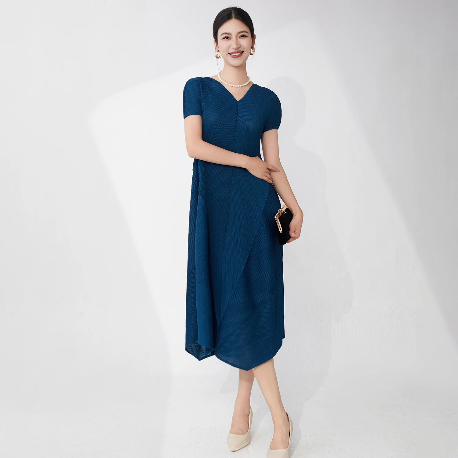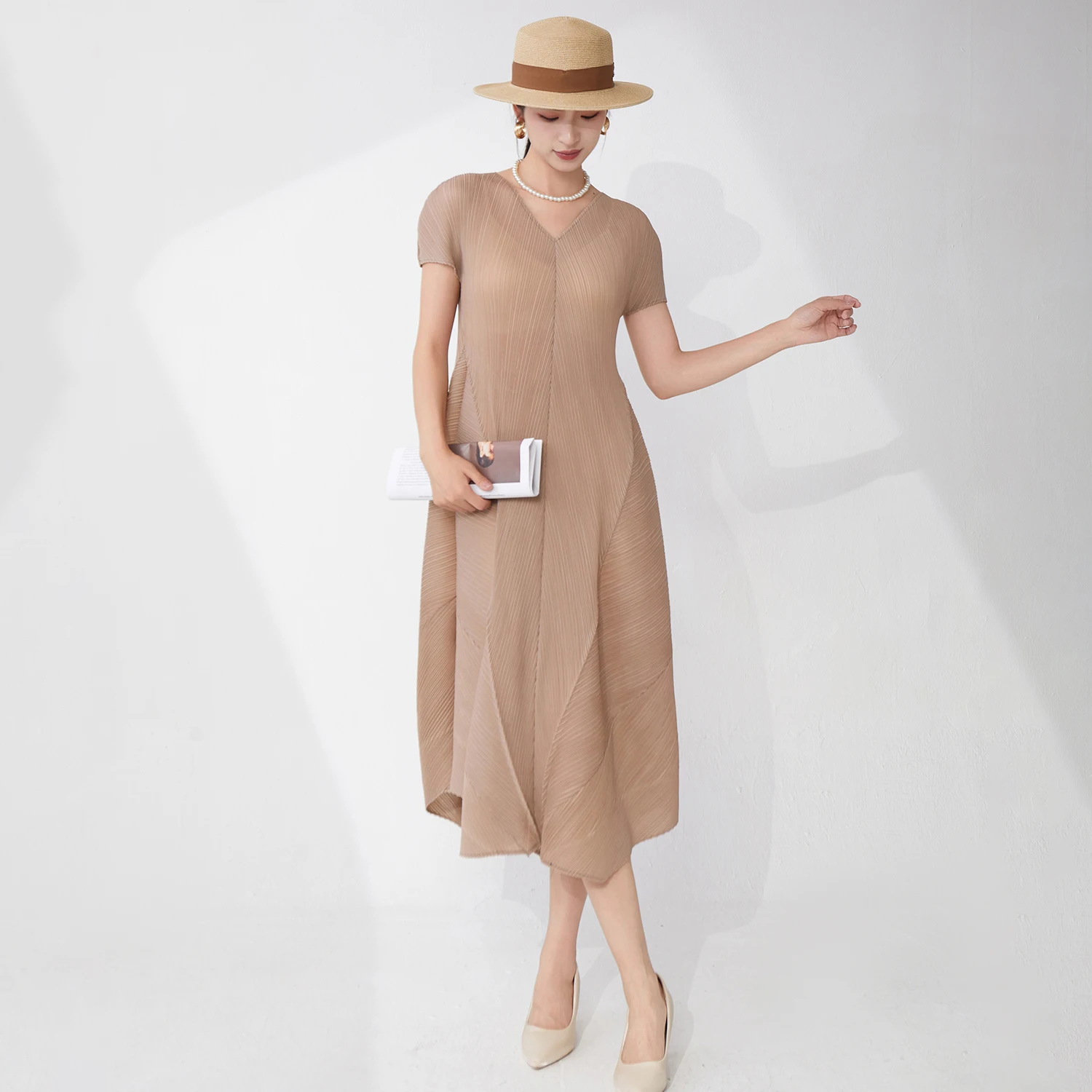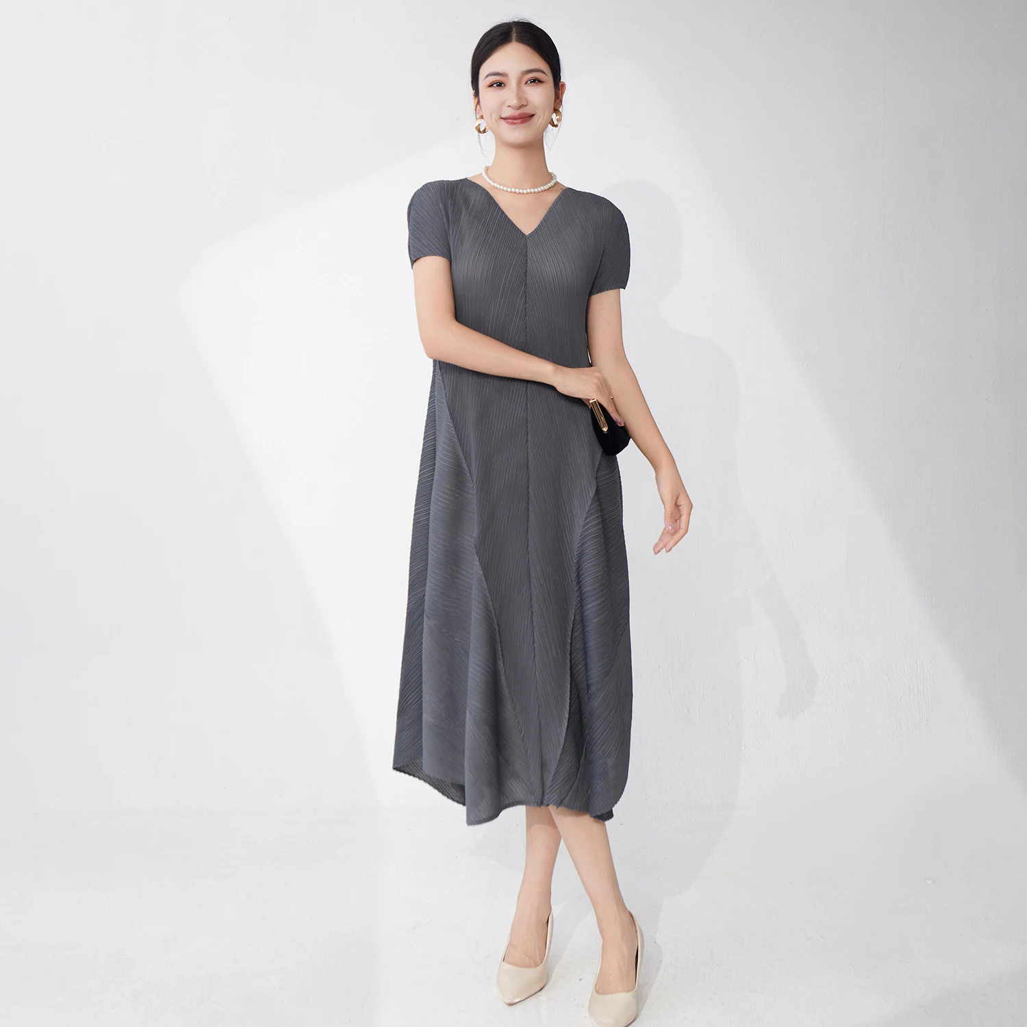 Summer 2025 New Women's Fashion Dress Loose Irregular Miyake Pleated Dress V-neck Casual Dress