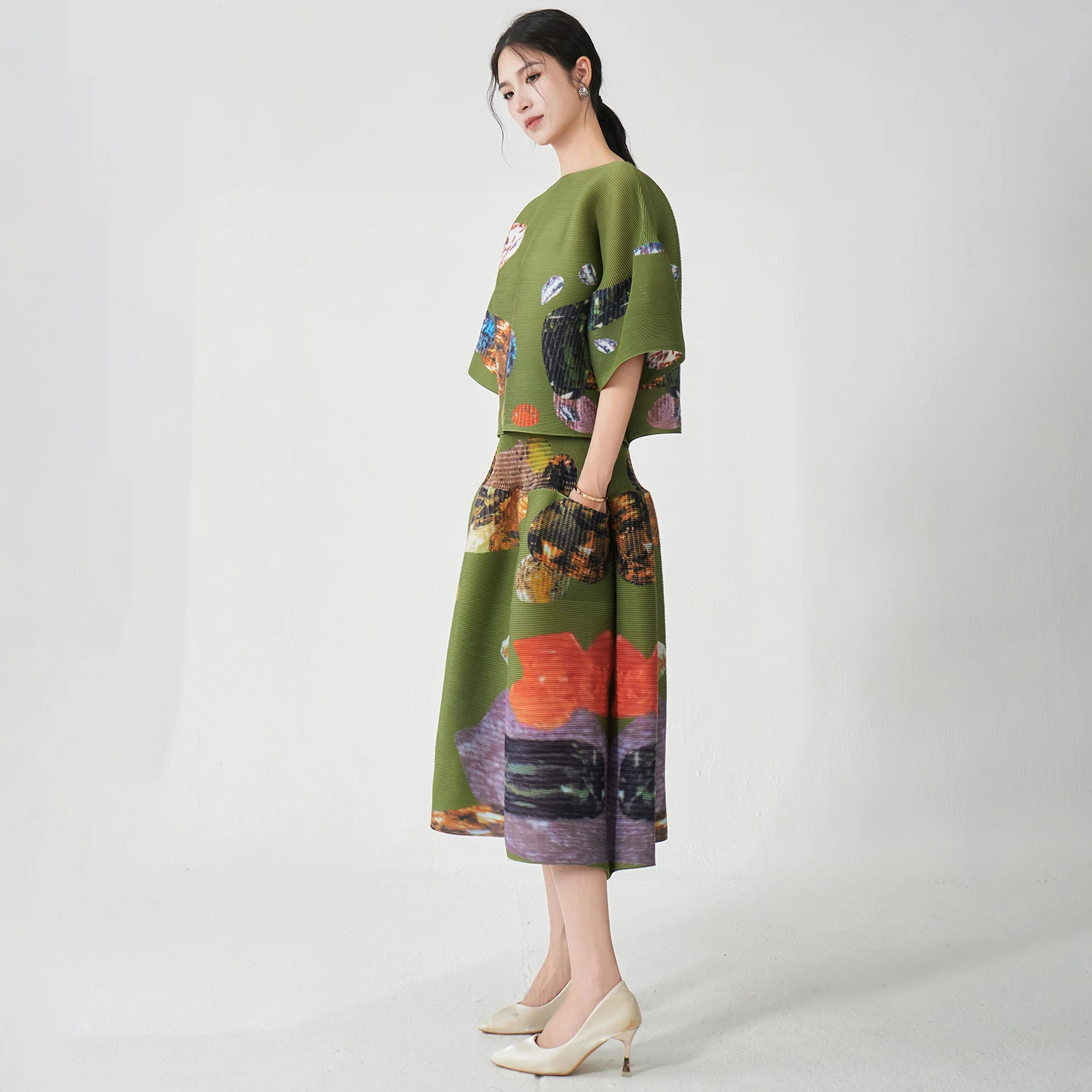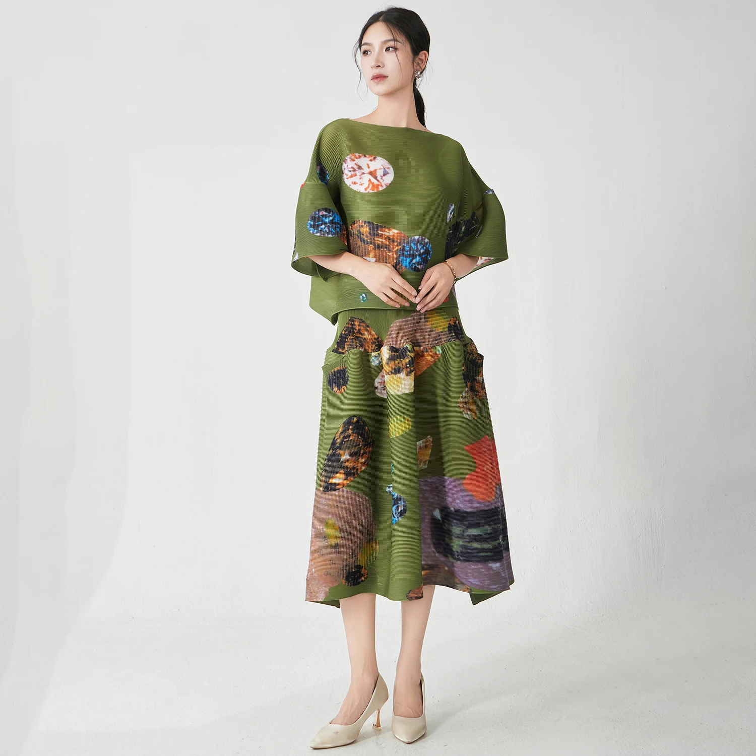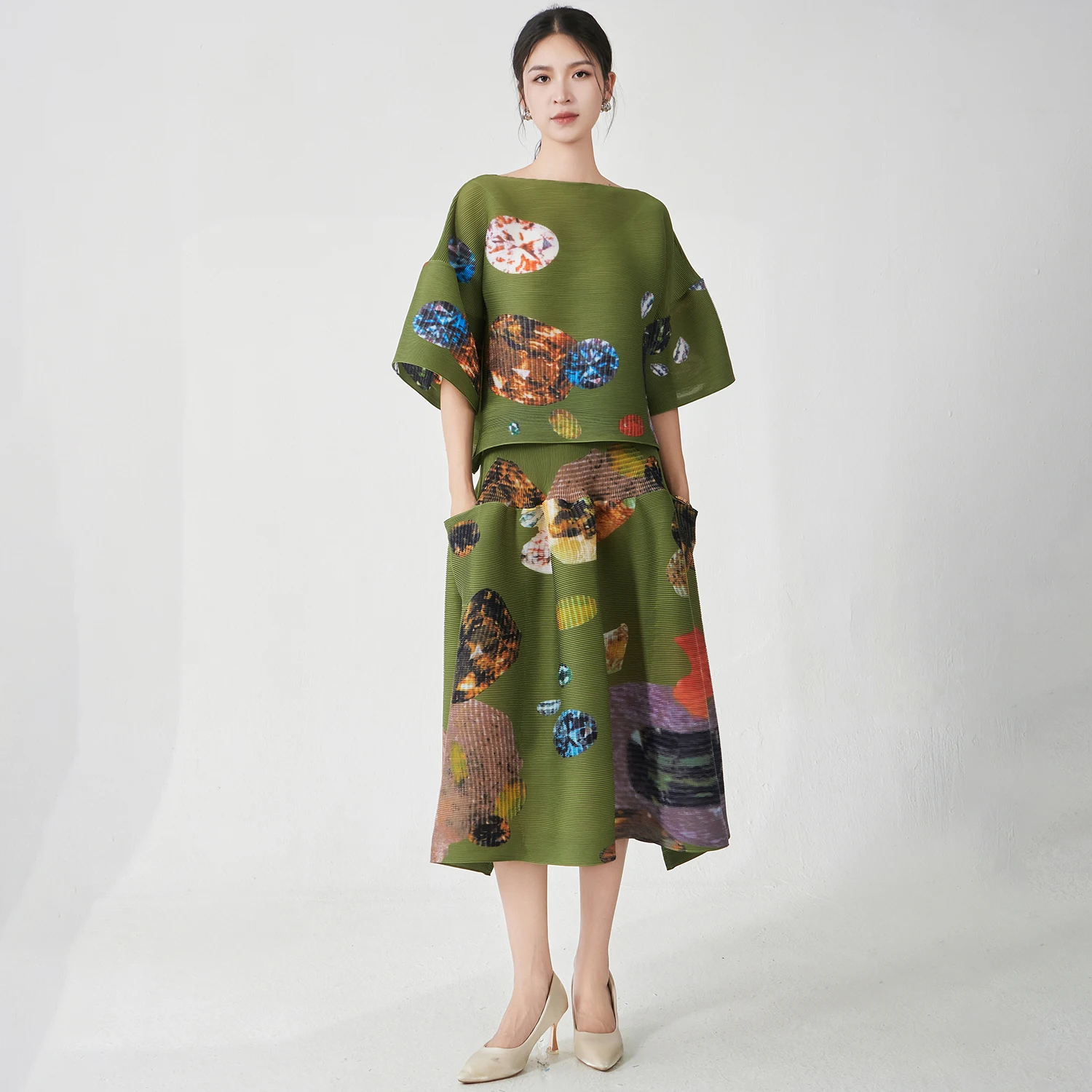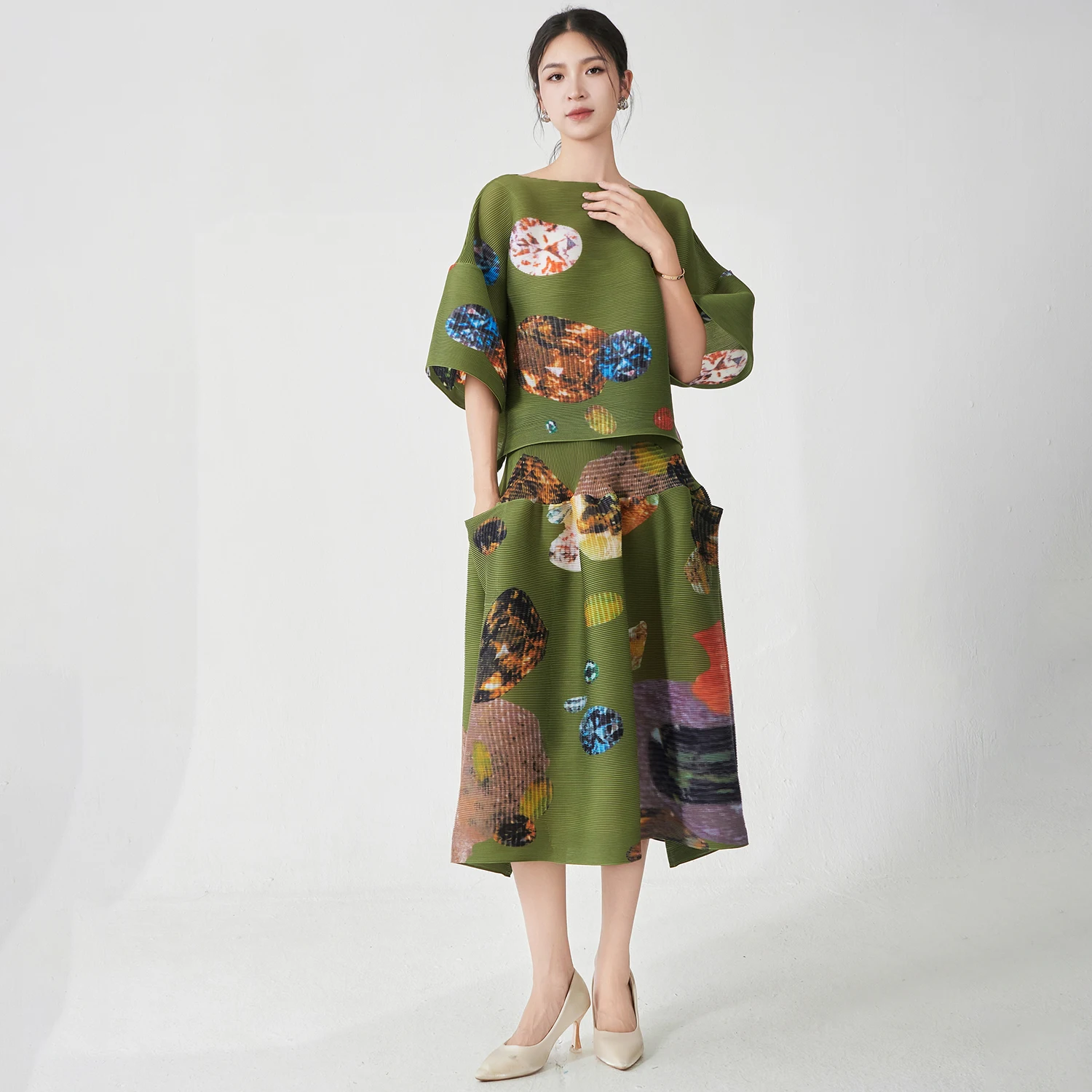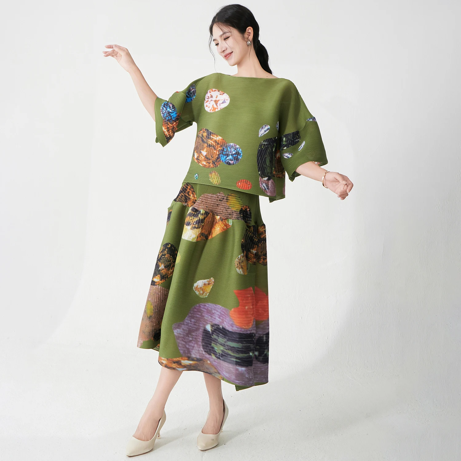 Fast and Fabulous Women's Elegant Set Stretch Loose Top and Skirt Set Designer Plus Size Pleated Print Two-Piece Set Polyester