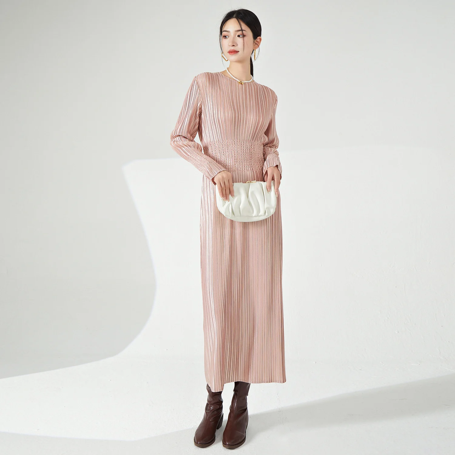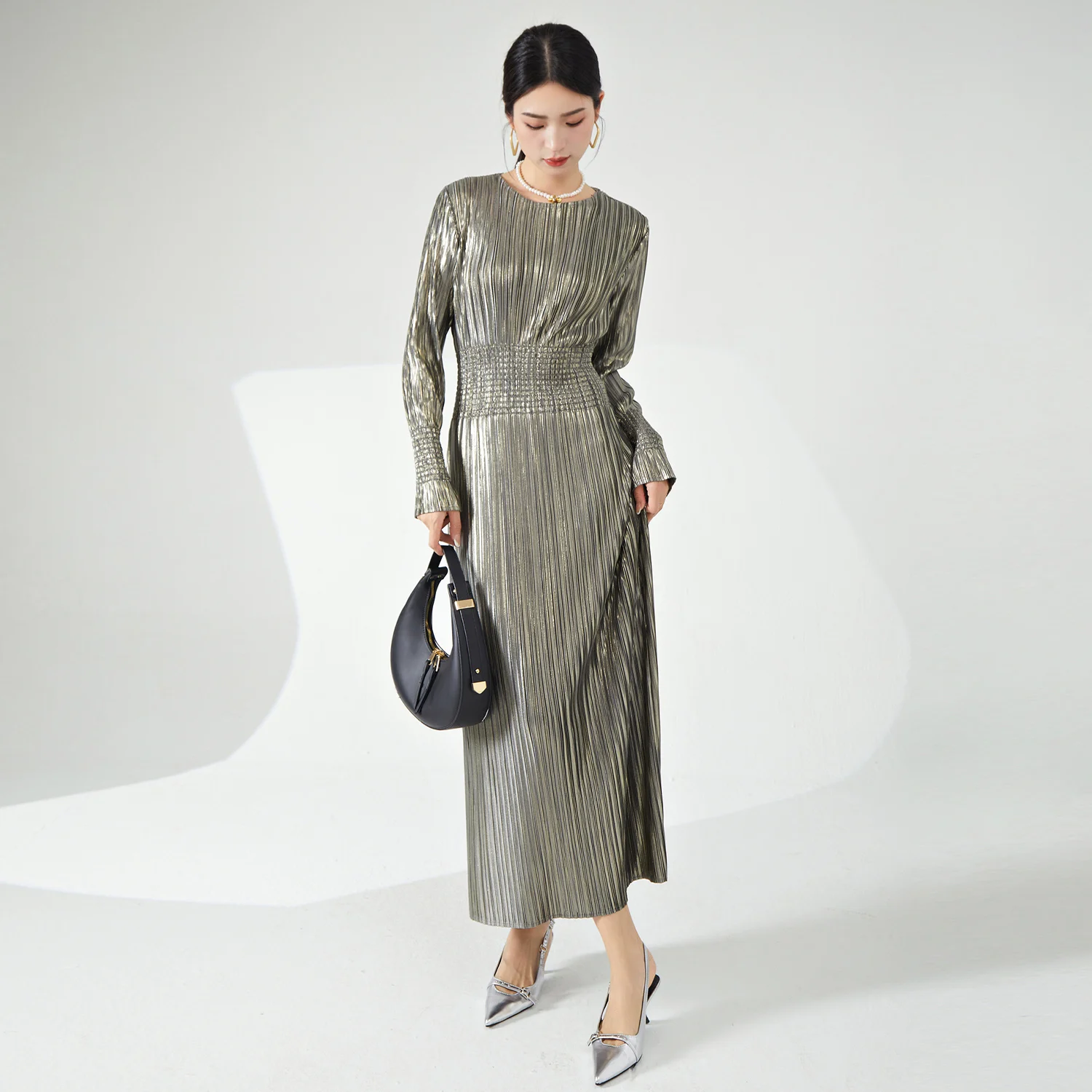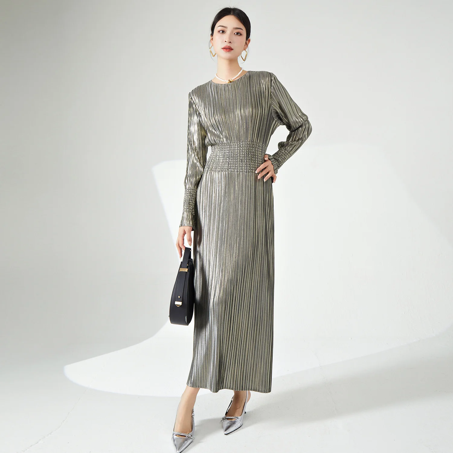 Miyake Pleated Women's Dress High Quality European and American Fashion Metallic Fabric Gorgeous Stretch Women's Evening Dress