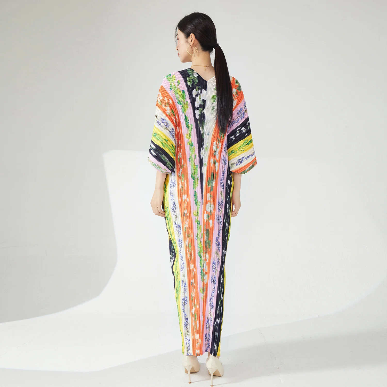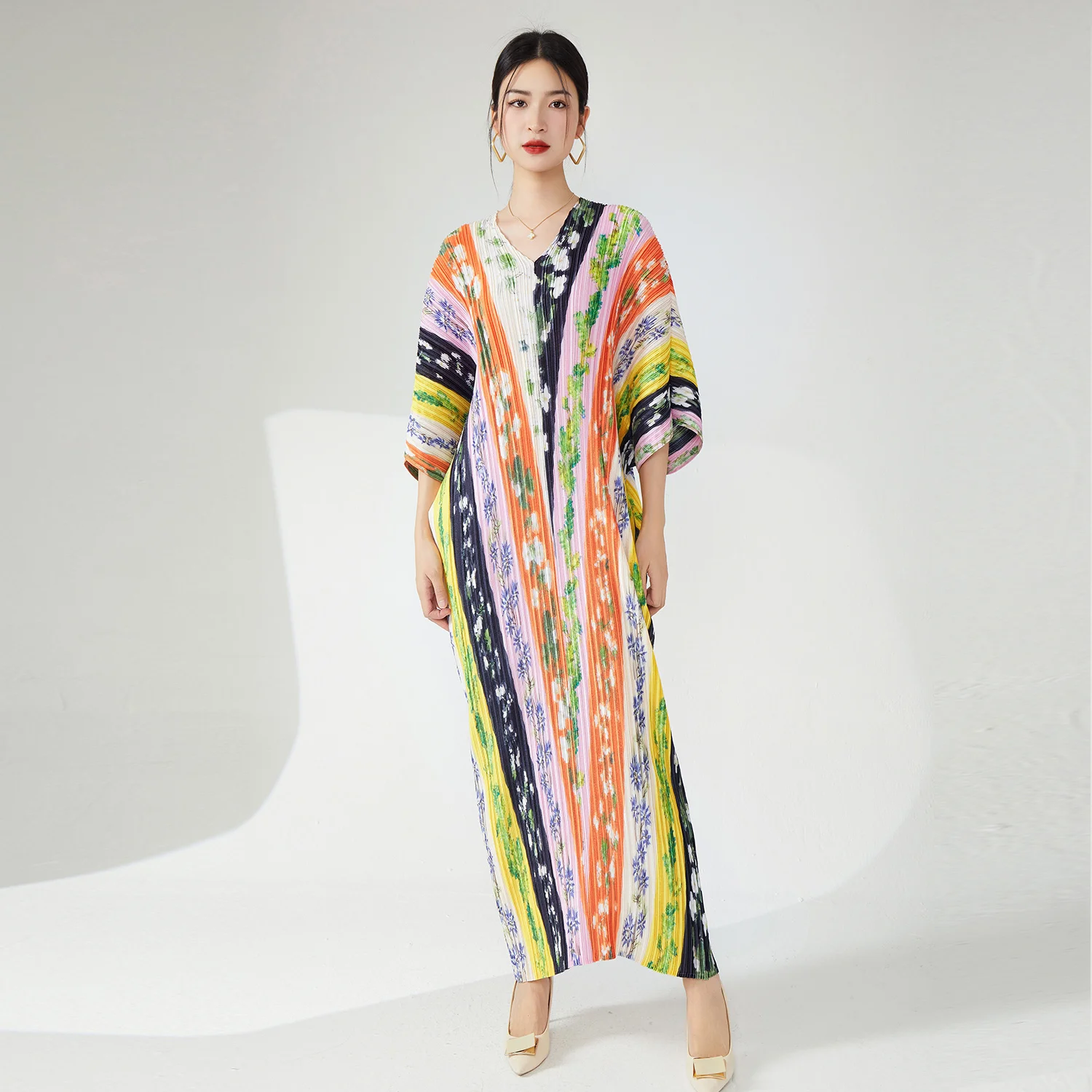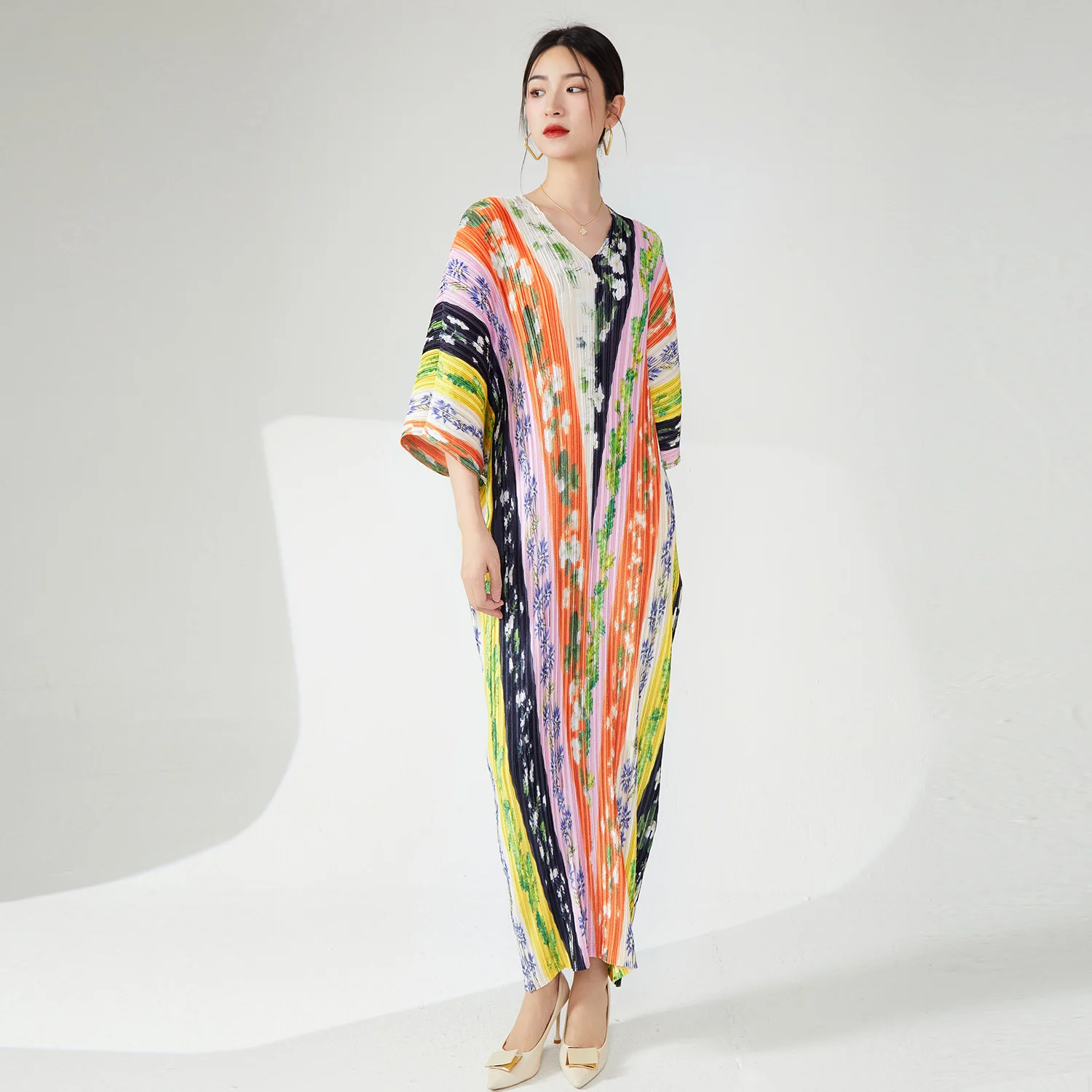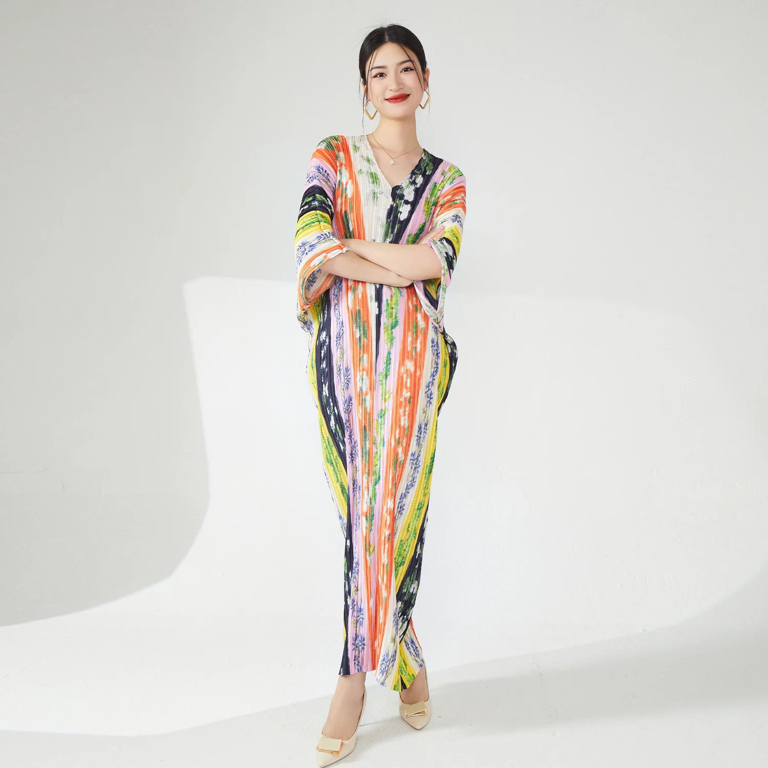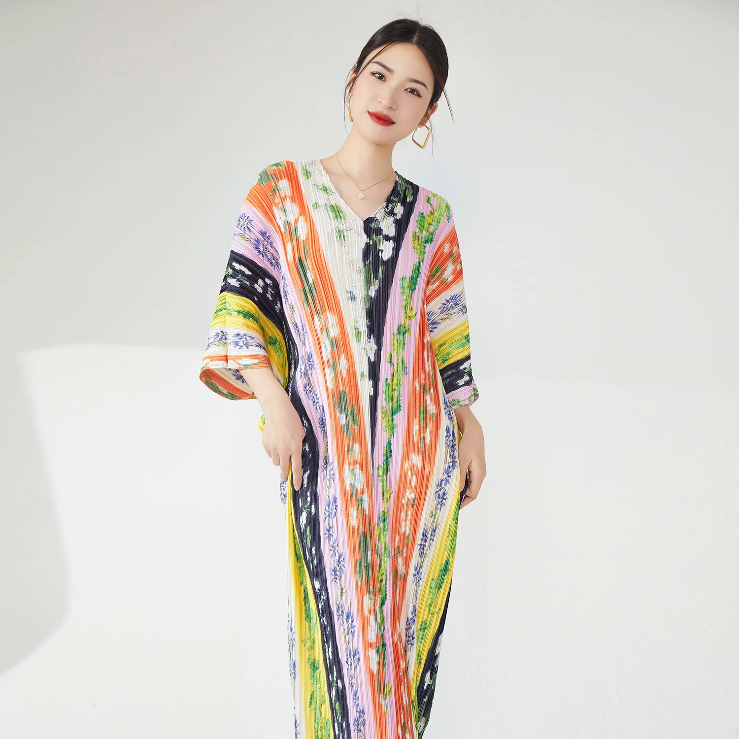 Stylish Women's Plus Size Dress High Quality Fabric Pleated Design V-Neck Bat Sleeve Casual Colorful Print Elegant Model Order