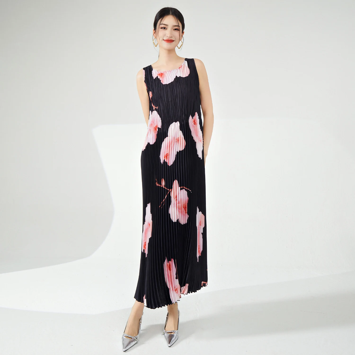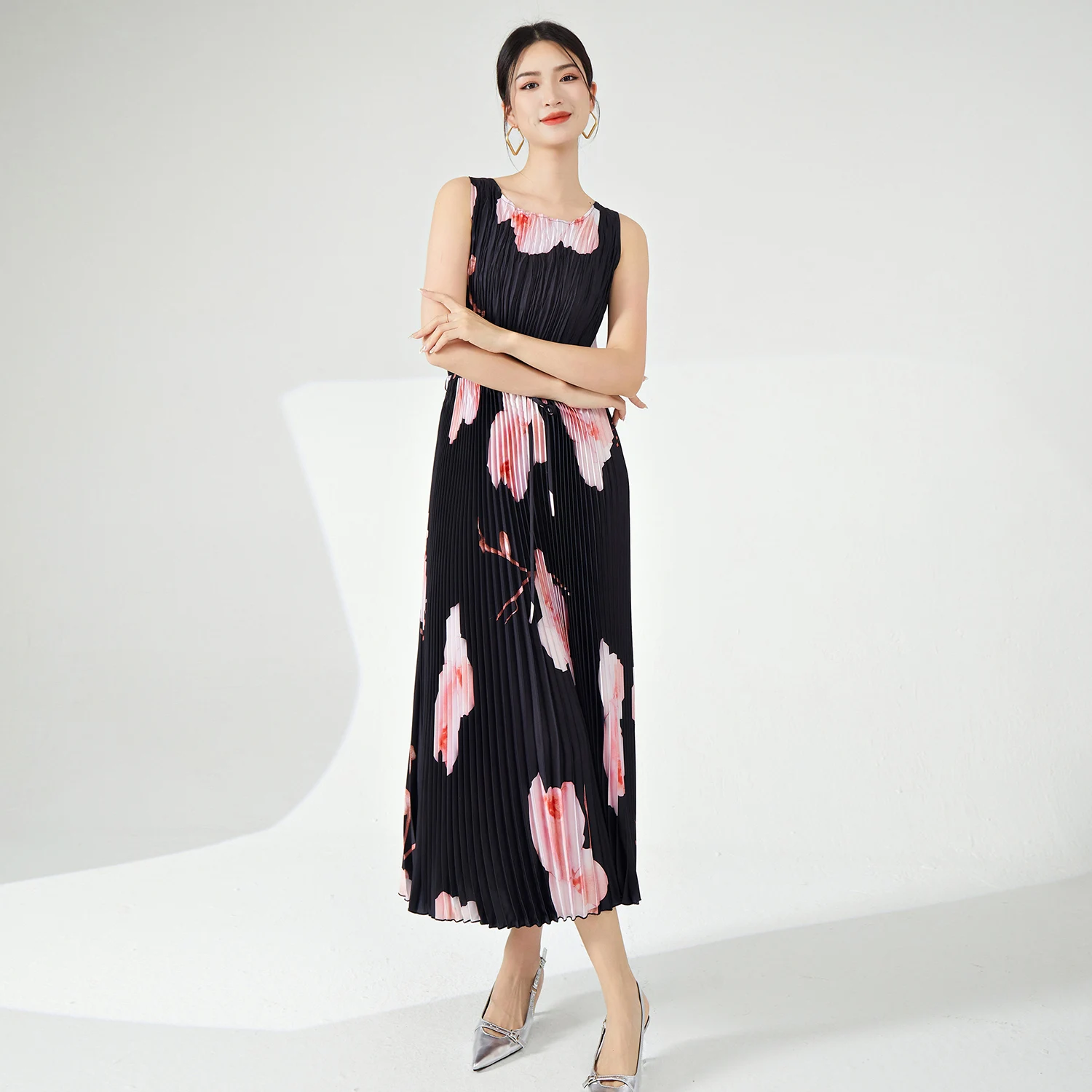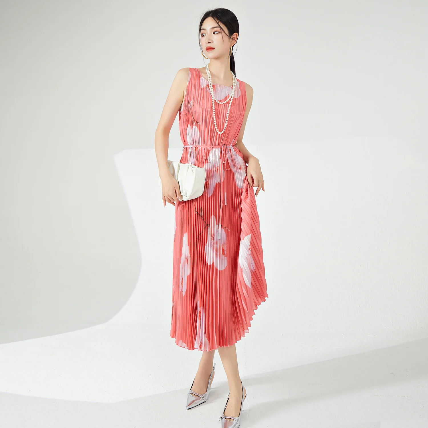 High Quality Summer Mid Length Women's Pleated Dress Sleeveless Stretch Fabric Printed Casual Style ODM Supply Woven Fabric