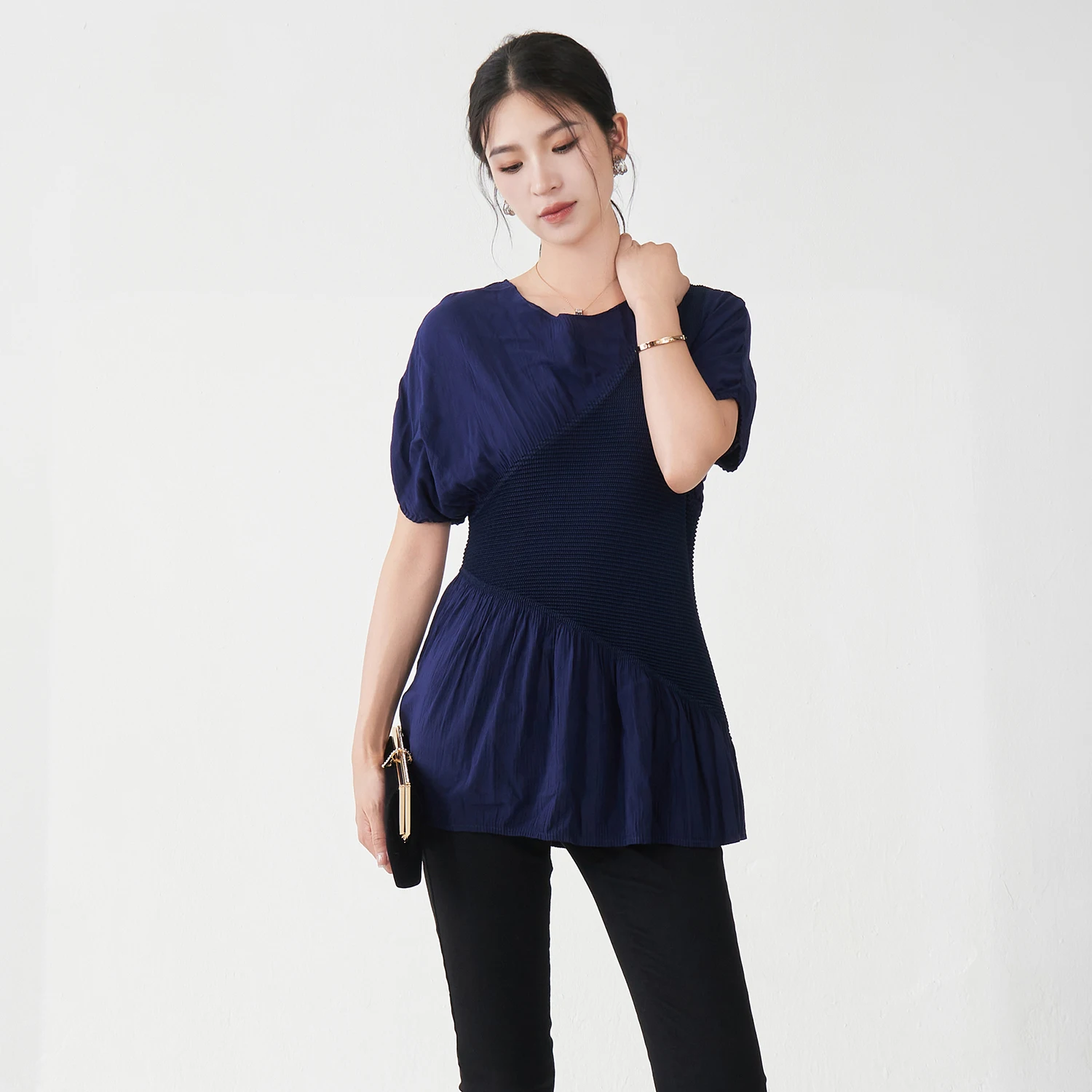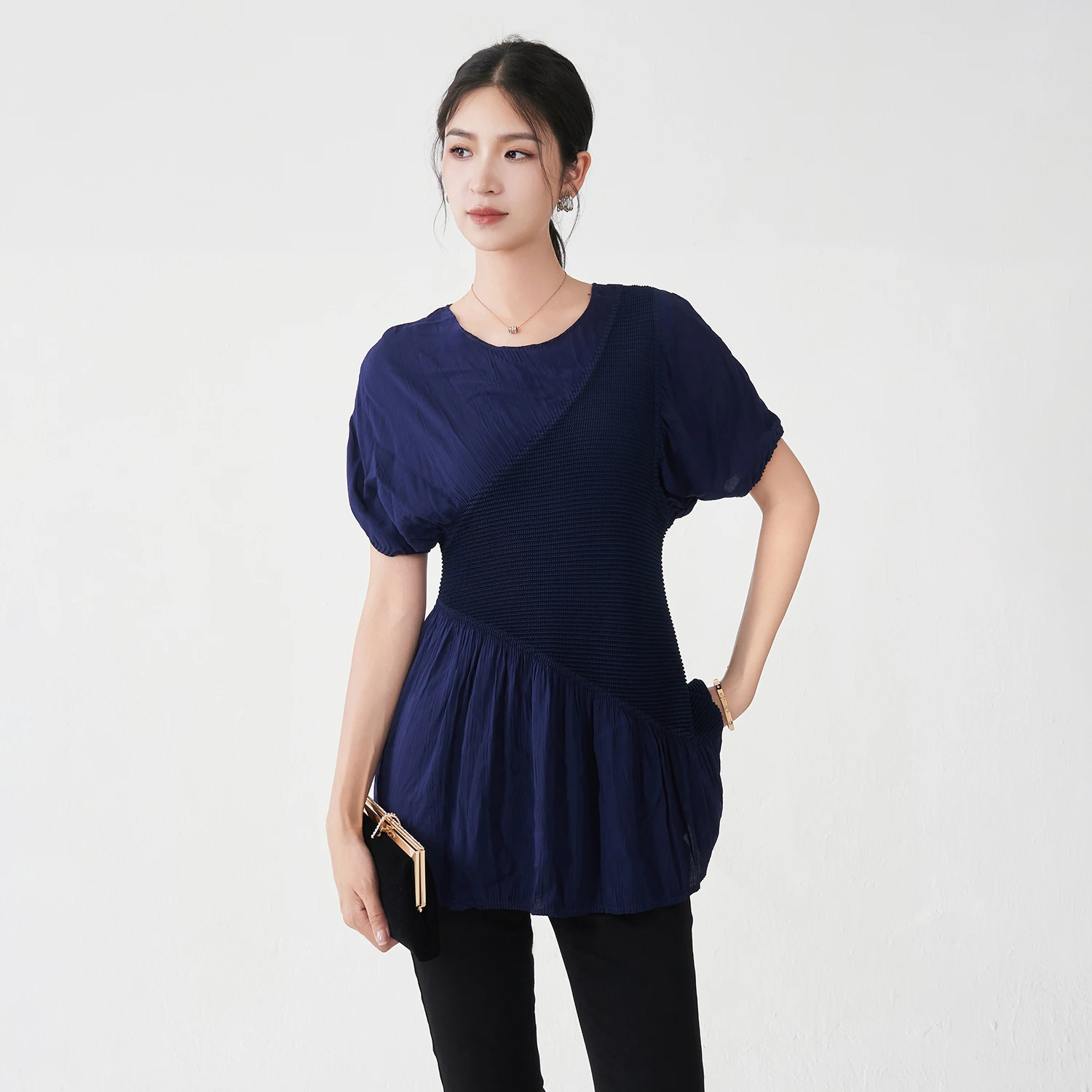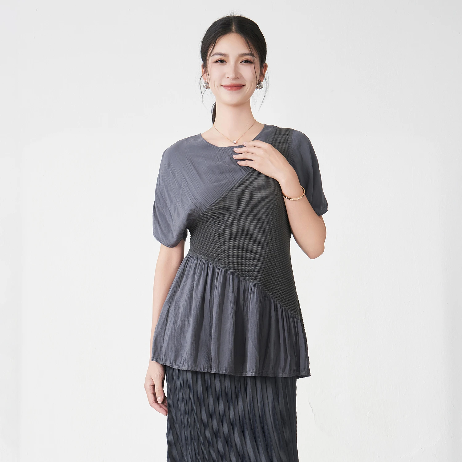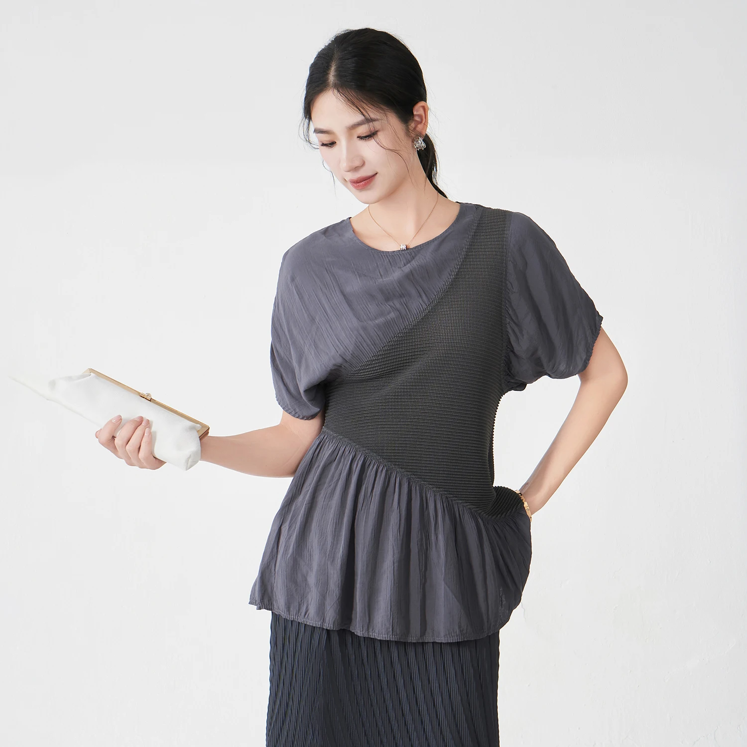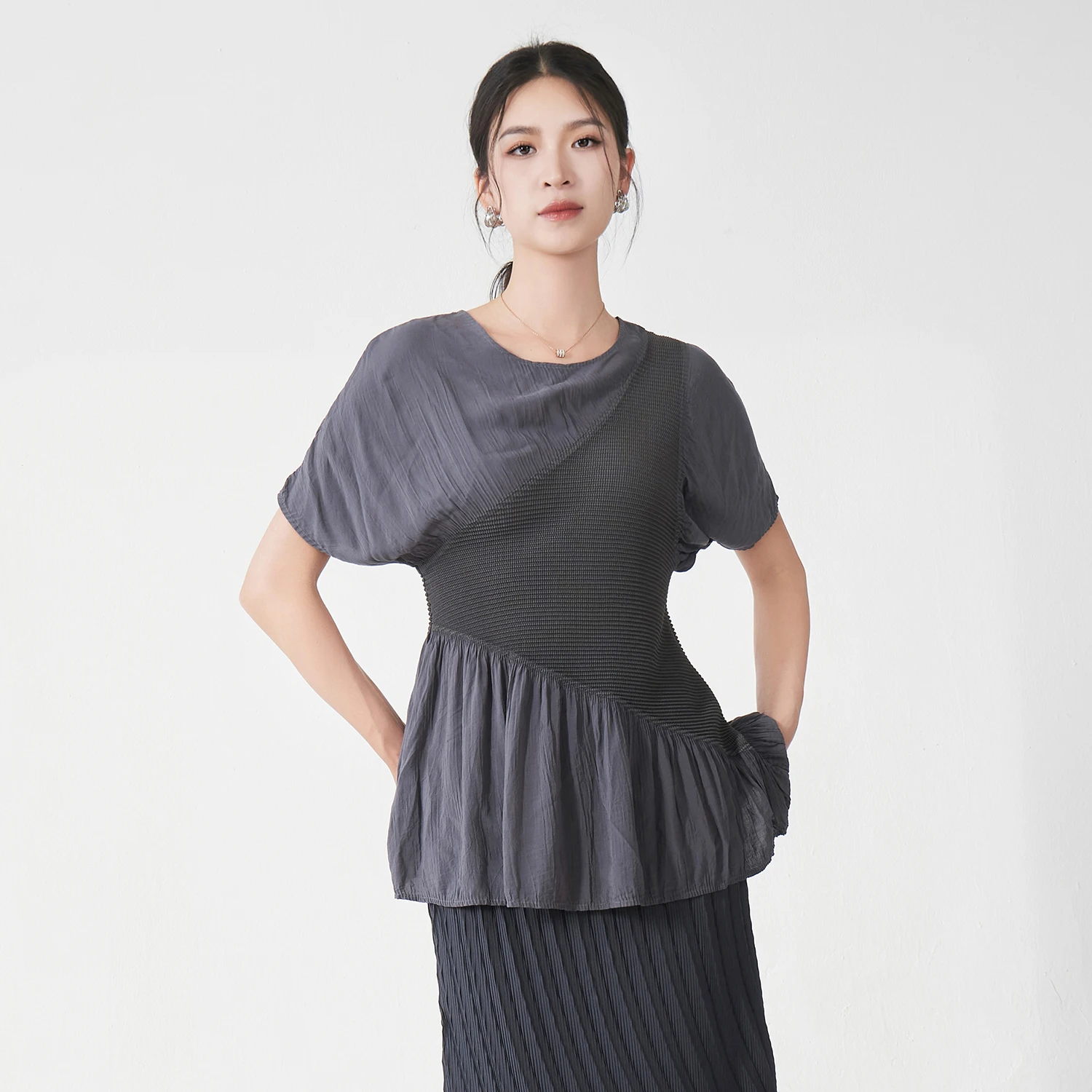 New Arrival 2025 Women's Elegant T-shirt High Quality Stretch Solid Color Short Sleeve Top Miyake Pleated Top