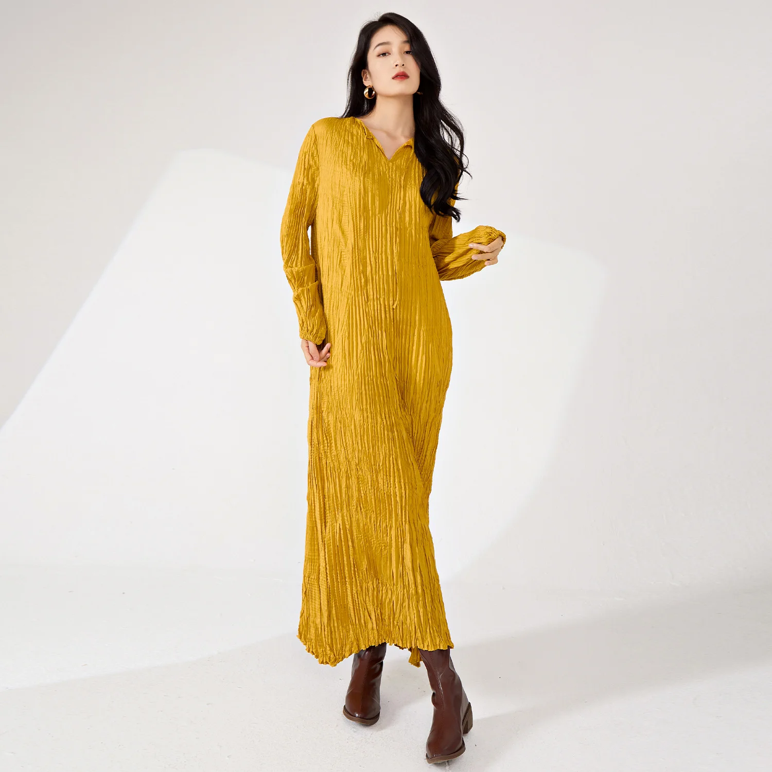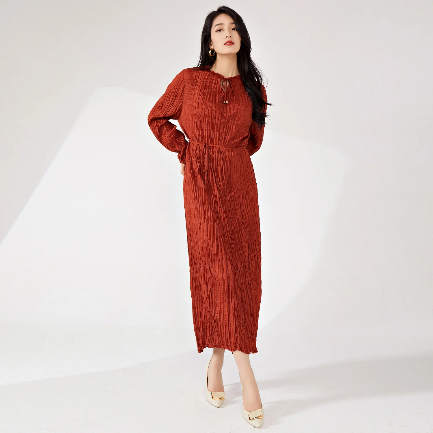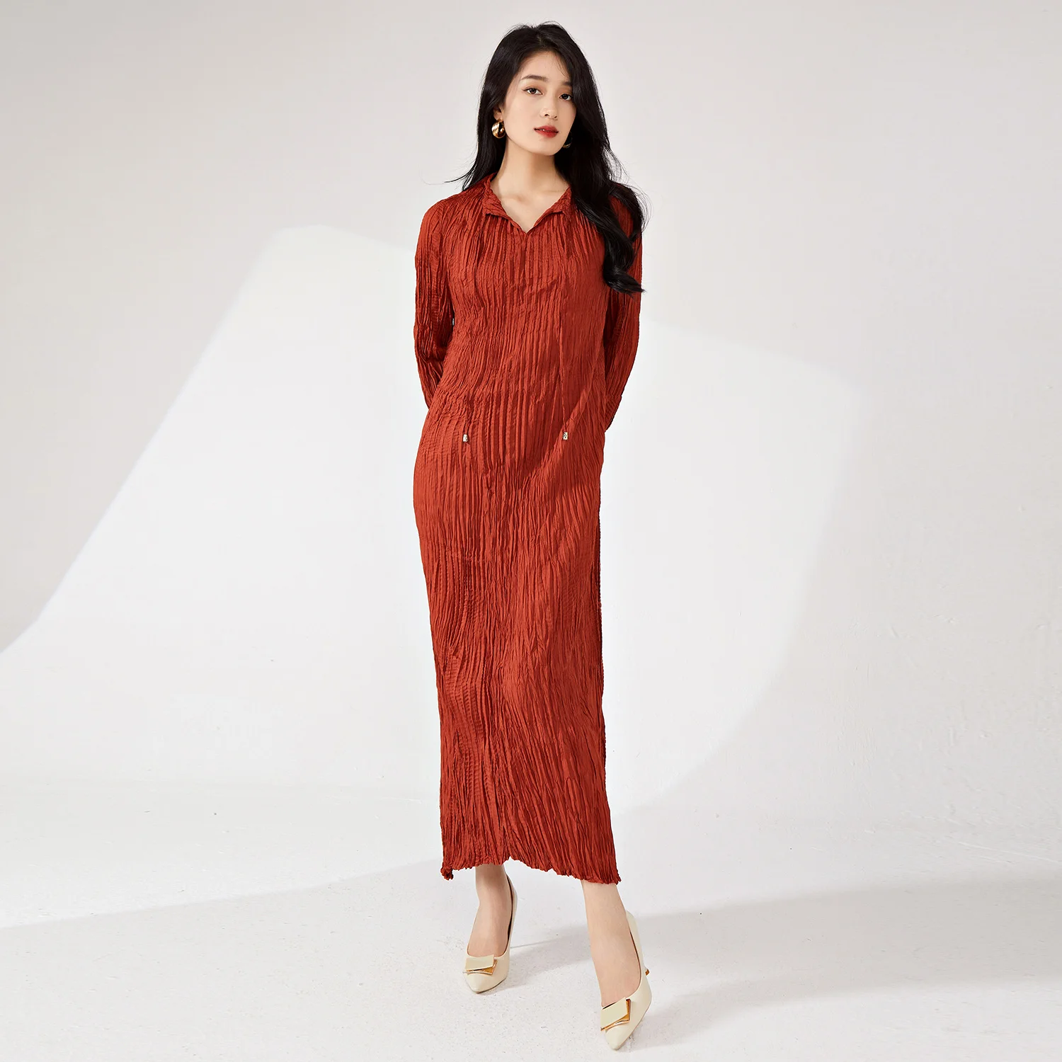 2025 Latest Women's Summer Midi Dress Personalized Stretch Pleated Design With Print Collar Drawstring Sashes Natural Waistline
